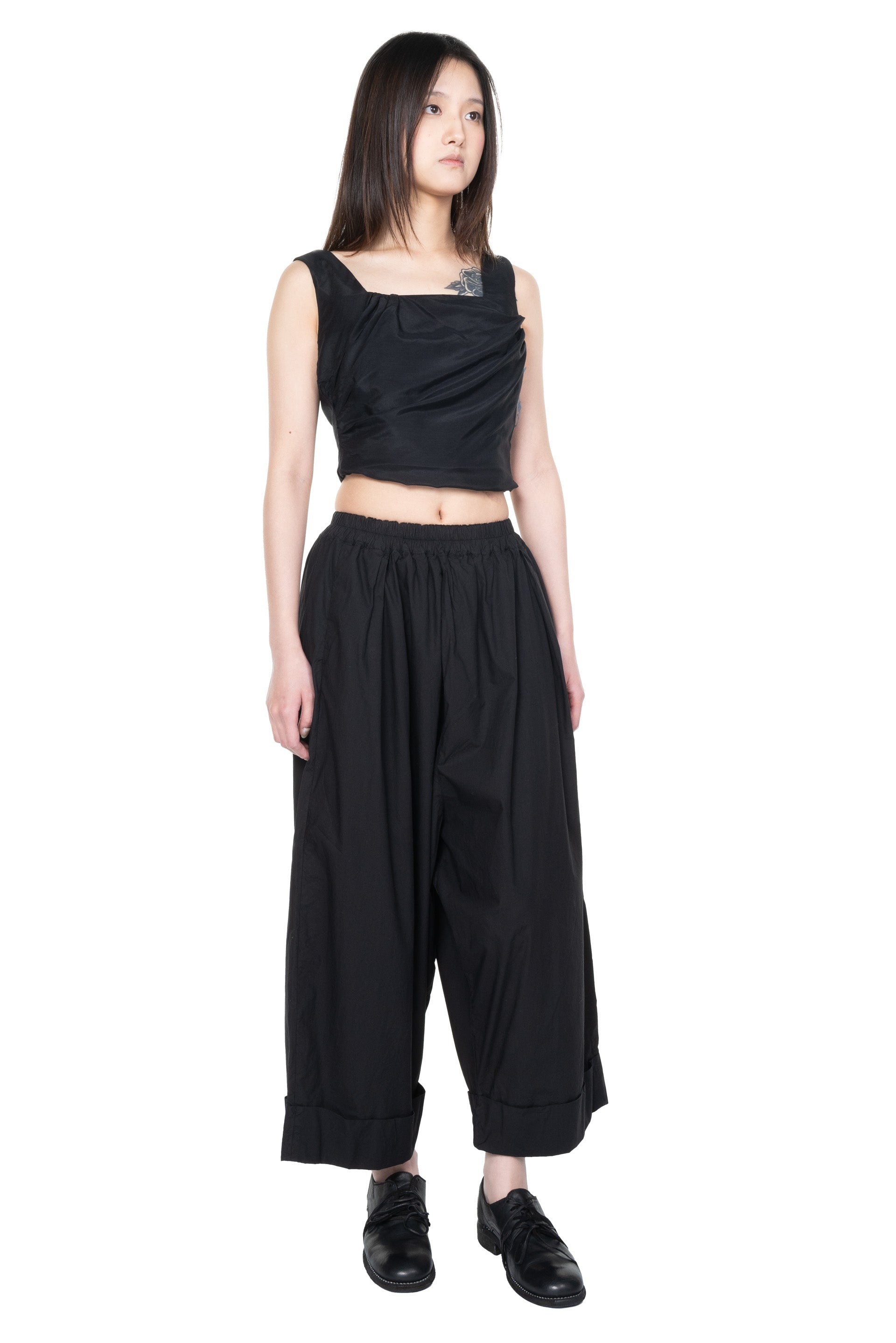 Button closure at waist. Two side pockets. Wide fit. Pleats at front. Pocket at back. Turn up at bottom.