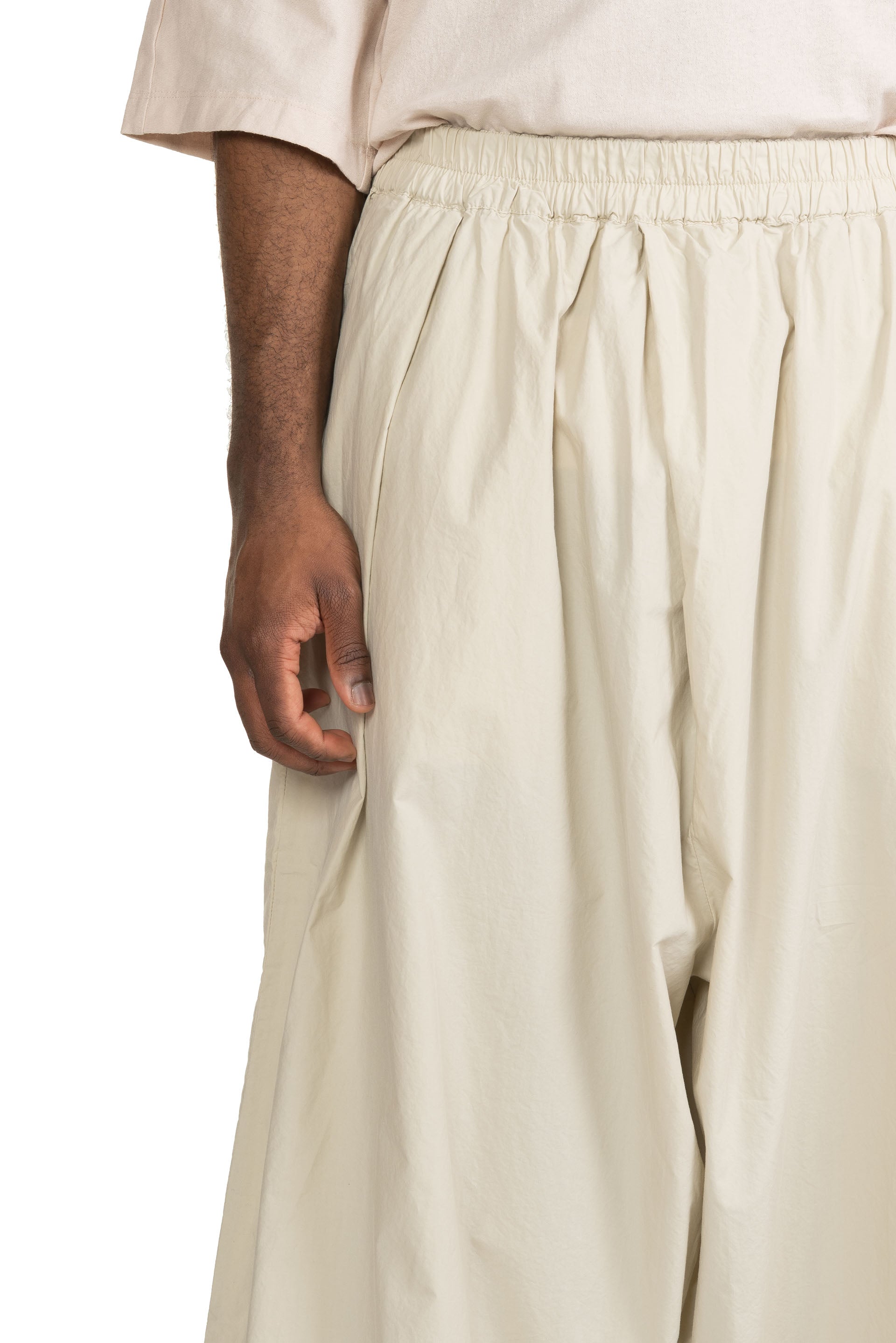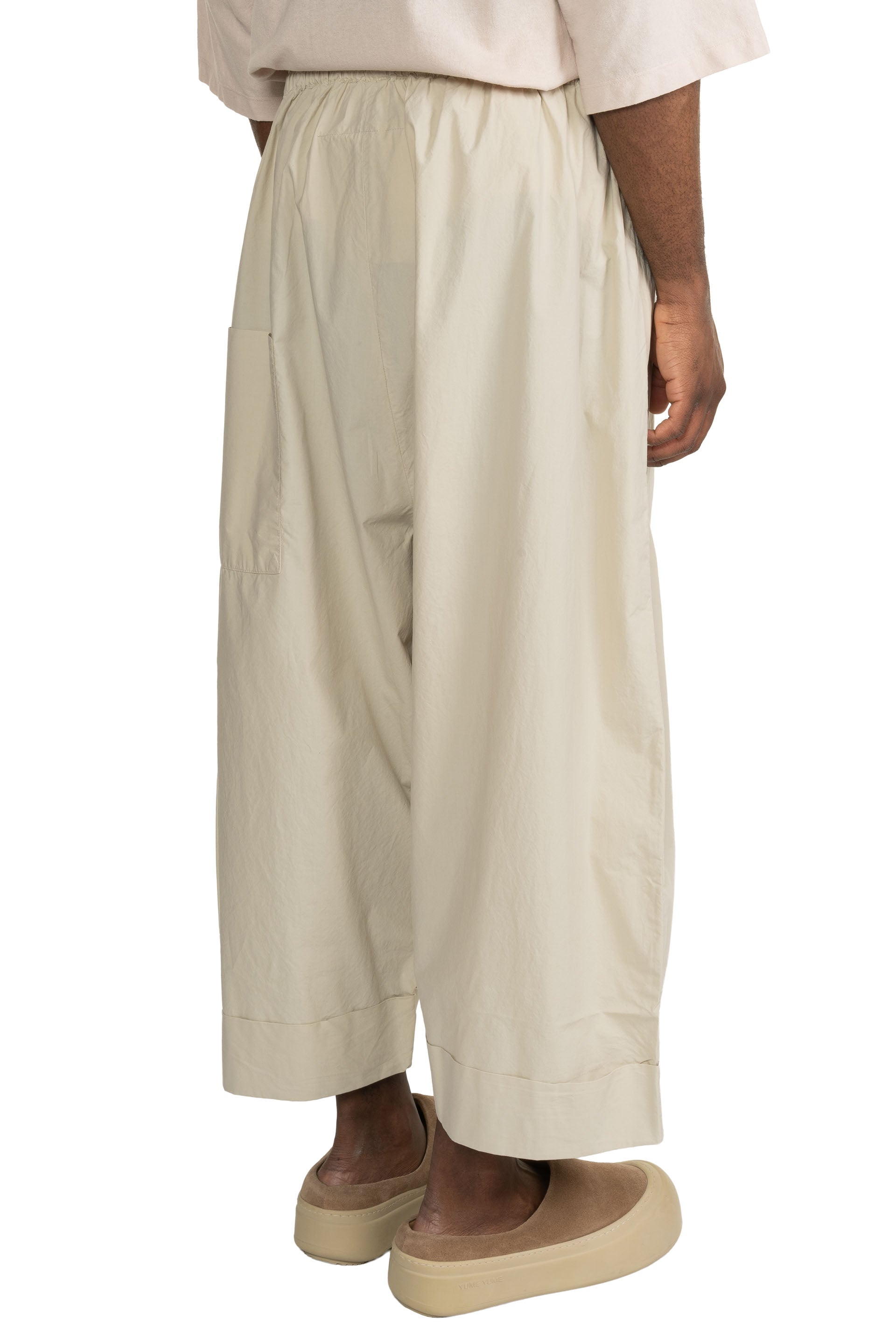 Toogood Baker trousers made in lightweight crisp cotton poplin and garment dyed in porridge colour. Cropped. Wide leg trouser with front pleats. Deep turned-up cuffs. Low back patch pocket. Hidden side pockets. Elasticated waist.