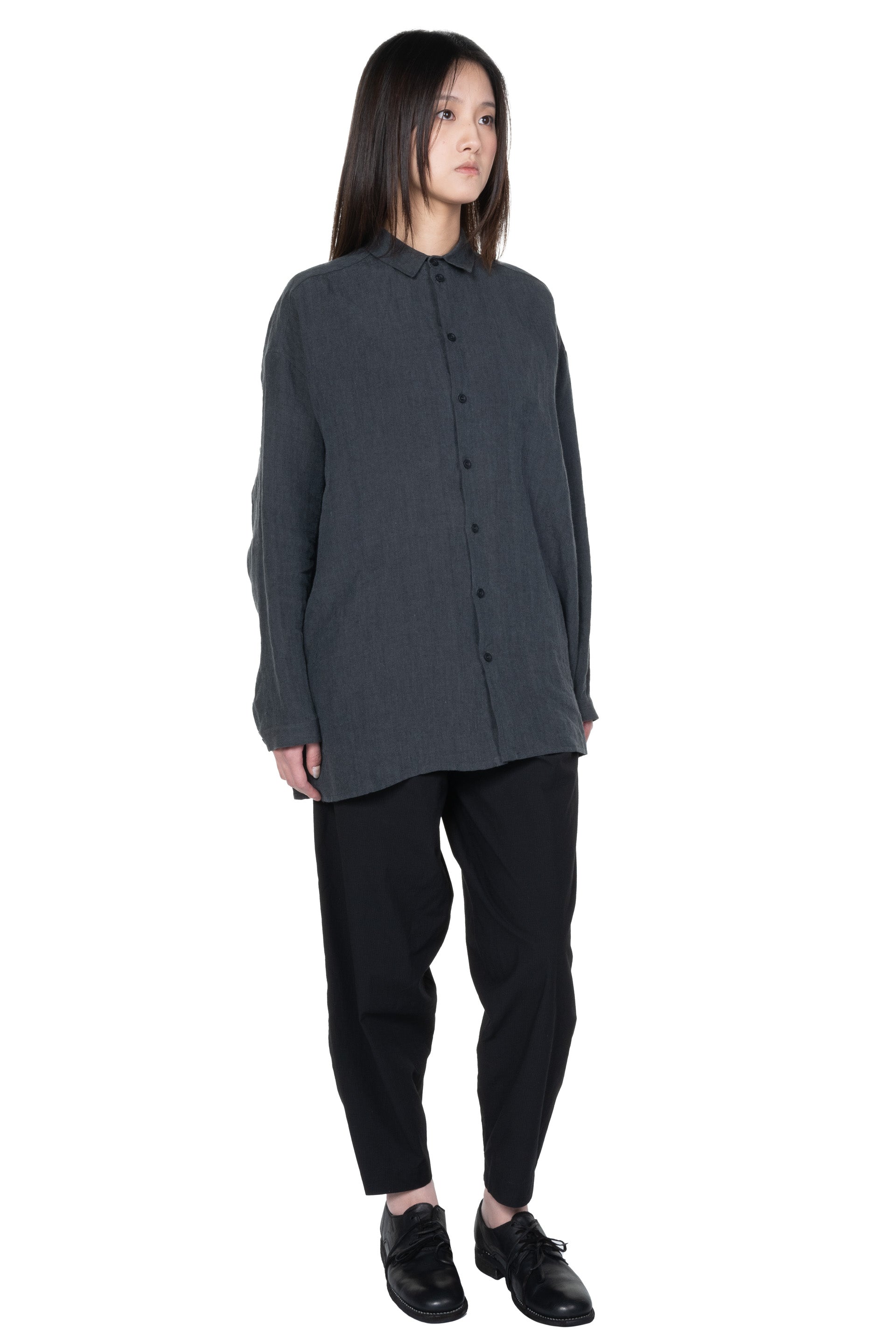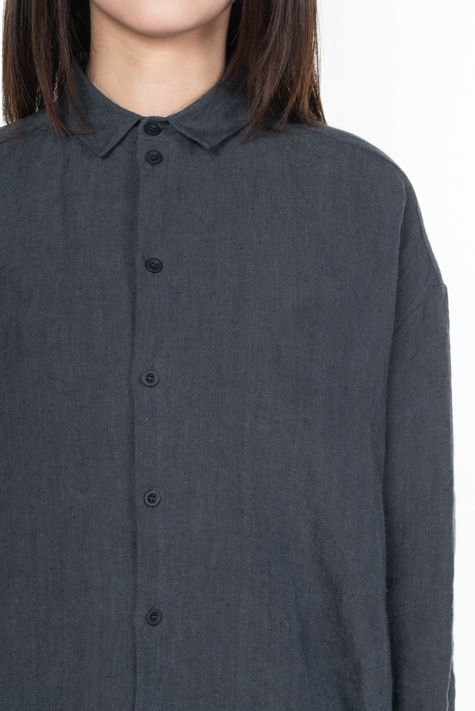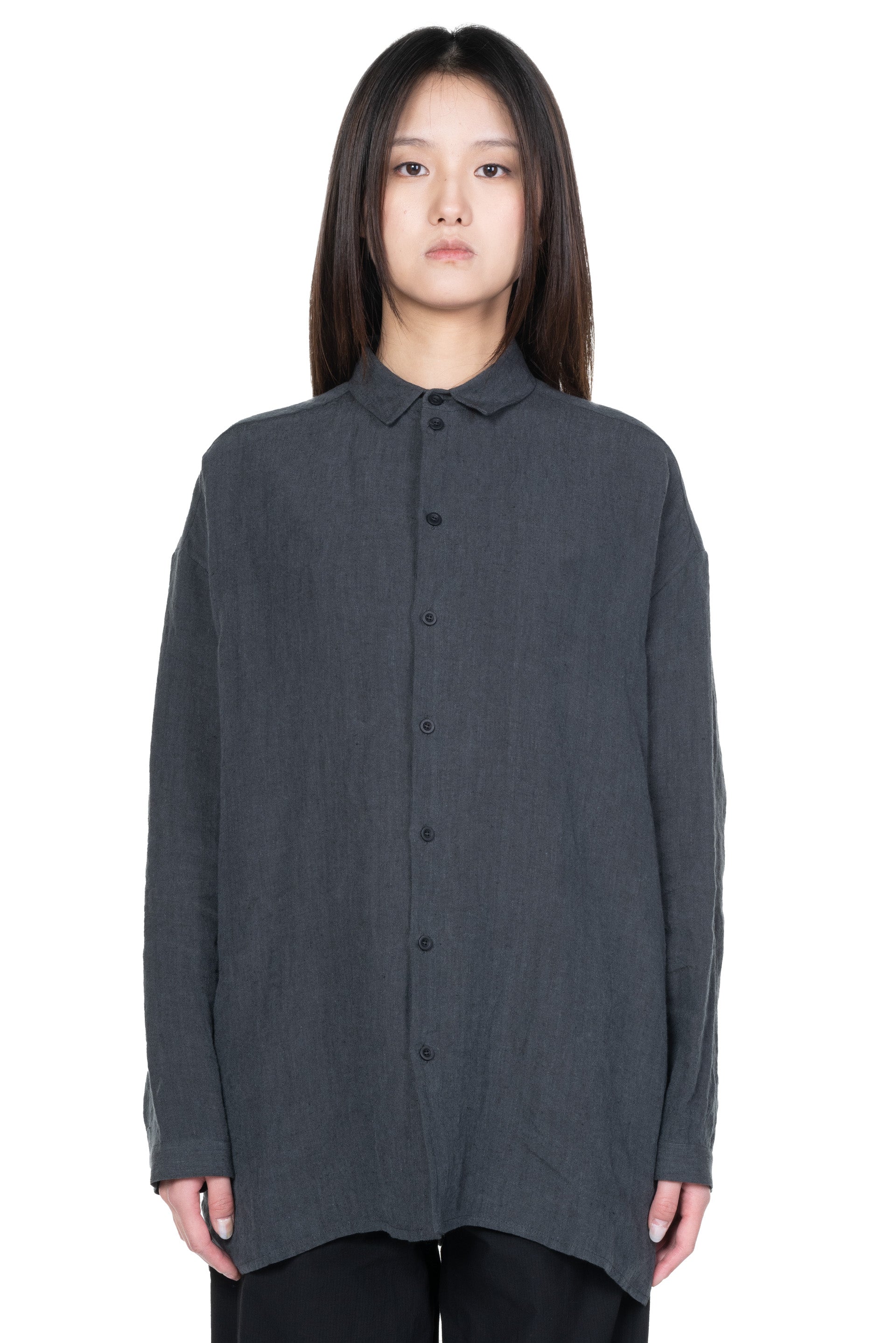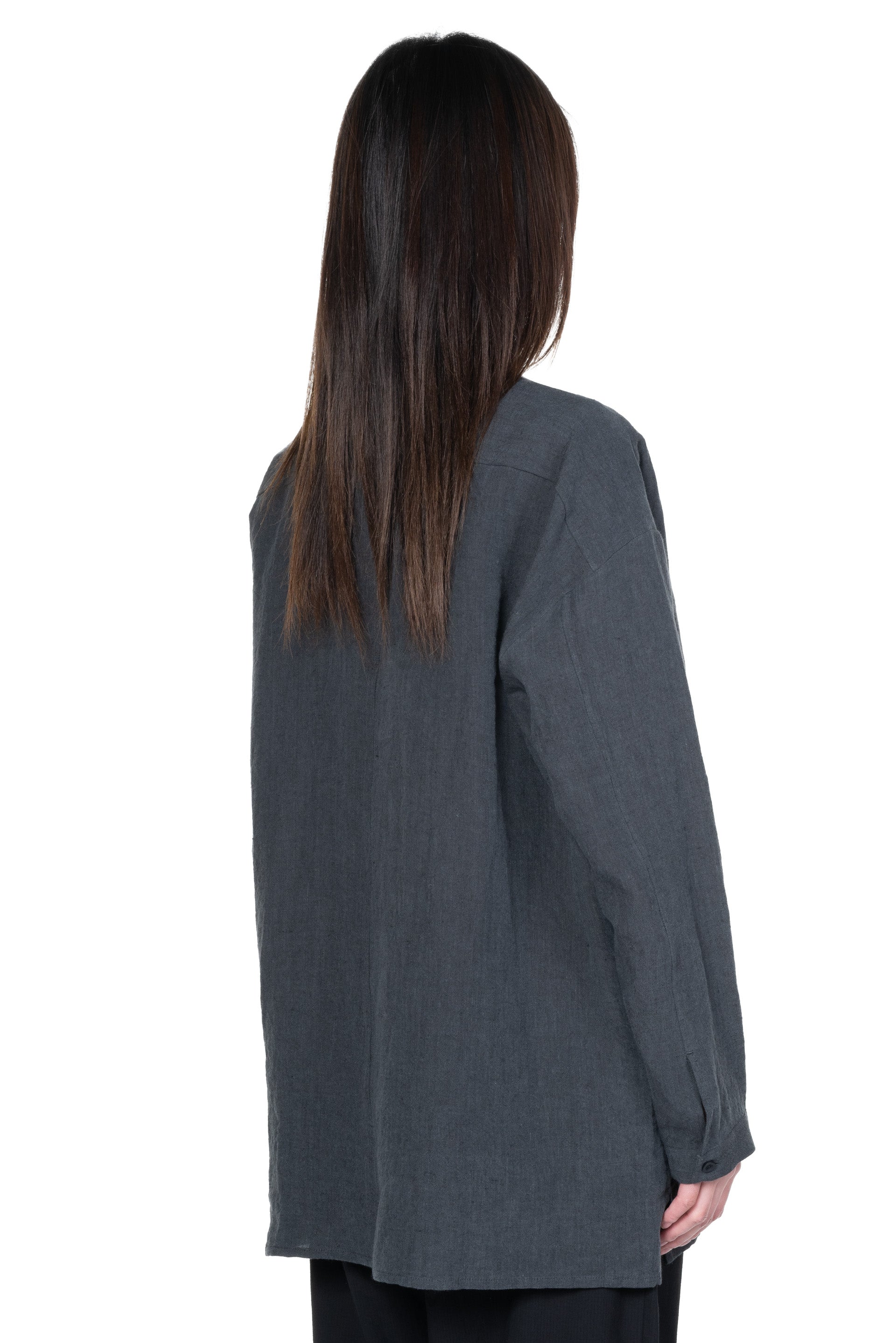 Long sleeves. Button closure at front. Buttons at cuffs. Slit at sides. Boxy fit.