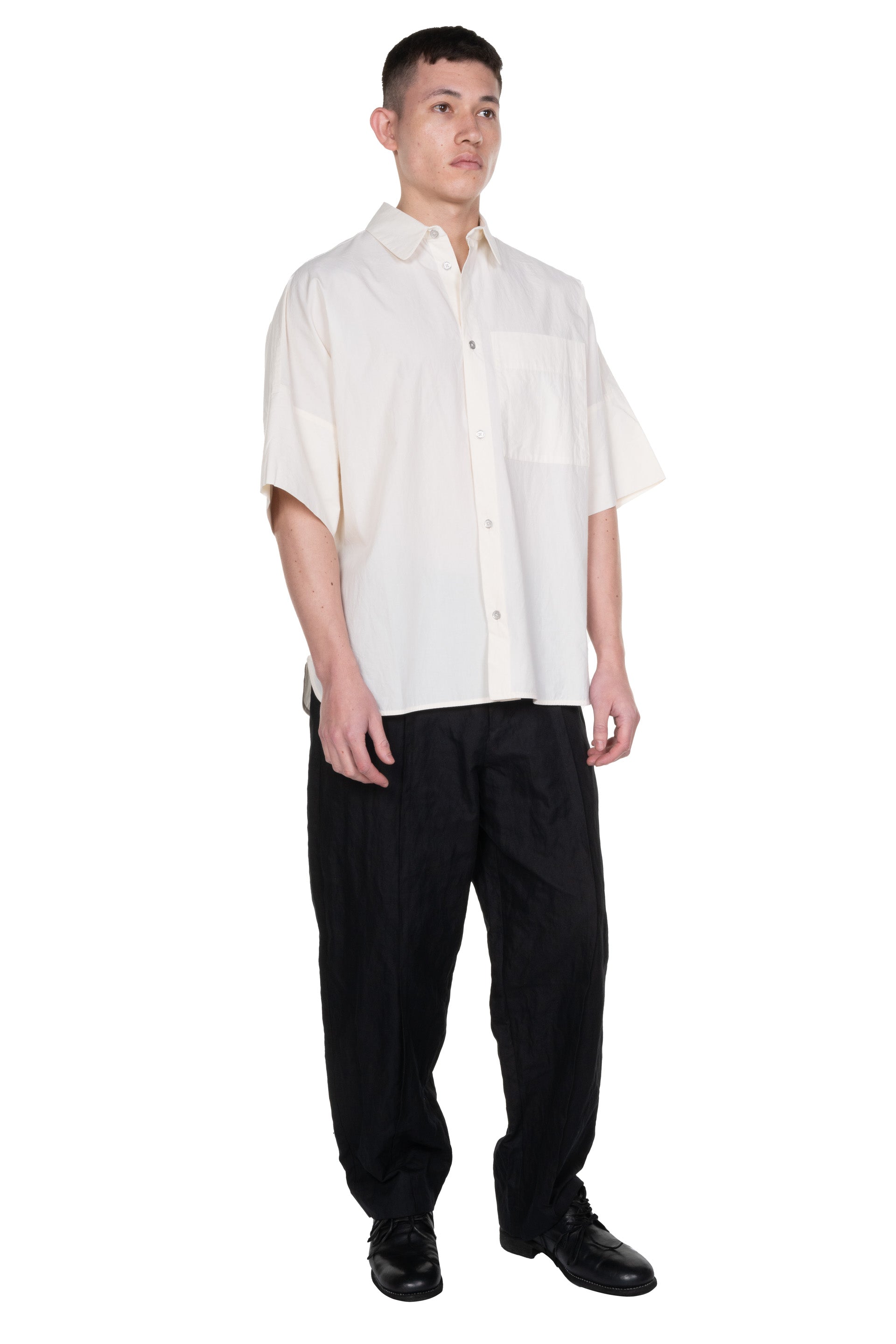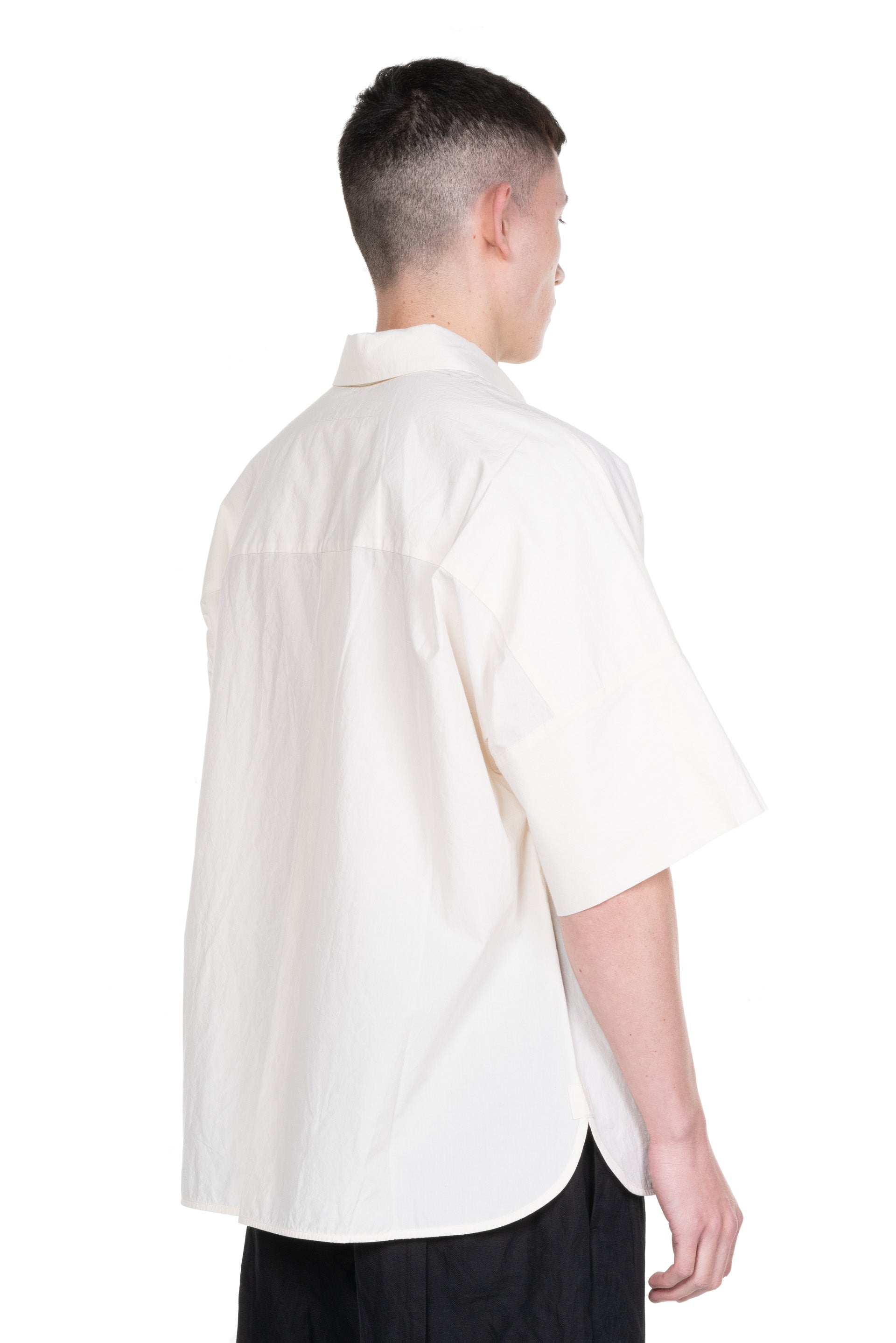 The Tinker Shirt is a bold shirt with lots of volume. Large single pleat at the back yoke. Generous curved hem. Grown-on short sleeves with deep turn-back cuffs. Generous rounded collar. Multiple patch pockets and small hammered metal buttons to close.