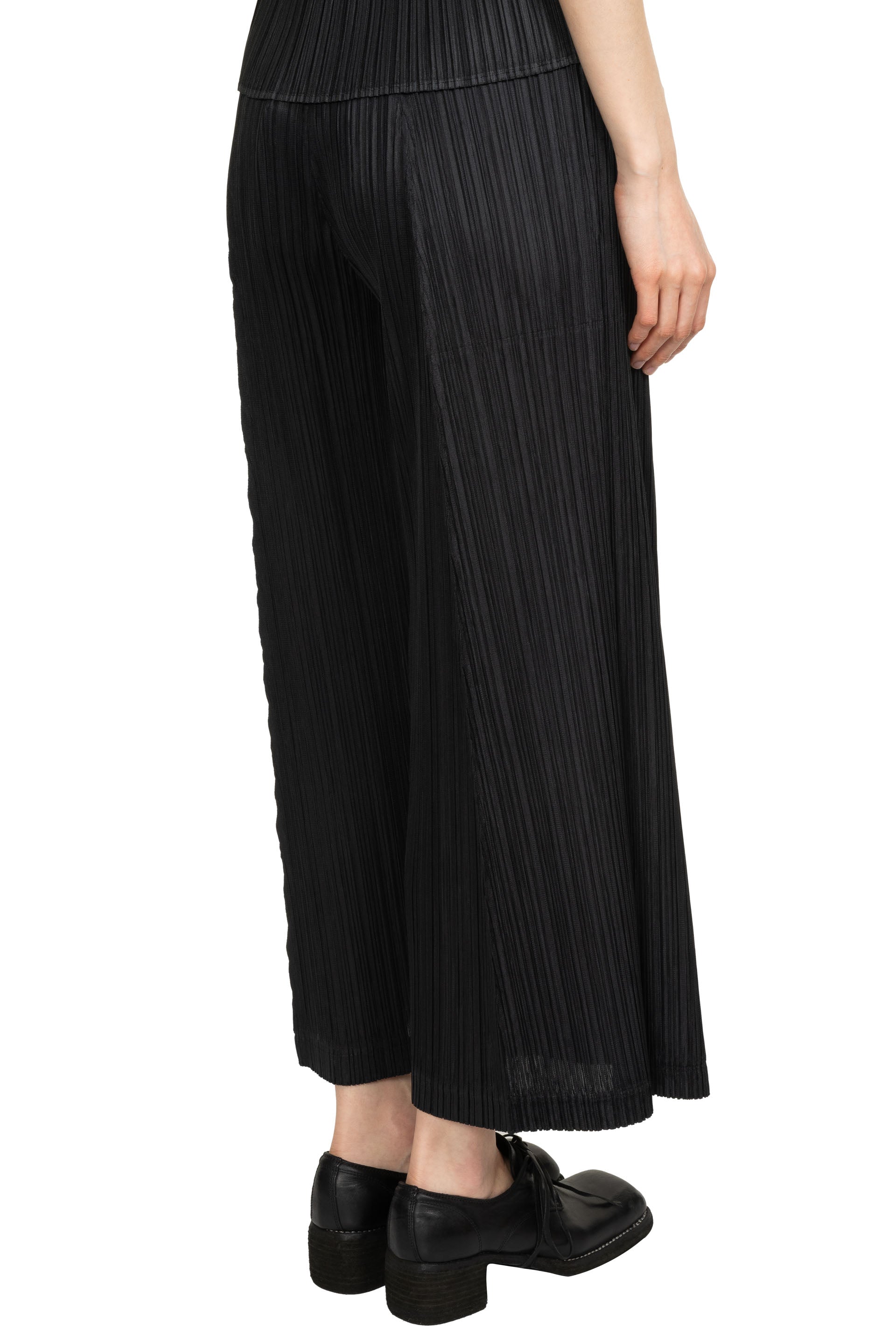 Pleats Please is crafted from a single thread, then creases are added after the clothes have been sewn into shape offering a combination of convenience, comfort and coolness. Pleats Please designs are simple with a strong silhouette as seen with the Thicker Bottoms 1 Black.
