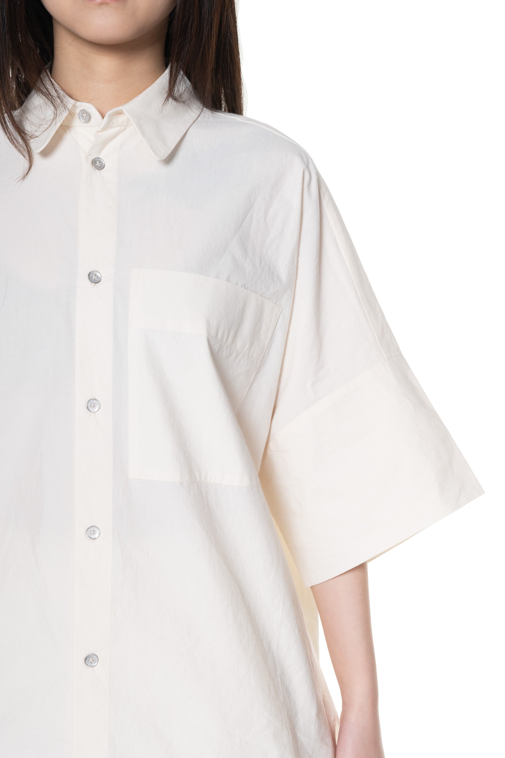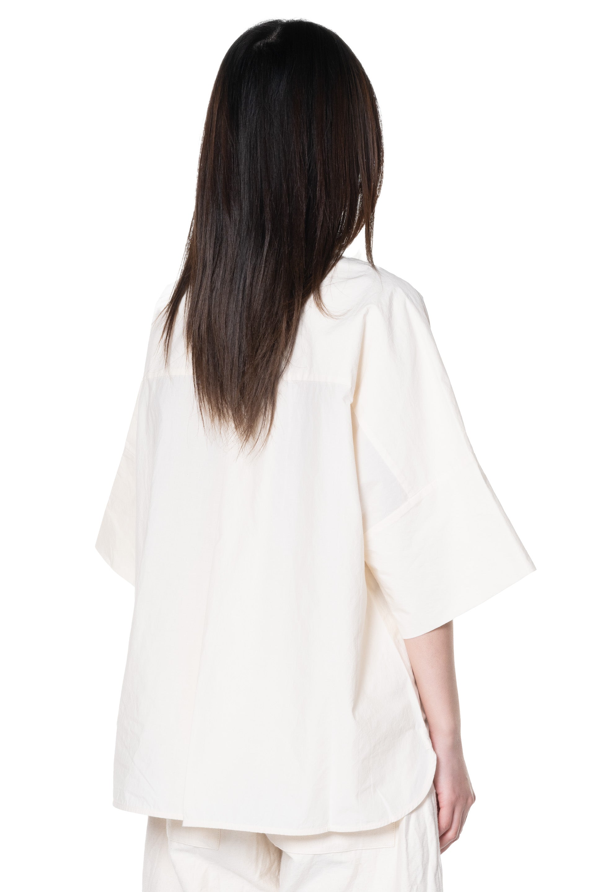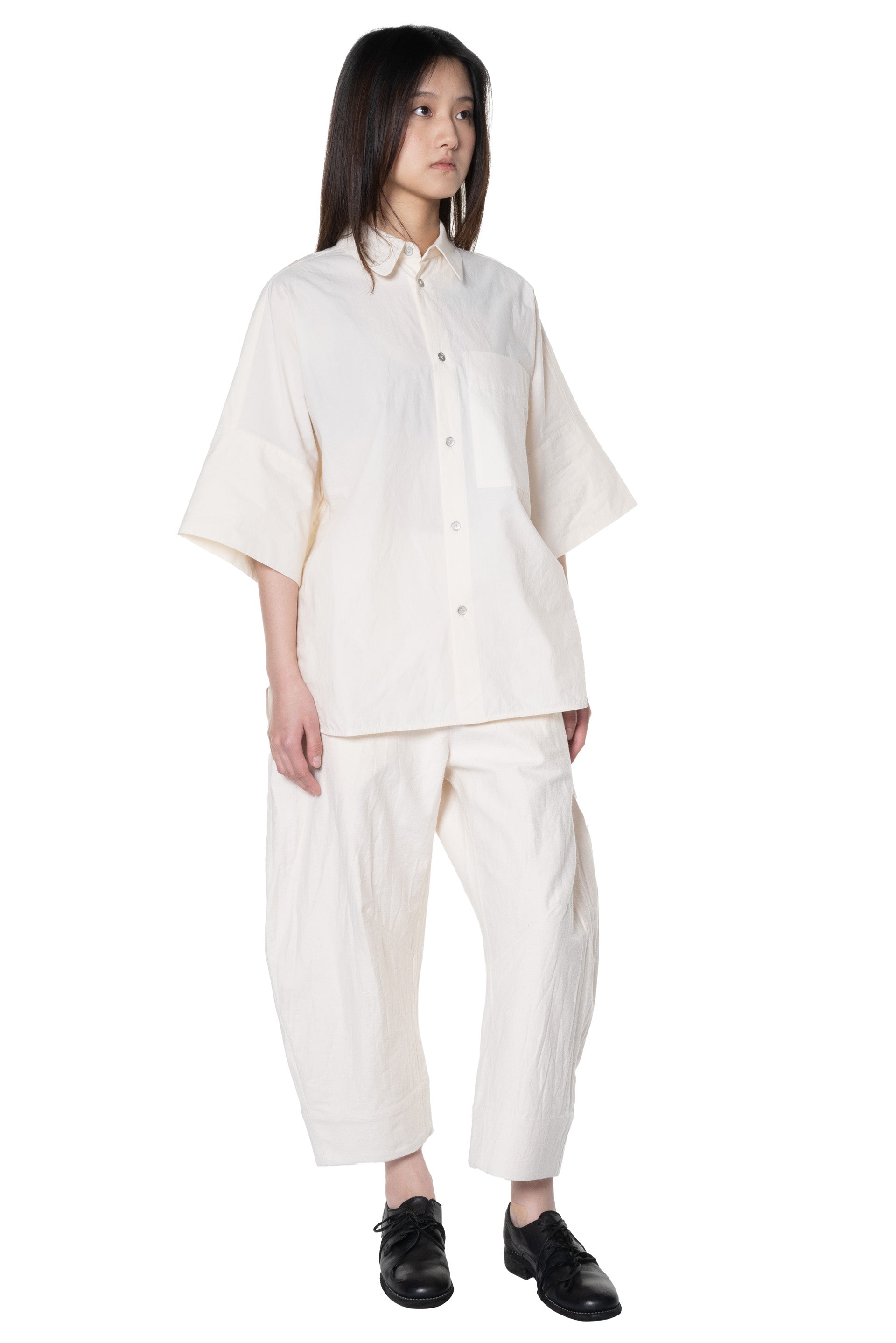 The Tinker Shirt is a bold shirt with lots of volume. Large single pleat at the back yoke. Generous curved hem. Grown-on short sleeves with deep turn-back cuffs. Generous rounded collar. Multiple patch pockets and small hammered metal buttons to close.