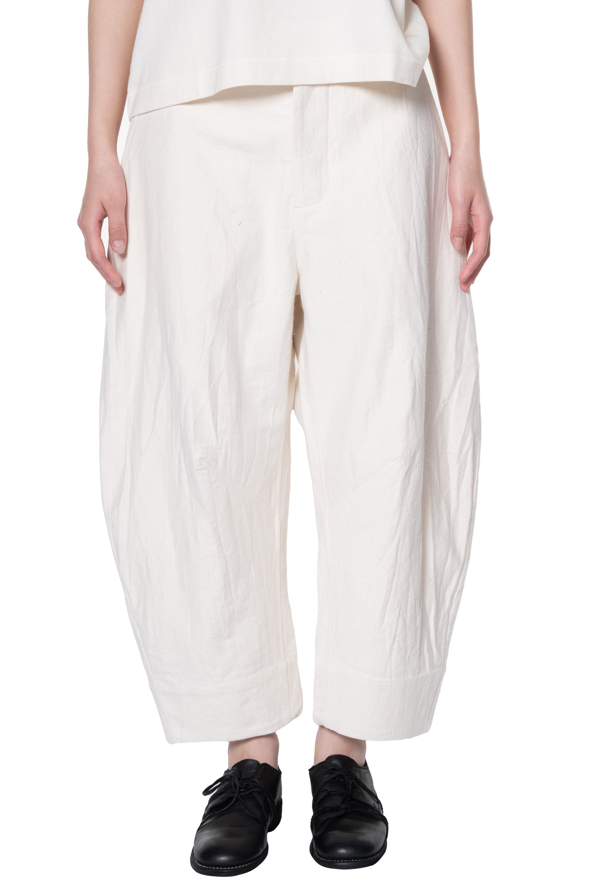 Trouser is made of creased cotton twill, a robust yet soft utilitarian fabric with intentional creases engineered into the construction of the fabric, giving a lived-in feel.