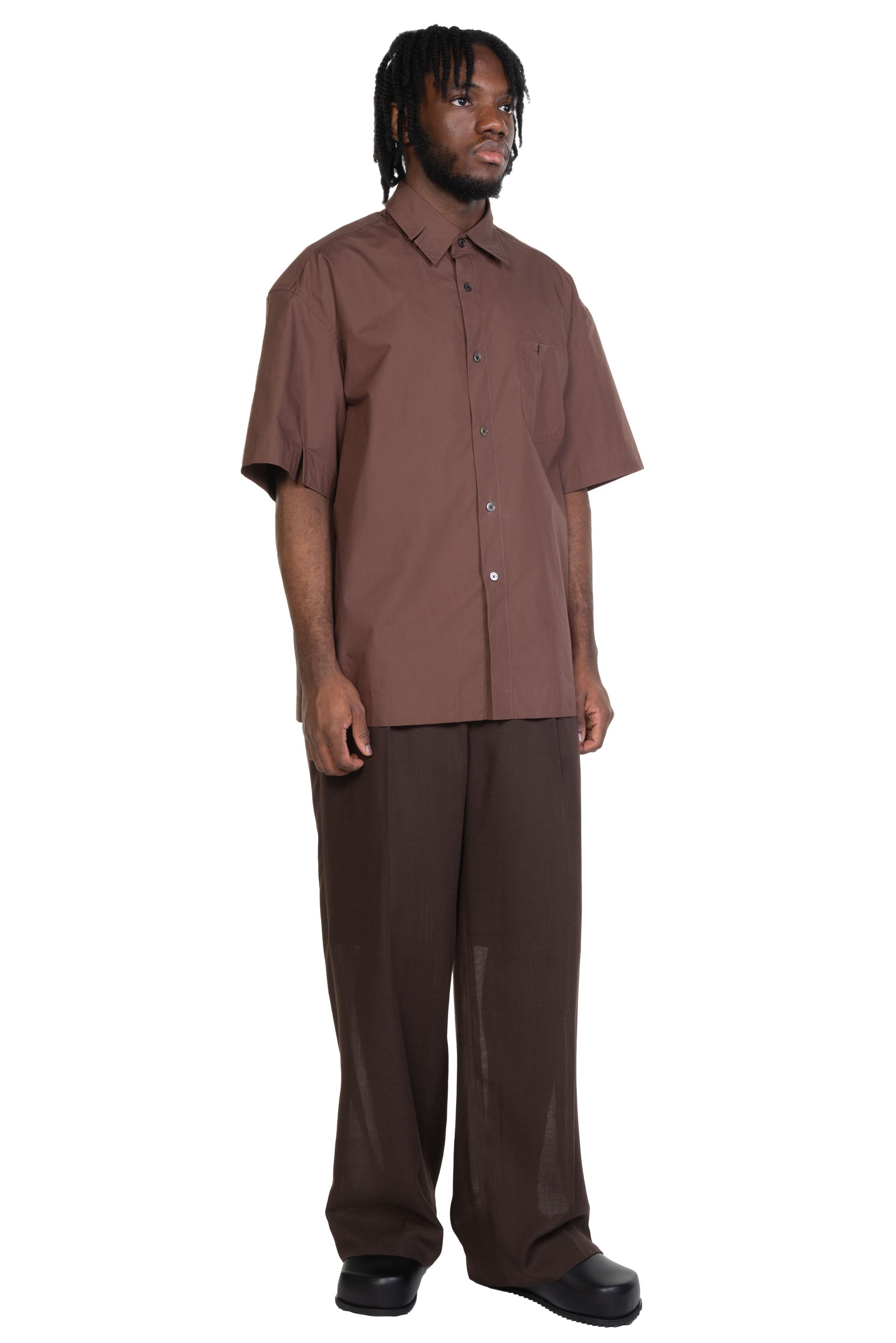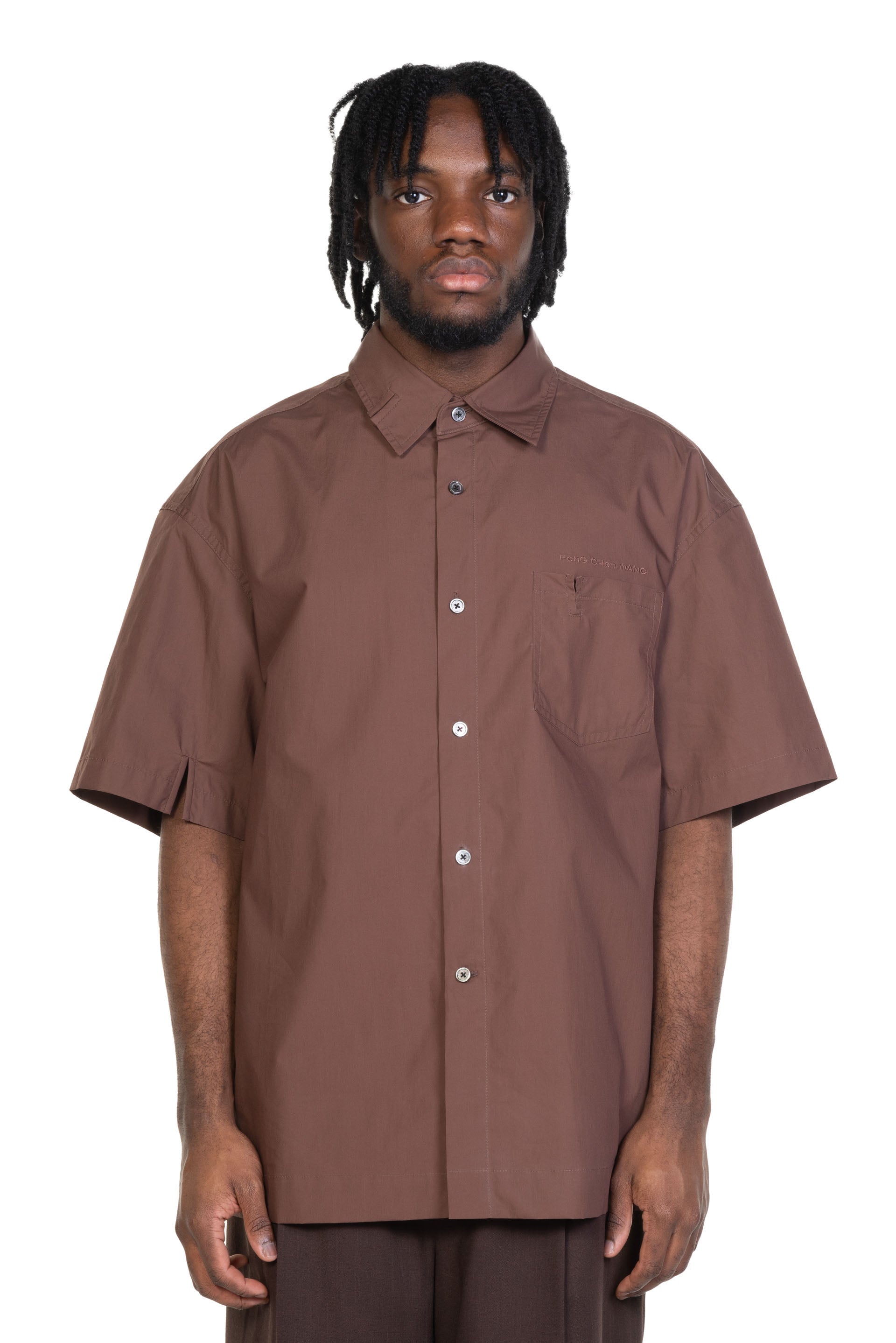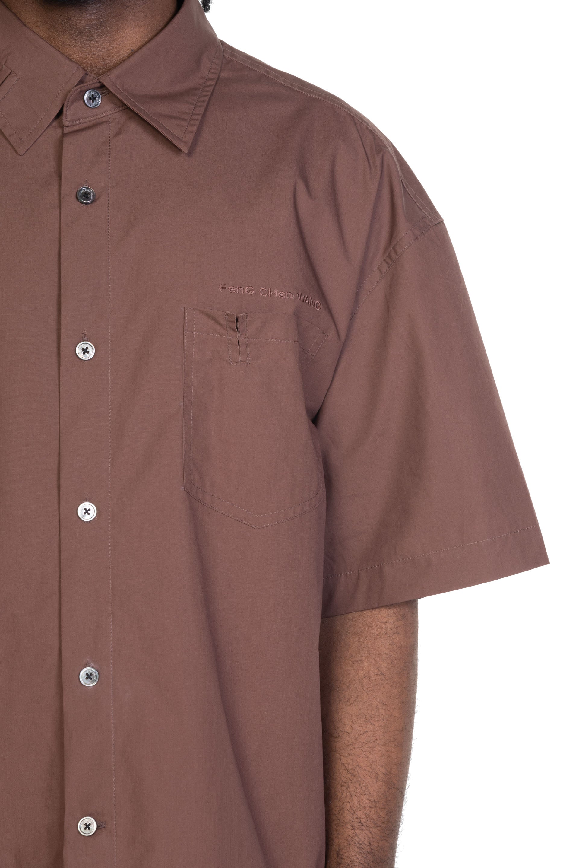 Feng Chen Wang Short sleeve shirt in Brown. Short sleeves. Button closure at front. Triple cut details at collar and sleeves. Slit at side. Pleat at back. Boxy cut.