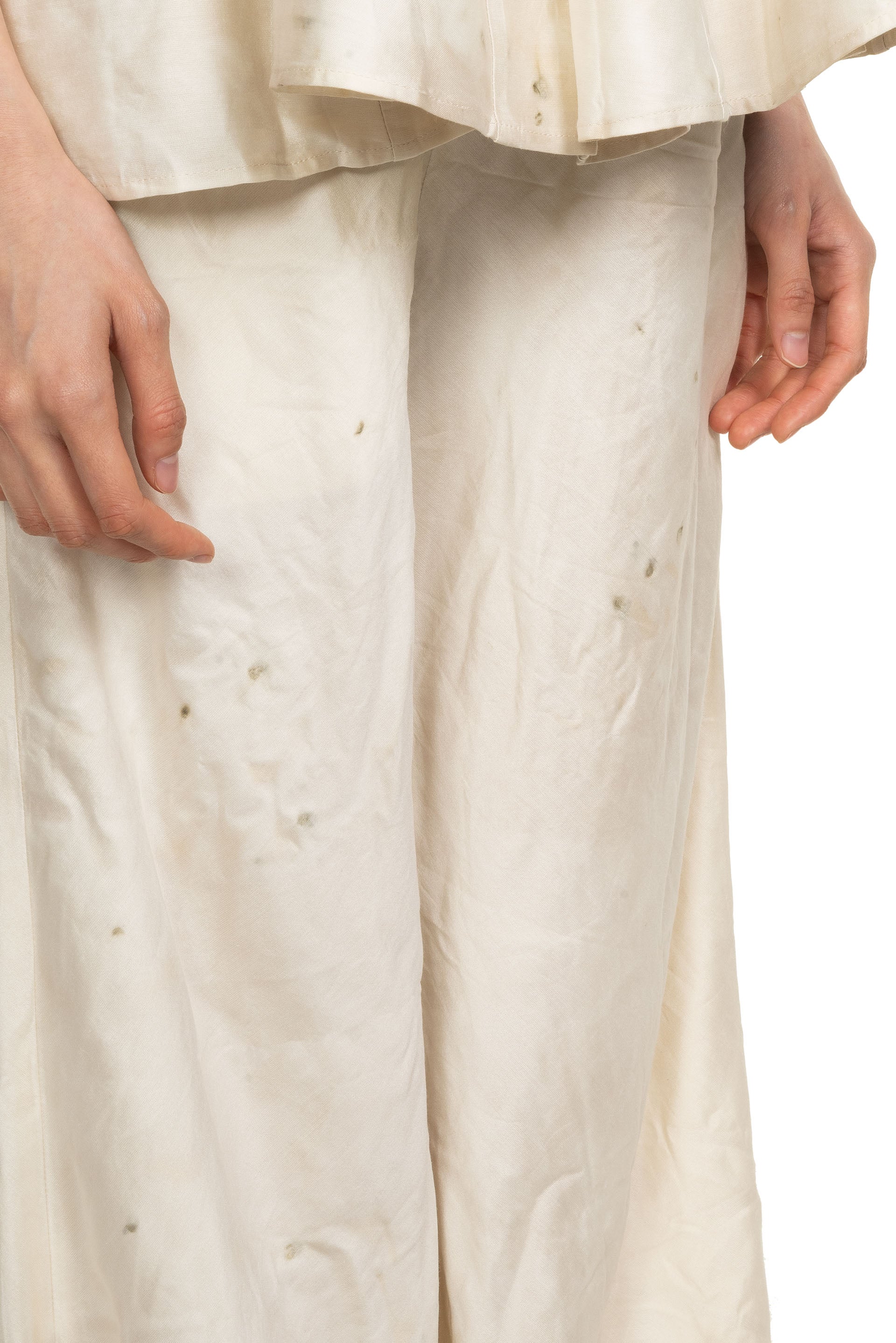 Yu Qun believes that everyone's character is multi-faceted and expressing spiritual independence. Fine hand-stitched threads, old mottled colours and patterns, and unconventional cuts are what Mute Dance has been exploring. The leaves and stems of fresh plants and berries, dried medicinal materials, old metals and so on are combined with the ancient and traditional dyeing technology to dye fabrics and paper as seen with the Trousers Hoary.