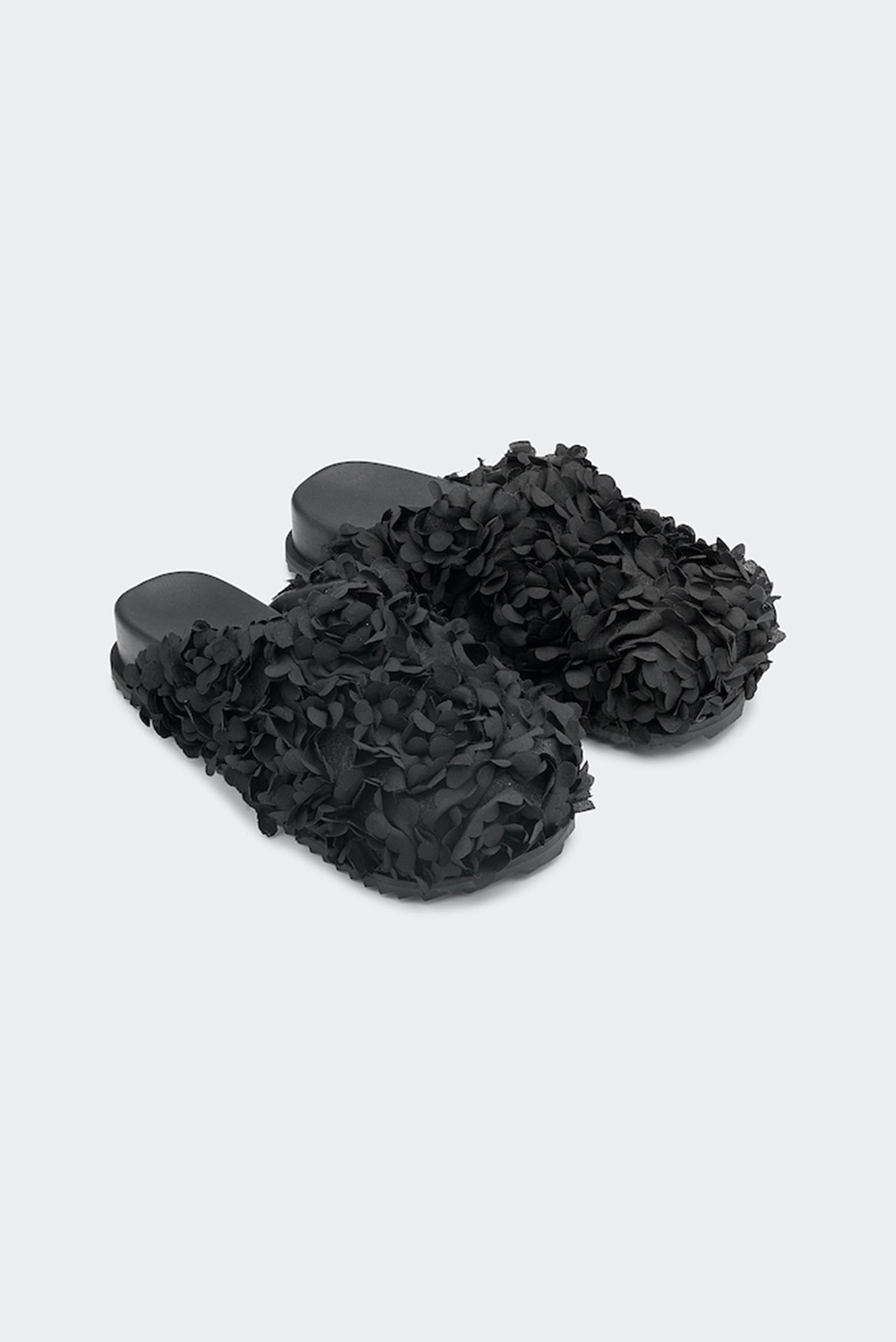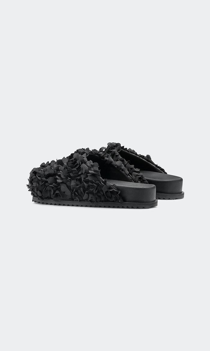 Unique and imaginative collections inspired by contemporary art, technology, and architecture. Named after the Japanese word for dream, YUME YUME makes futuristic footwear influenced by traditional Japanese silhouettes. They combine Japanese-inspired designs with a modern and futuristic approach to everyday footwear. YUME YUME aspires to create unique design pieces for all creative minds as seen with the Truck Slide Black Petal. These clogs are inspired by the shoes that truckers wear on the road. Easy slip on shoe. Square shaped outsole. The flower petals give the shoes an extra special feel. Soft hand feel vegan leather uppers. Recycled fibers and plant based sources for over 50%.