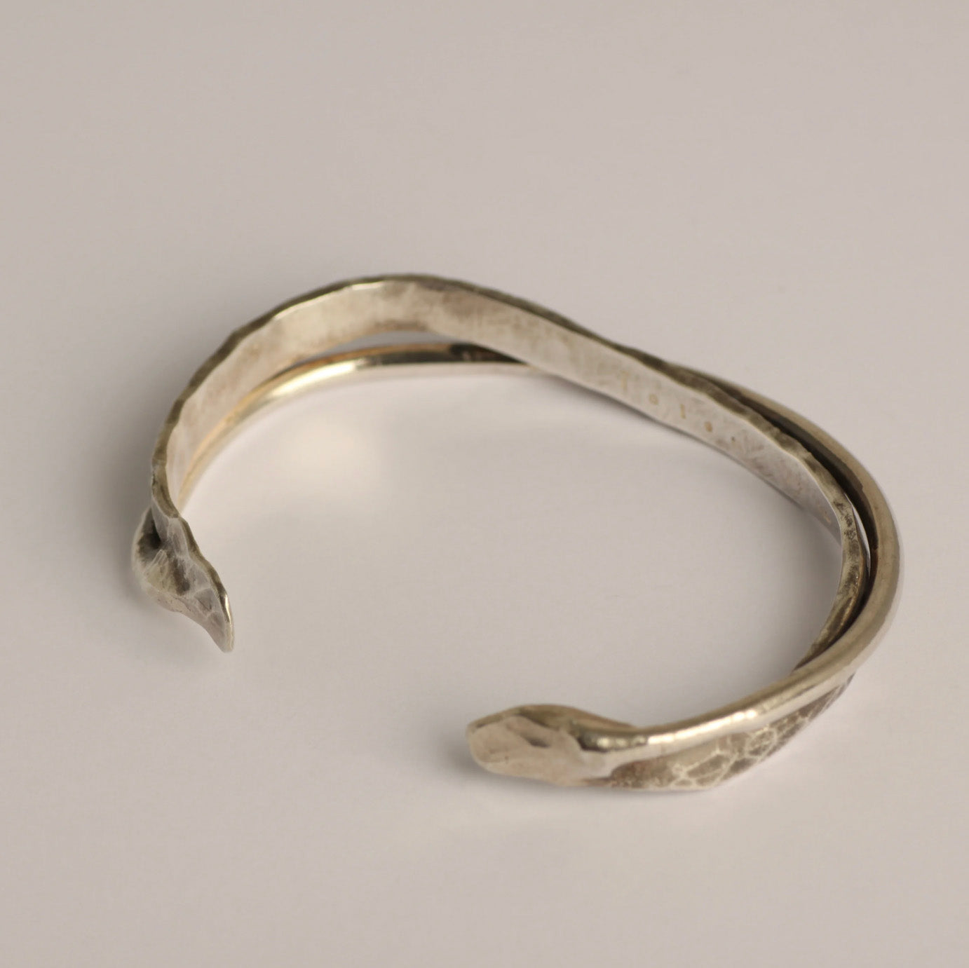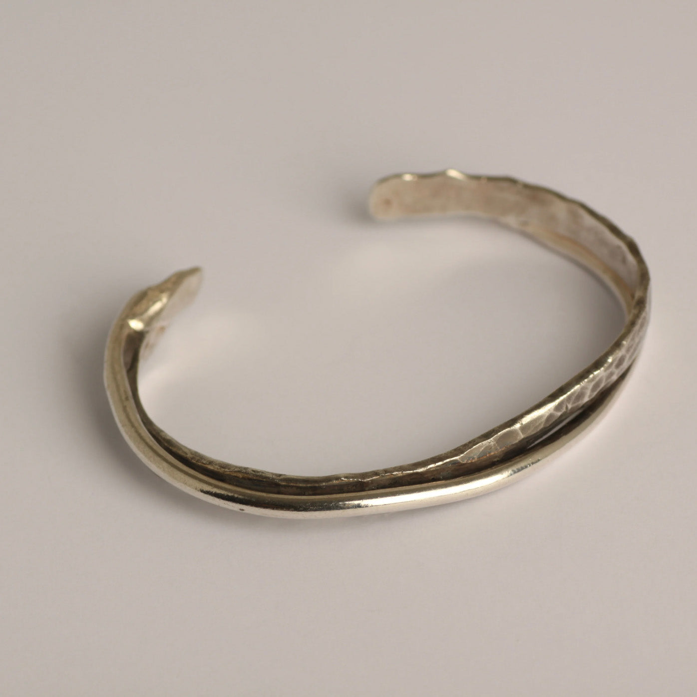 The iolom Tsuchime & Plain Bangle combines textured tsuchime detailing with smooth silver surfaces, highlighting the beauty of contrast and imperfection. Forged using traditional metalworking techniques, the bangle celebrates material honesty, subtle irregularity, and tactile craftsmanship.