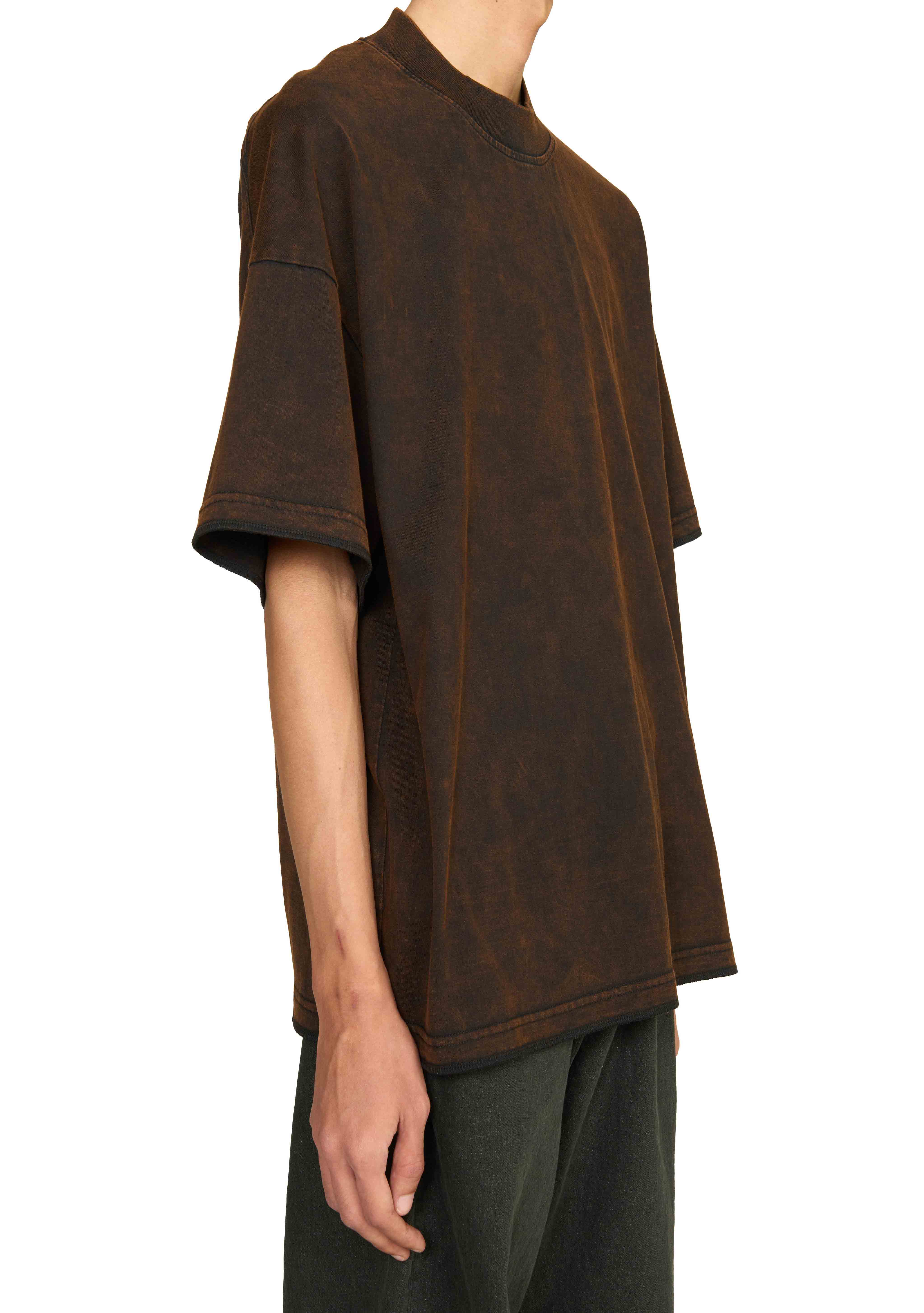 Short sleeve semi oversized t-shirt. Overlock detailing on sleeve and hem. Mock collar. Medium cotton, breathable and comfortable.