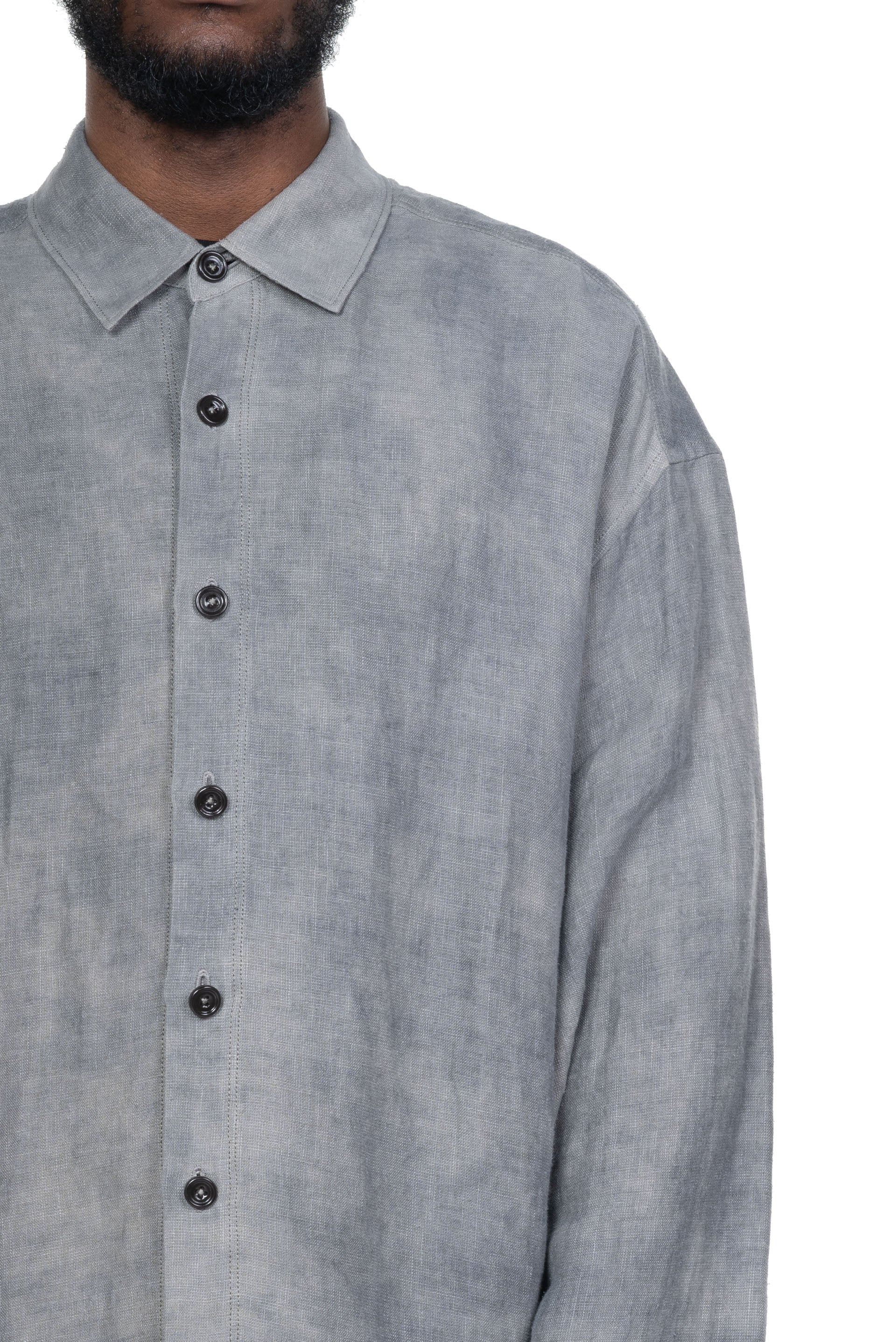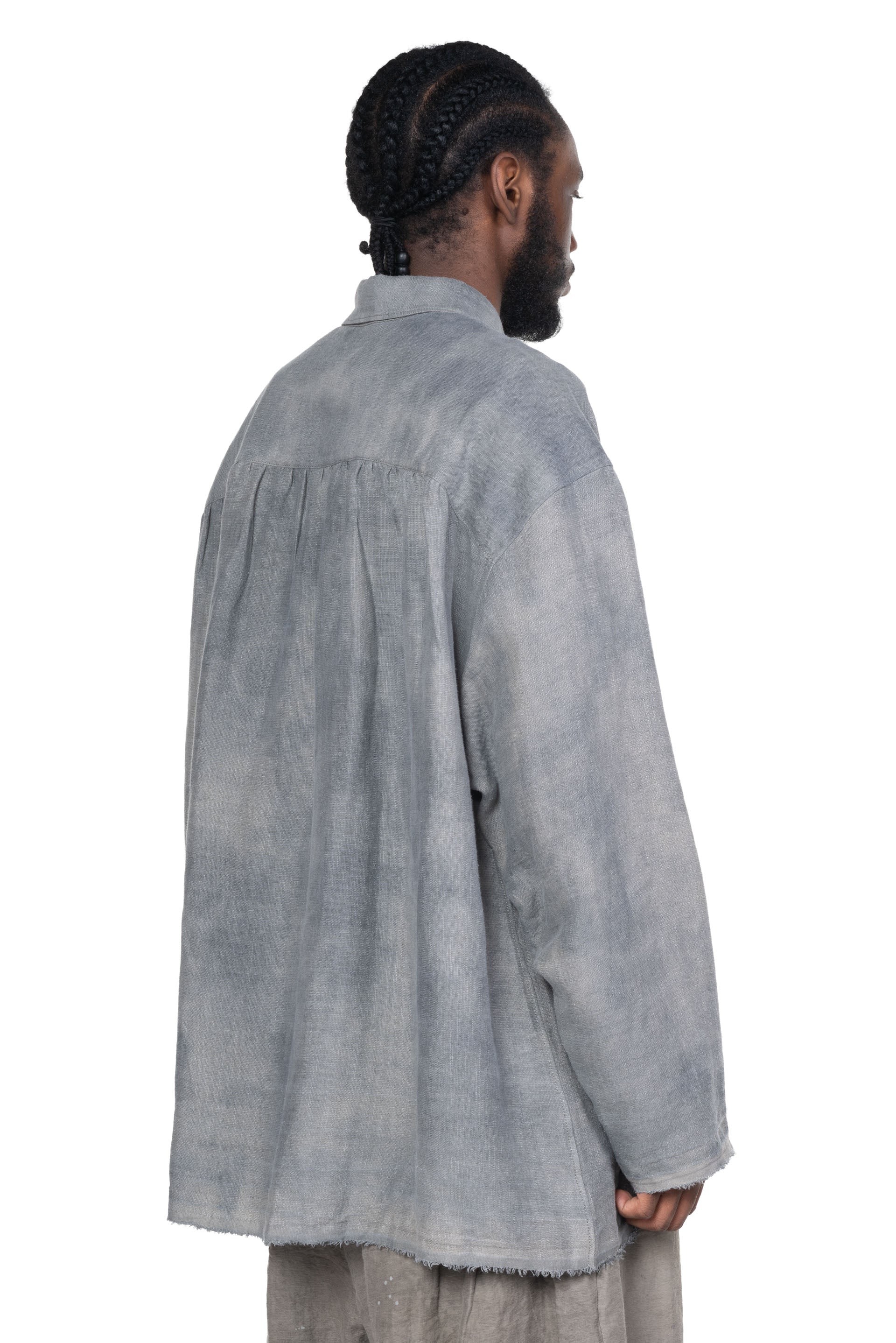 Turndown collar shirt. Long sleeves. Button closure at front. Pleats at back. Raw edges throughout. Wide fit. Soft textural fabric.