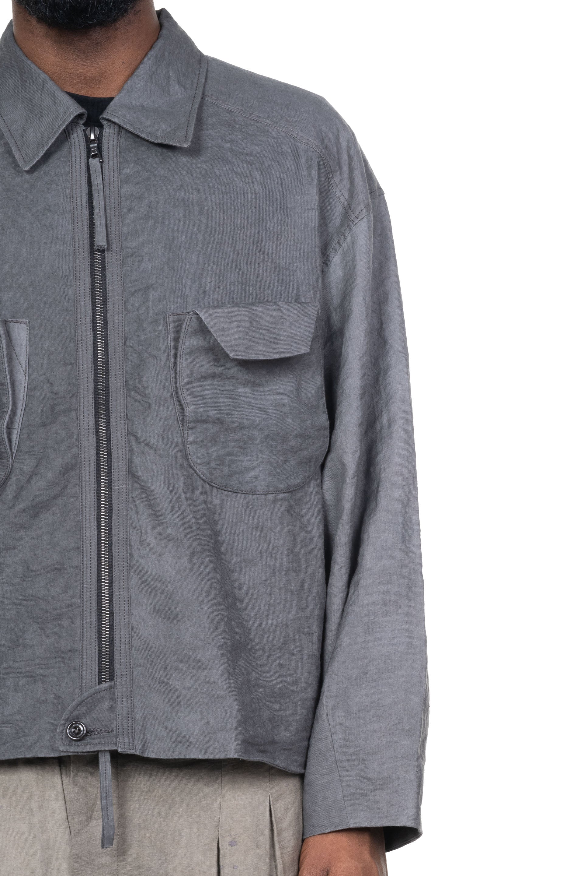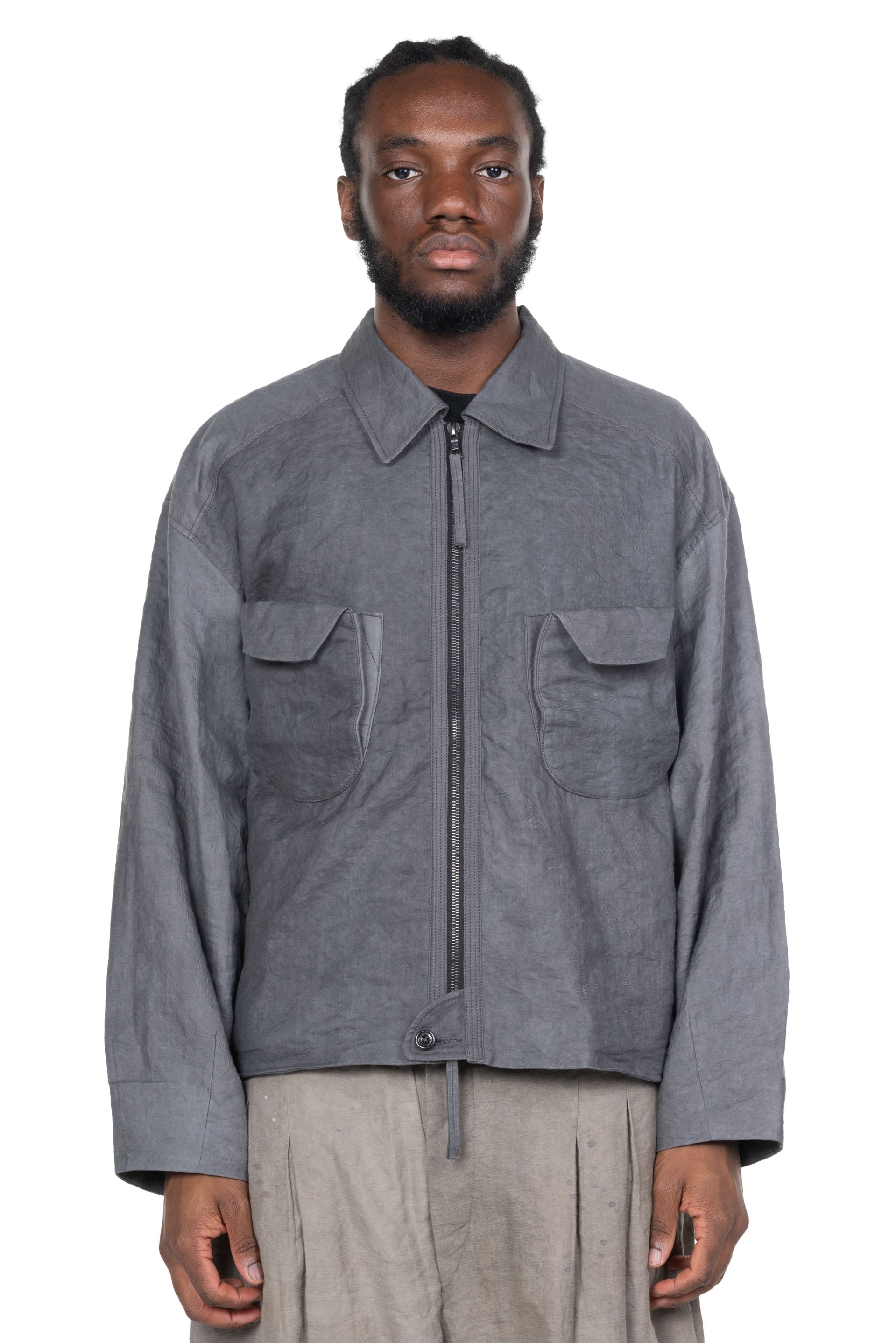 Short Jacket with Turndown Collar Zipper. Long sleeves. Zip closure at front. Slightly cropped. Boxy fit. Two front pockets. Two side pockets. Soft textural fabric.