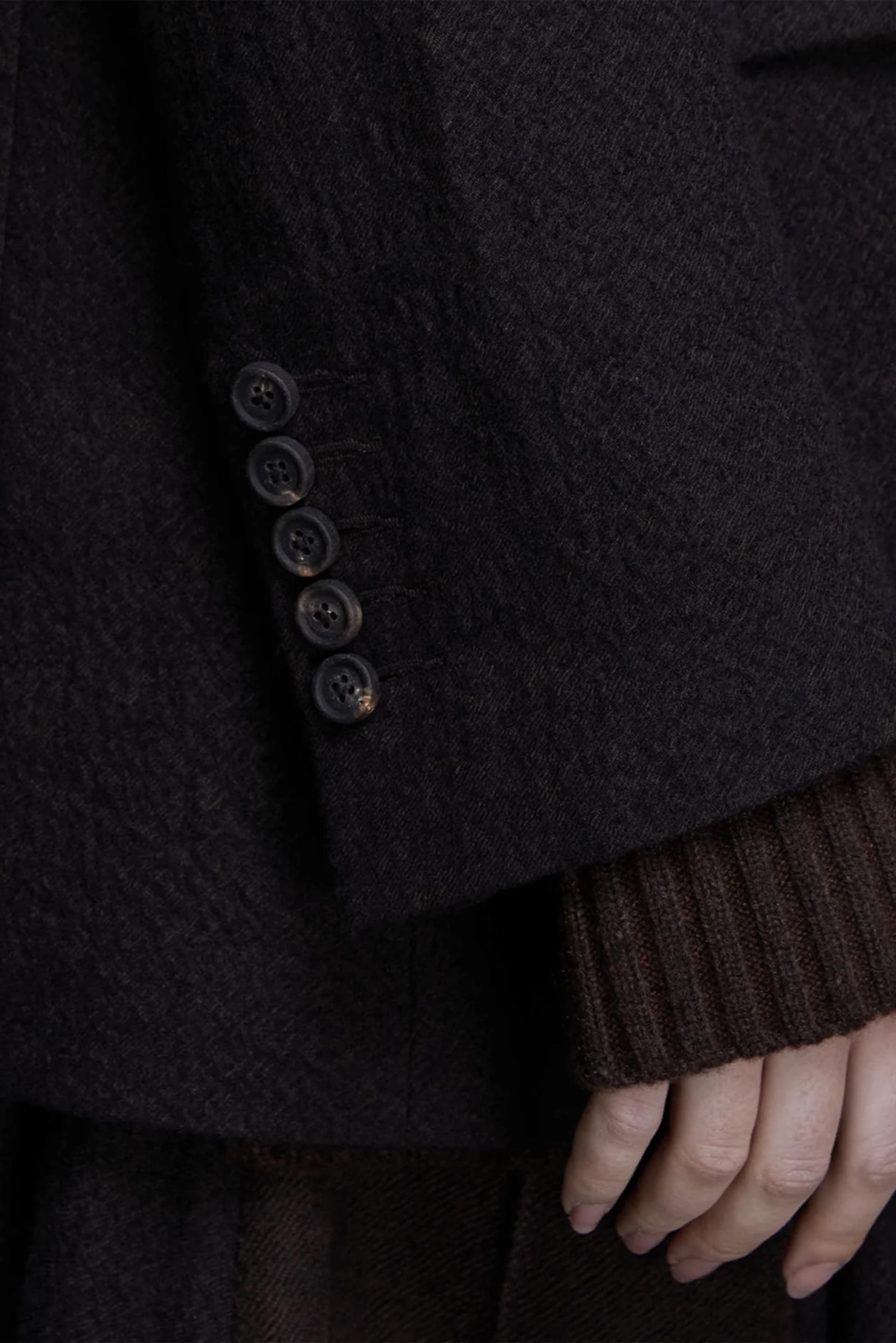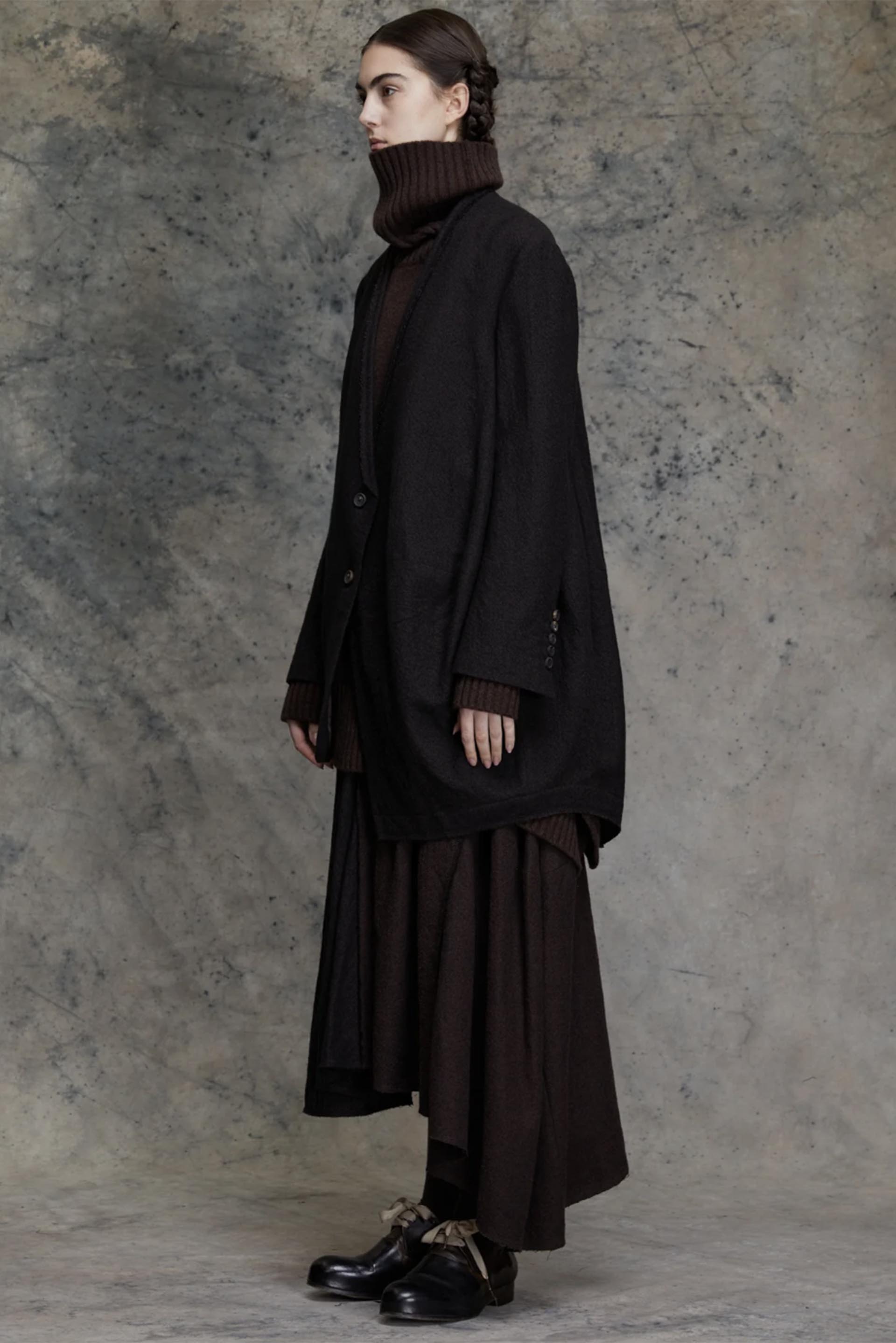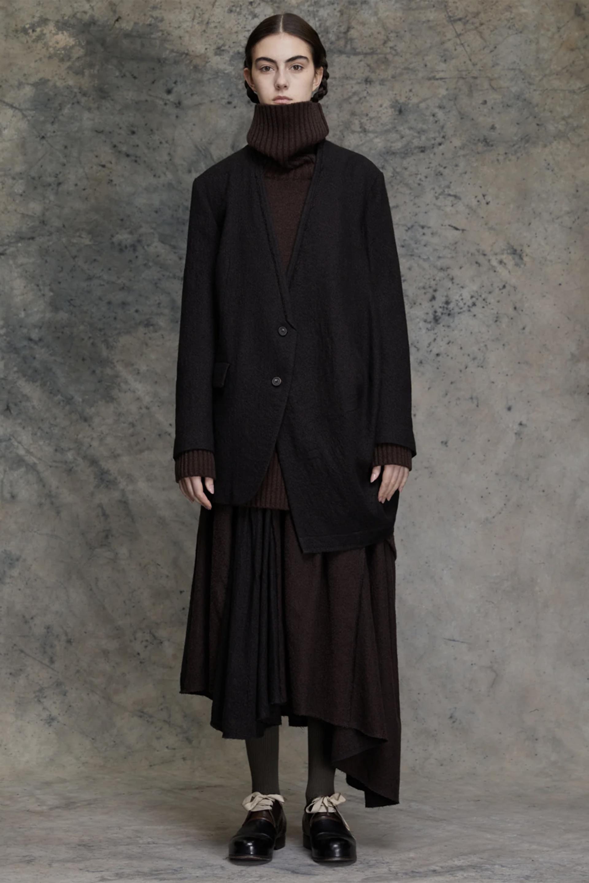 Regular fit. Below hip length. Slim tuxedo collar. Asymmetrical lower hem. Single front pocket. Two button closure. Fully lined.