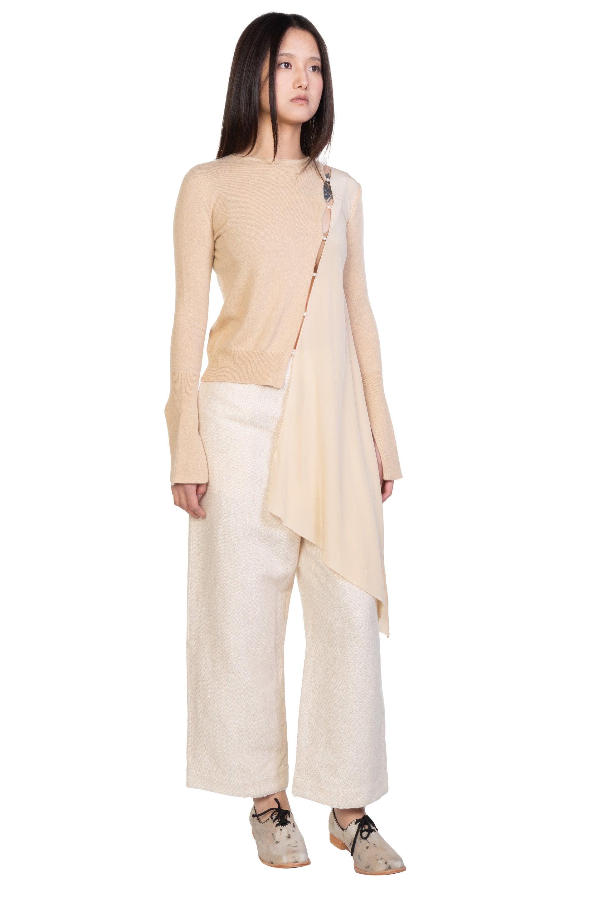A Tentative Atelier aims to explore artistic handicraft elements and innovative forms and silhouettes on garments combining with neo-vintage effect. The label does not only focus on fashion, it is a platform to encourage and sustain the spirit and tradition in craftsmanship to create new form as seen with the Two-Tone Split Pearls Drapy Sweater.