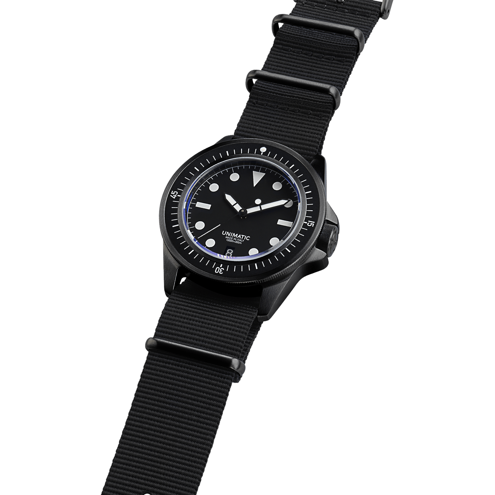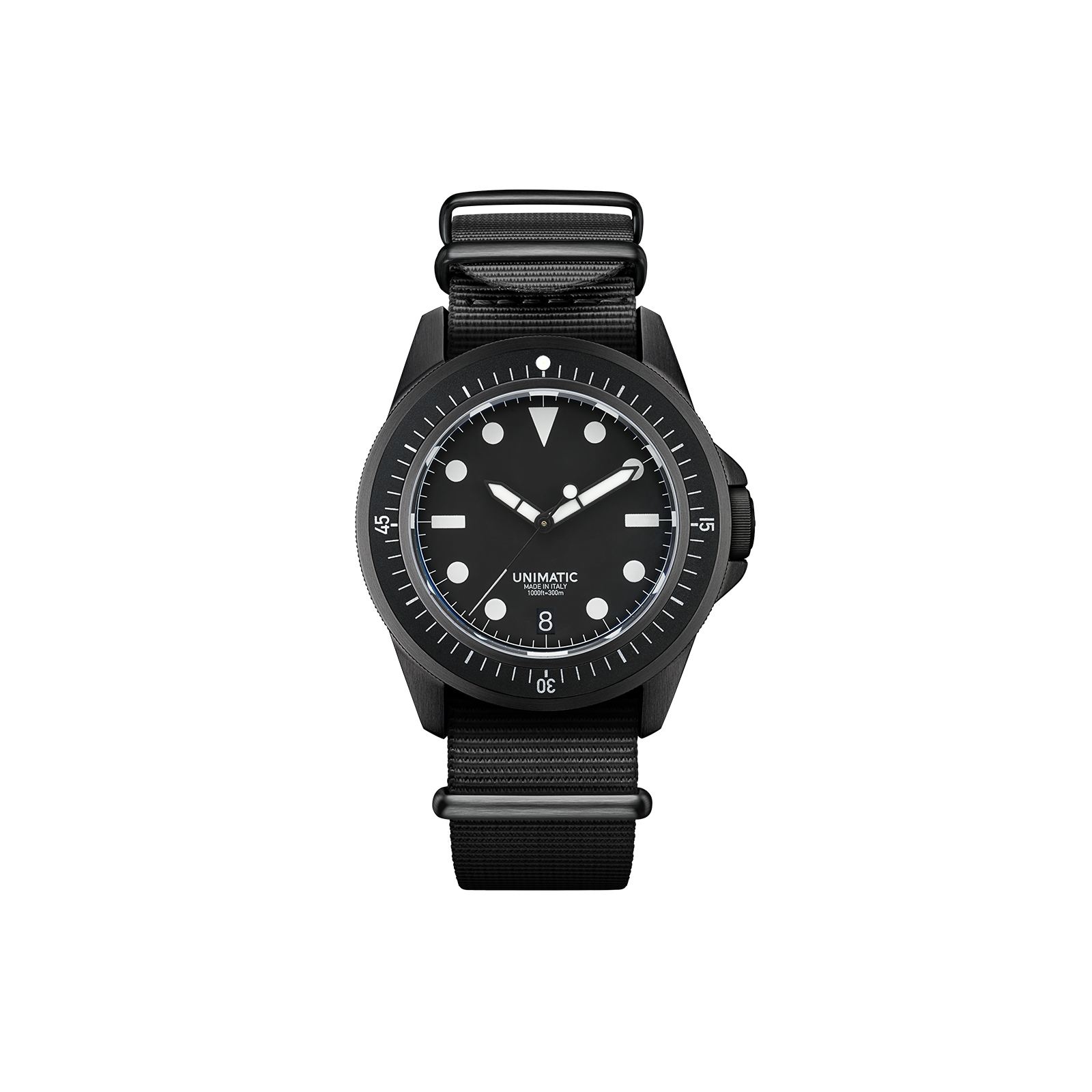 The Made in Italy professional diving watch, featuring black aluminium professional diver insert with raised lume dot matching with Super-LumiNova® C1 white markers on the black matte diver dial. Comes on a black heavy-duty Unimatic nylon nato strap with stainless steel brushed hardware signed Unimatic.