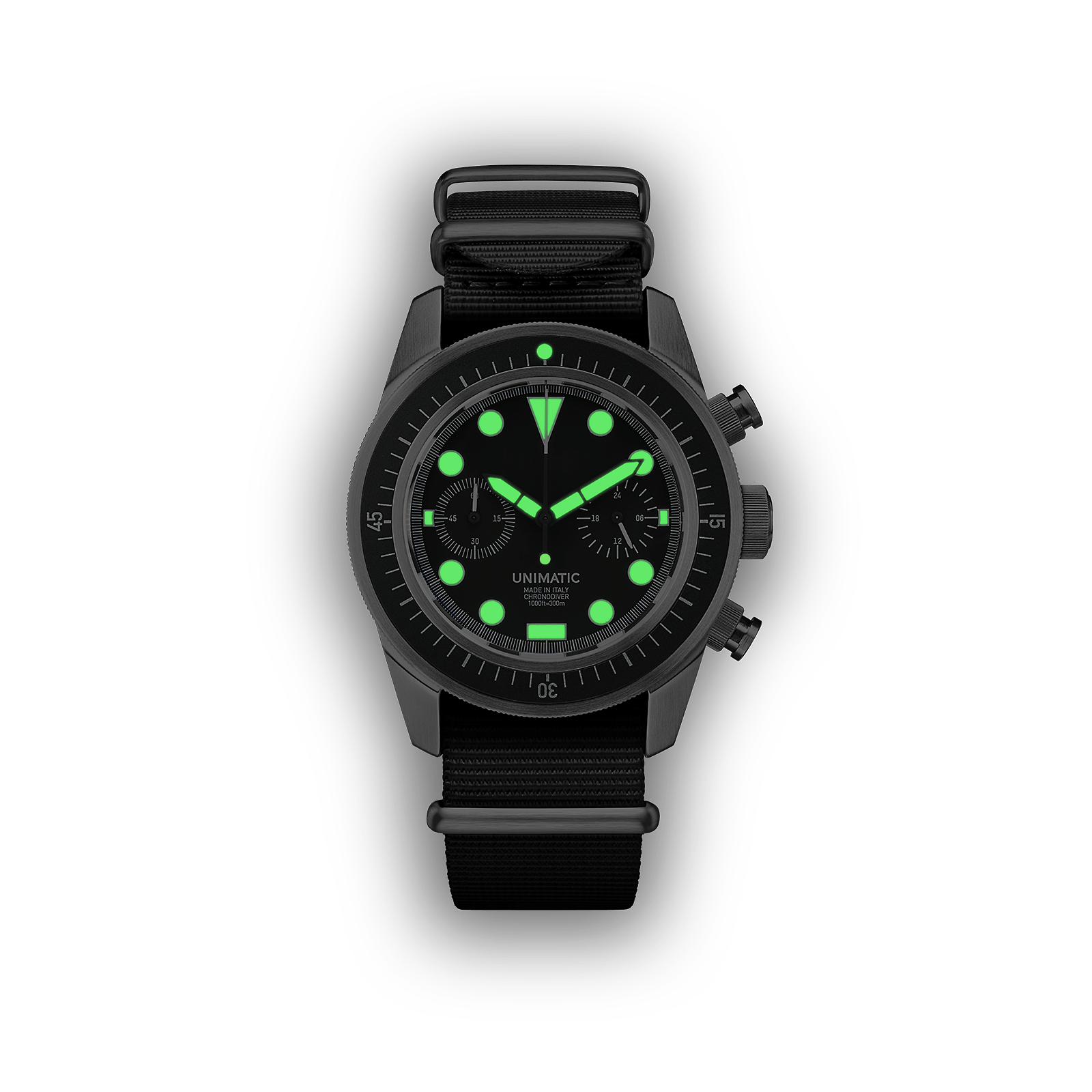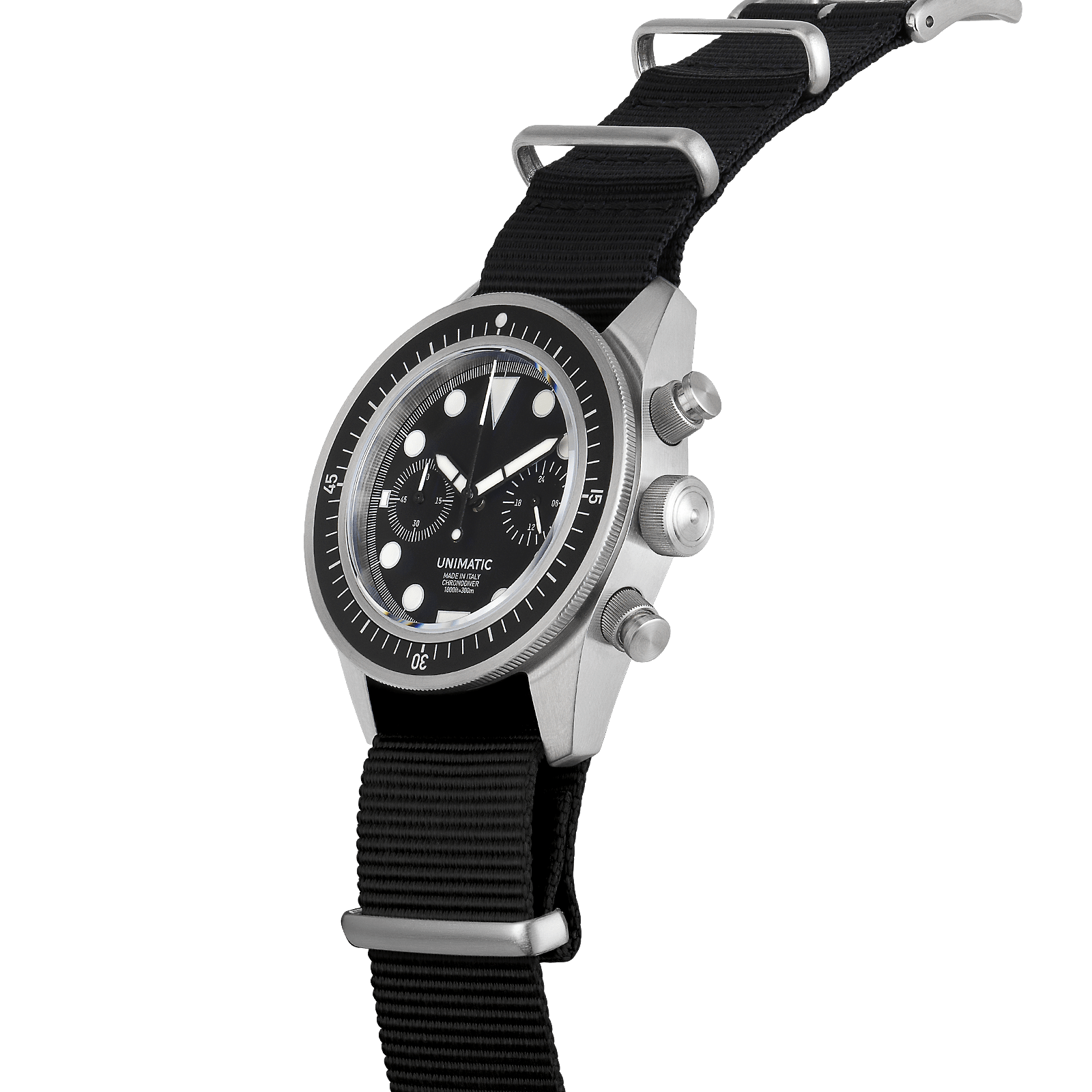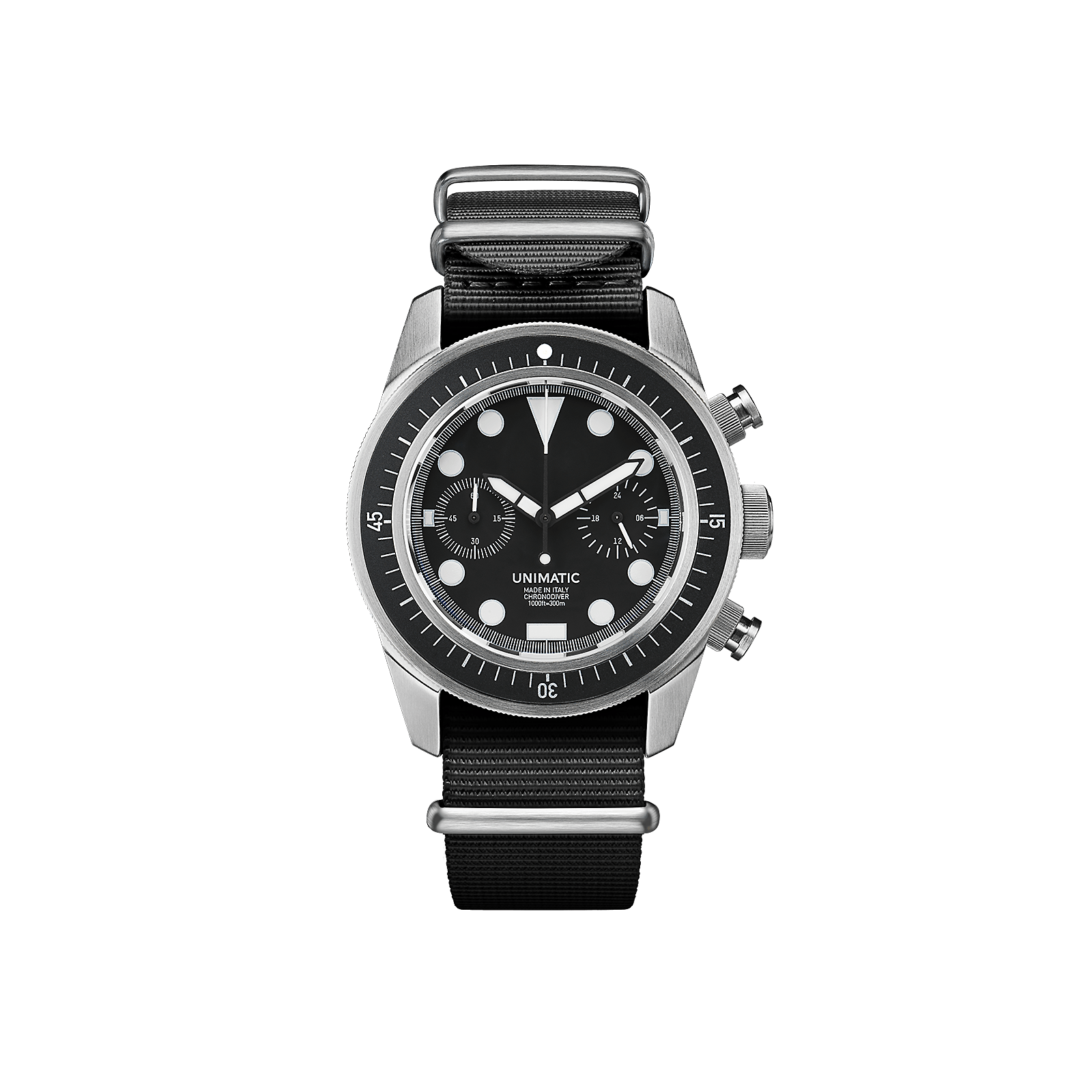 300m = 1000ft = 30atm WR. Diameter 40mm case with 41,5mm bezel. 120 clicks mono-directional security bezel. 2.5mm thick double domed sapphire. Anti-reflective coating on lens inner-side. Black aluminium professional diver insert with raised lume dot . 316 stainless steel case brushed finish. Fat screw-down chrono pushers. Black matte, two sub-dial. Super-LumiNova® C1 white . Silver open second rail and dial trims . Meca-quartz calibre Seiko VK64 . 1/5 second sweep second hand with mechanical reset. Accuracy -20/+20 s/month . Antimagnetic ≥1600 A / m . Black heavy-duty Unimatic nylon nato strap. Stainless steel brushed hardware signed Unimatic. Unimatic world timer screwdown caseback. Unimatic tough case, warranty card with unique ID seal.