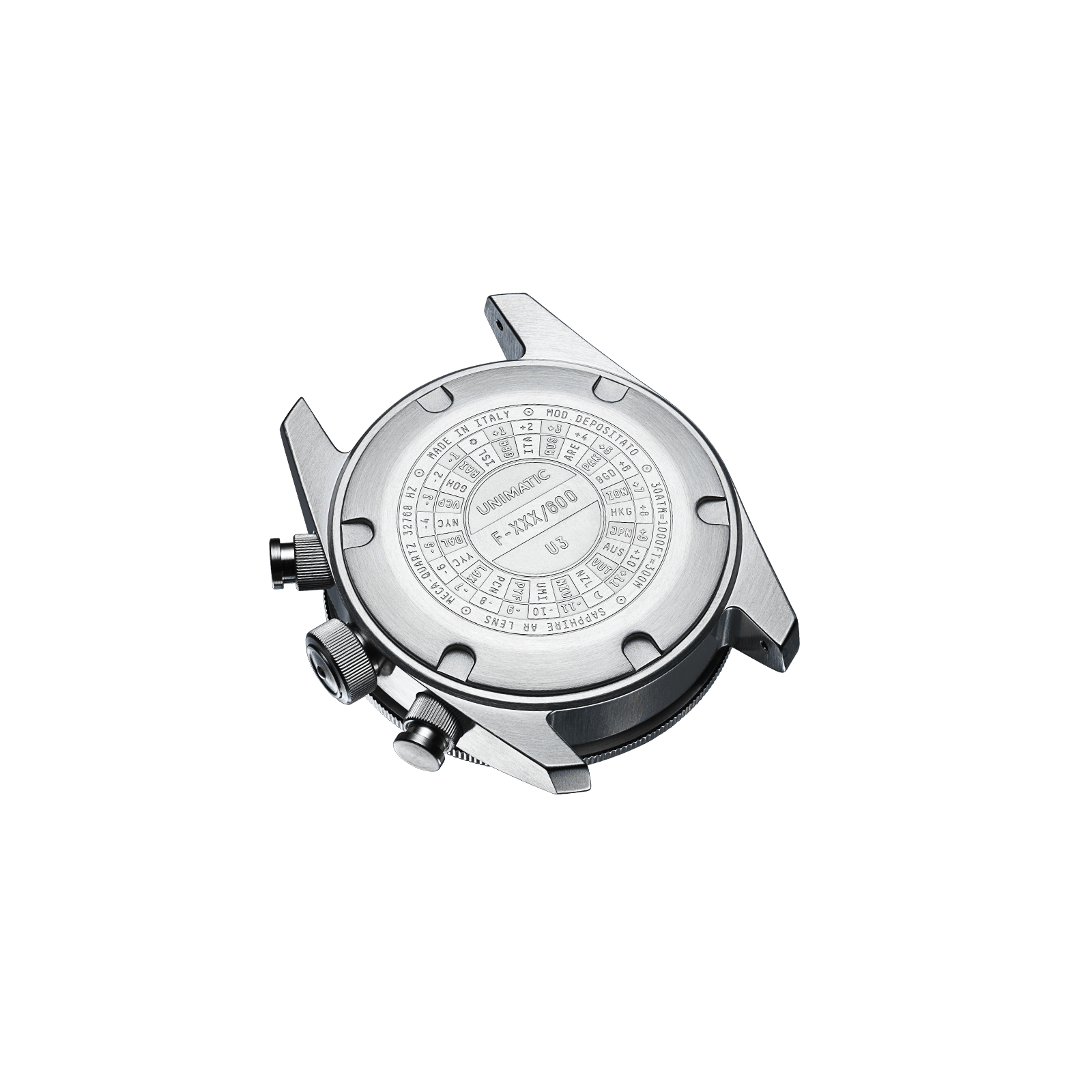 Modello Tre ref. U3-F is the latest addition to our product range, a Made in Italy chrono-diver. It features a two-eyes black matte dial with retro sized marker in Super-LumiNova® C1 white matching the pearl on the black aluminium professional diver insert, silver second rail and graphic trims. The caseback features the Unimatic world timer engraving and the individual progressive number. The watch is covered by a 24 months worldwide warranty and is part of a unique edition of 600 pieces.