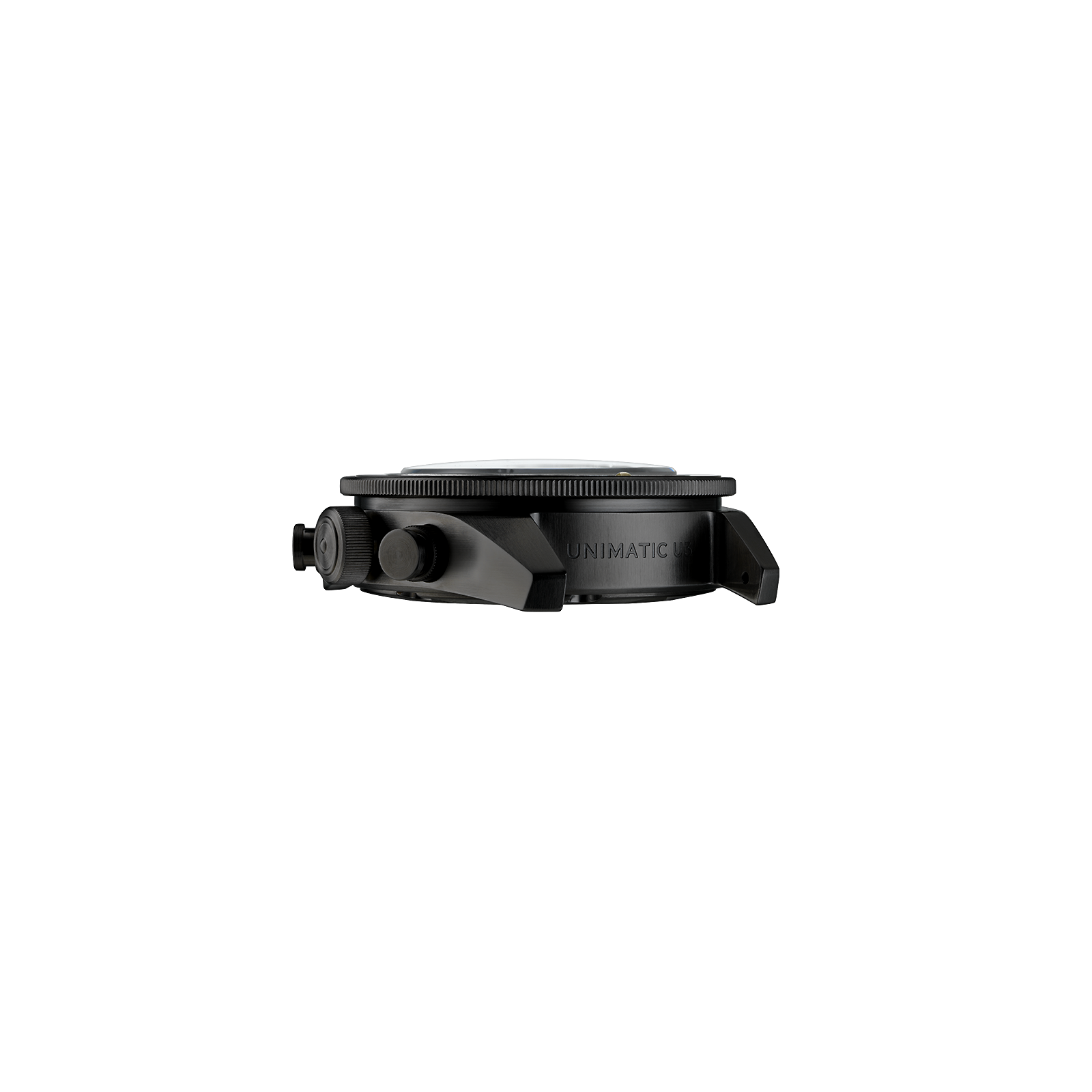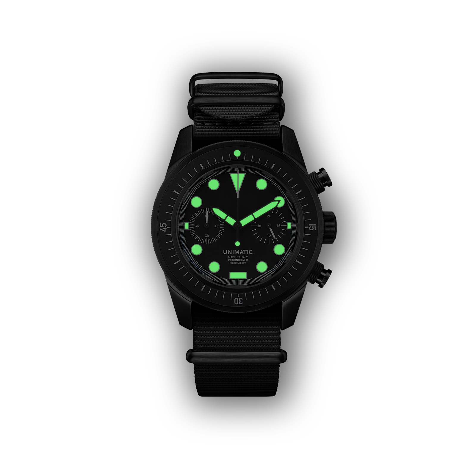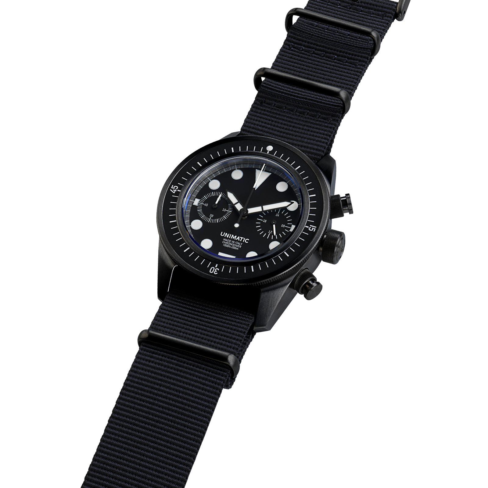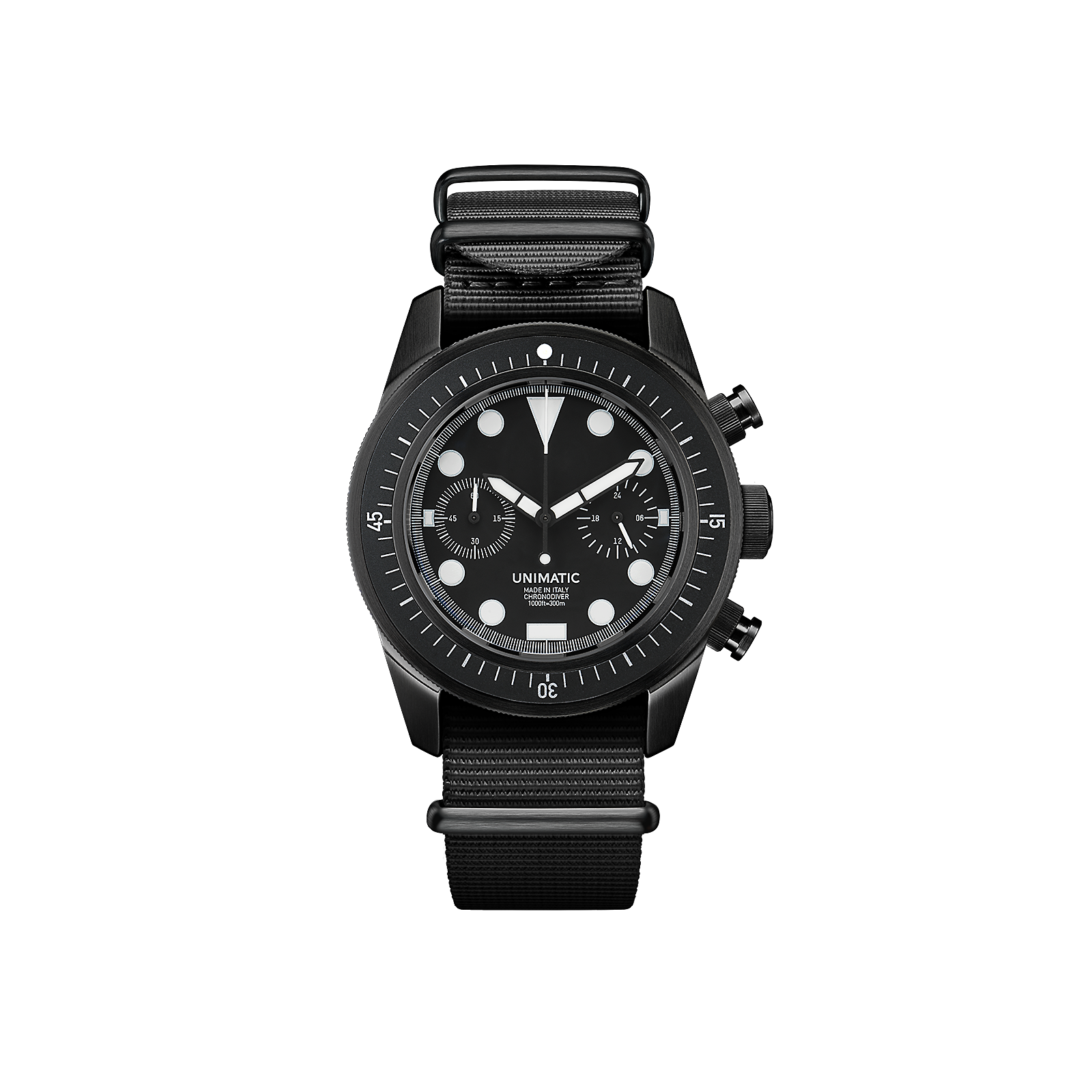 300m = 1000ft = 30atm WR. Diameter 40mm case with 41,5mm bezel. 120 clicks mono-directional security bezel. 2.5mm thick double domed sapphire. Anti-reflective coating on lens inner-side. Black aluminium professional diver insert with raised lume dot . 316 stainless steel case. DLC black brushed finish . Fat screw-down chrono pushers. Black matte, two sub-dial. Super-LumiNova® C1 white . Silver open second rail and dial trims . Meca-quartz calibre Seiko VK64 . 1/5 second sweep second hand with mechanical reset. Accuracy -20/+20 s/month . Antimagnetic ≥1600 A / m . Black heavy-duty Unimatic nylon nato strap. Black DLC brushed hardware signed Unimatic. Unimatic world timer screwdown caseback. Unimatic tough case, warranty card with unique ID seal.