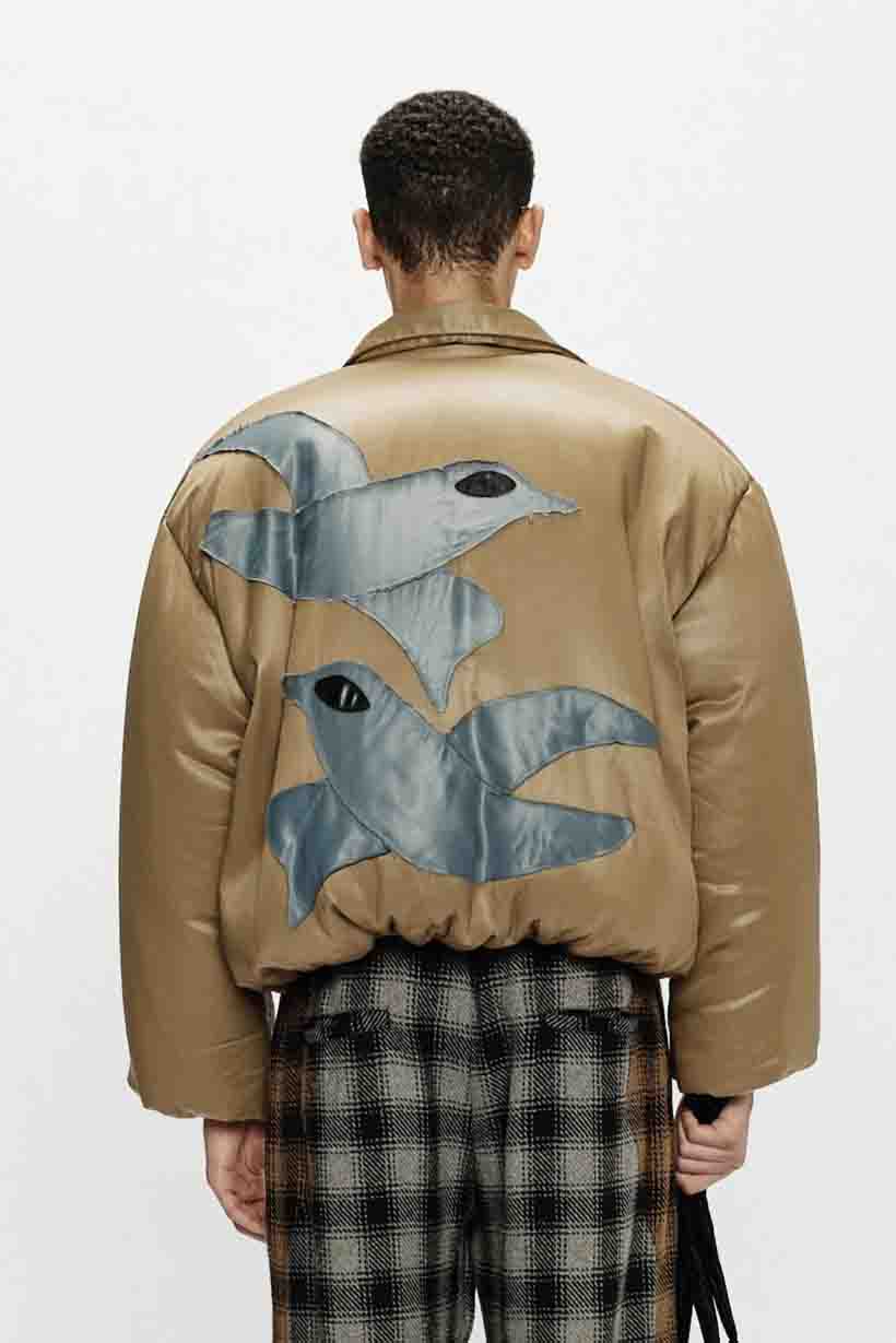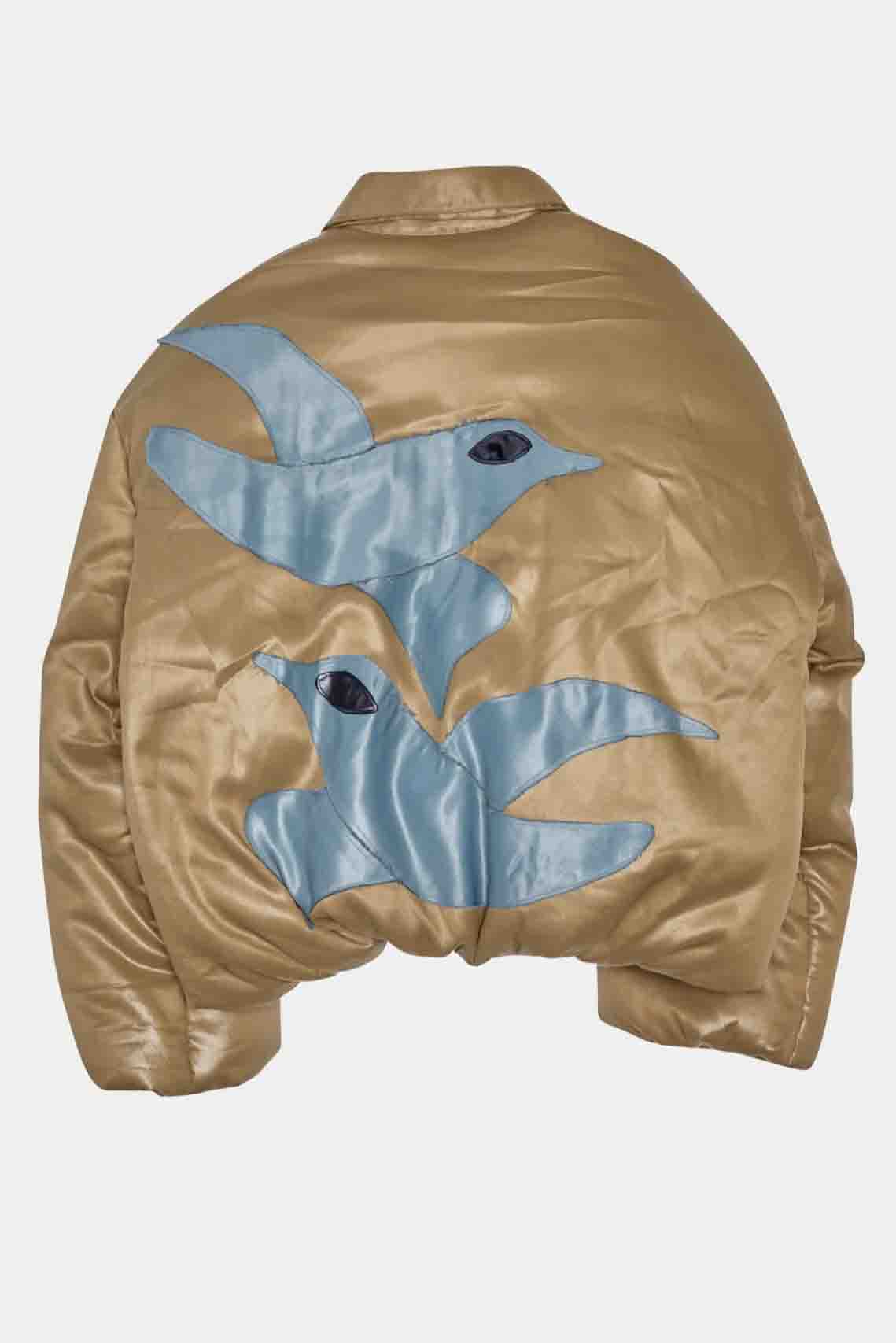 Song for the Mute puffer jacket in Camel colour with bird details at back. Long sleeves. Two side pockets. Double zip closure at front. Fully lined oversized cropped puffer jacket in a fluid poly. Featuring a piped hemline and cuffs with seasonal "Bird" motif panelling at back. Wadded with duck down and feathers.