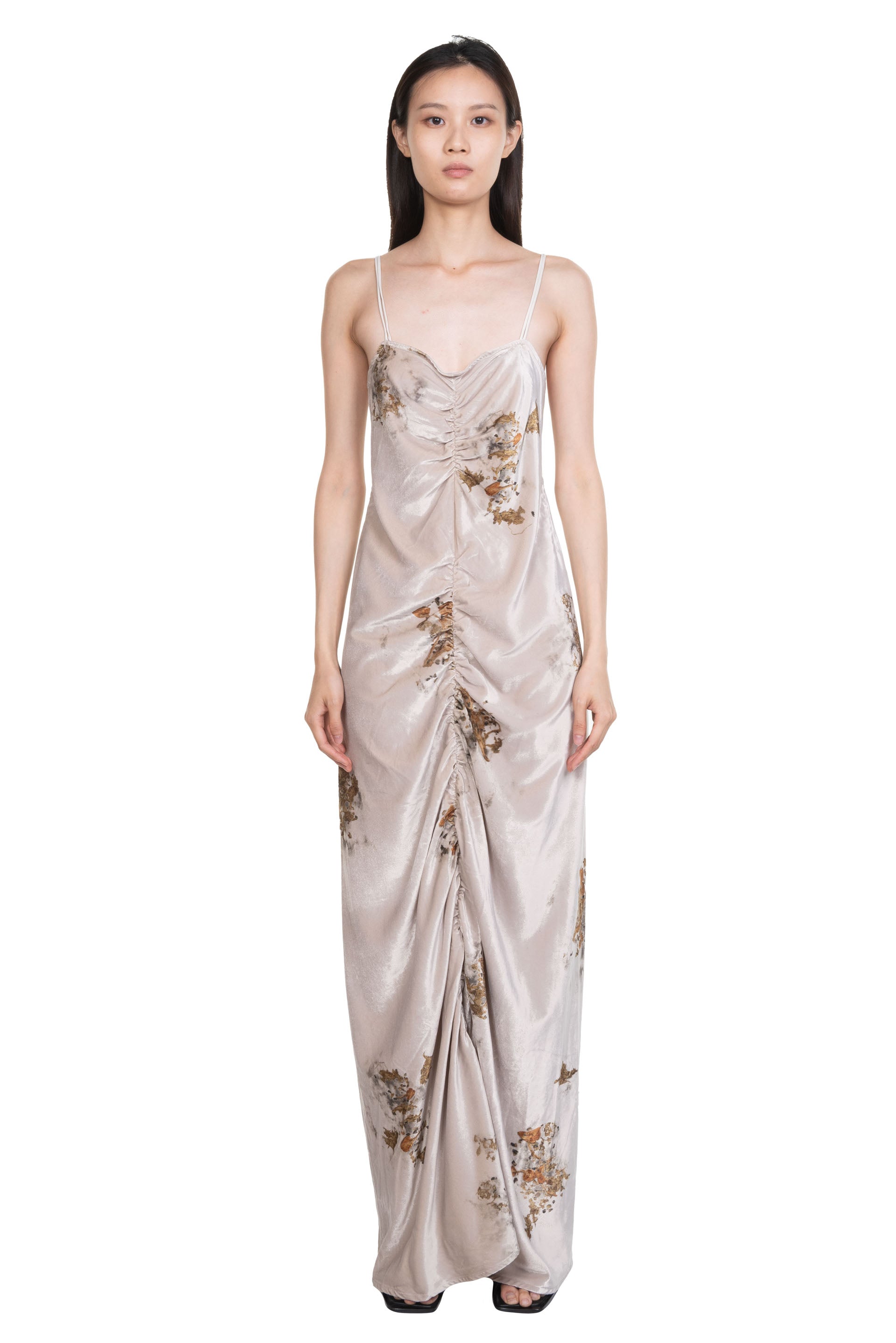 Peng Tai creates modern silhouette with traditional chinese philosophy. Inspired by how Chinese herbal medicine regulates the body from the inside out, Peng Tai aims to research and develop a way to boil Chinese herbal medicine with fabrics, to create clothes that feel like a second skin as seen with the Velvet Chinese Medicine Print Volume Midi Dress.