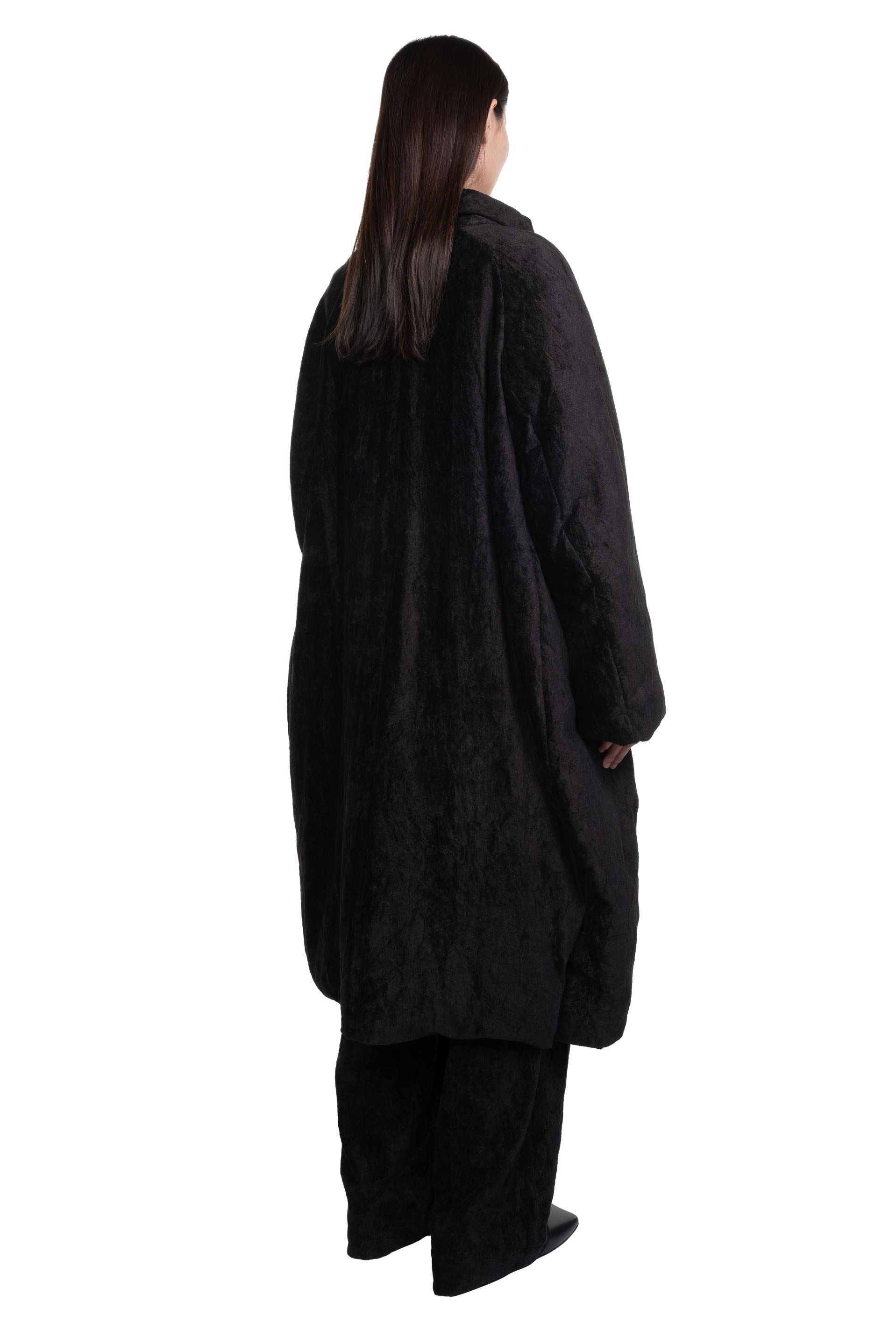 Velvet Jacquard duvet coat in black. Long sleeves. Raglan sleeves. Button closure at front. Two side pockets. Lightweight. Fully lined. Versatile collar.