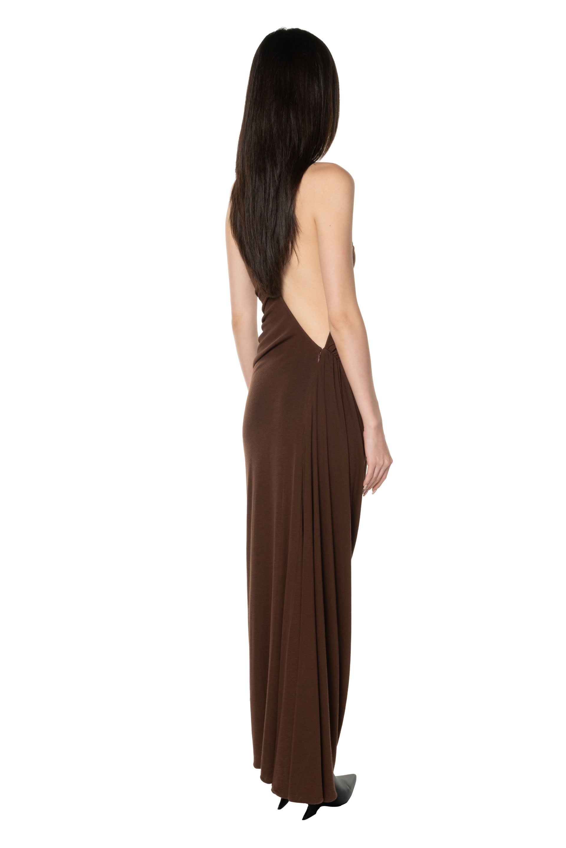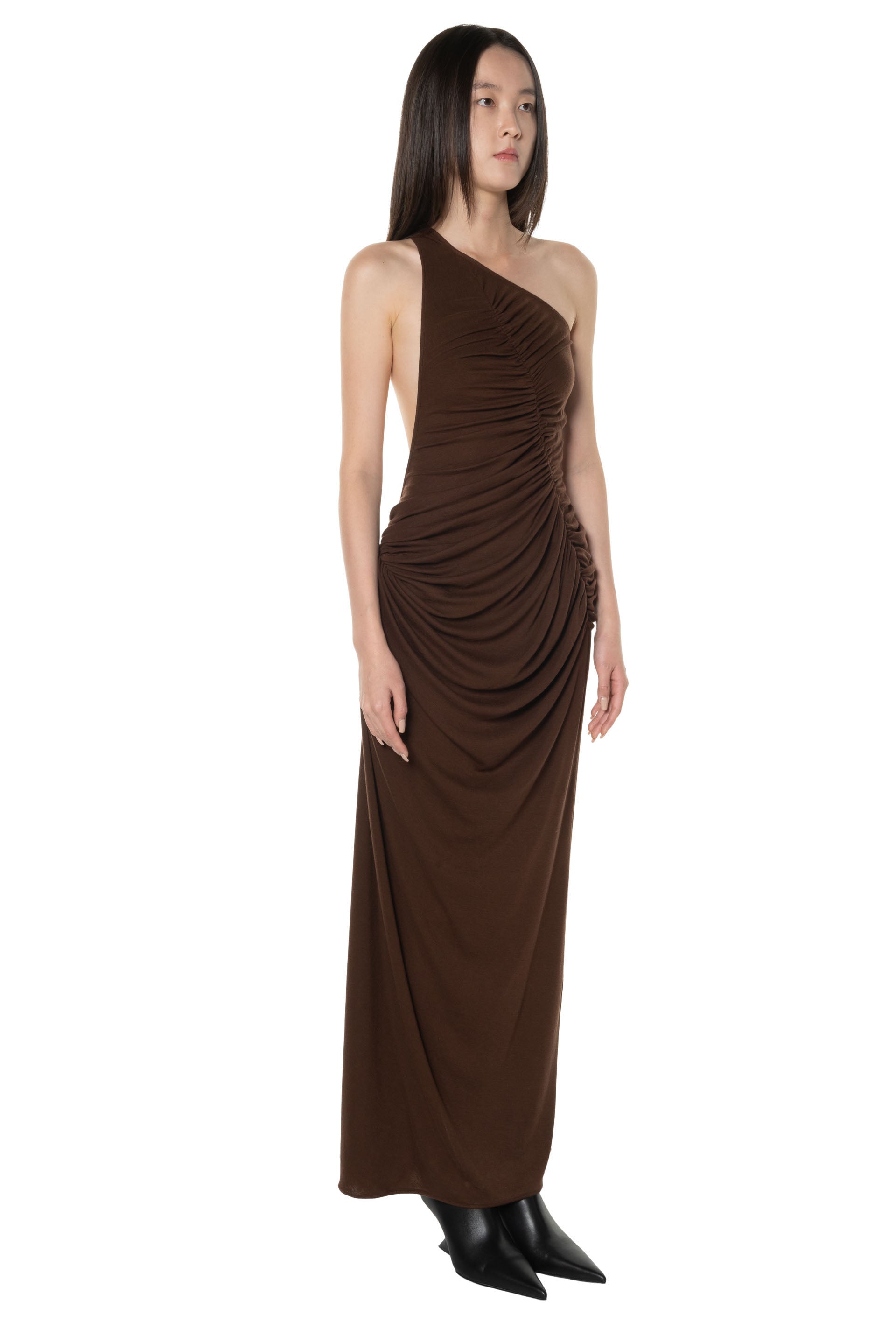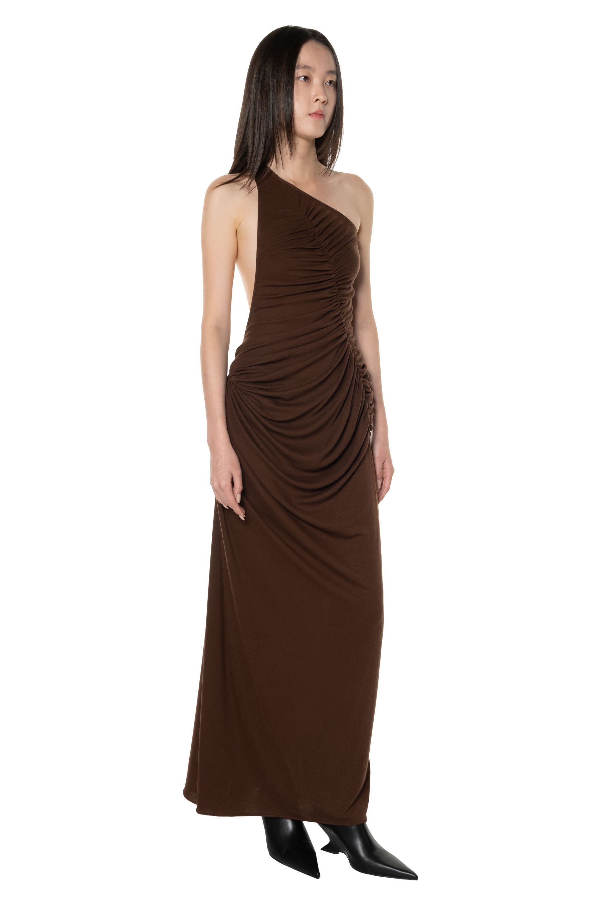 OUDE WAAG strikes a balance between Asian aesthetics and Western cutting. It is at the heart of designer’s philosophy: celebrating the power of women, yet simultaneously critiquing the ongoing objectification and idealisation of the body as you can see in the Oude Waag AW25 collection with the Venus Dress Reddish Brown.