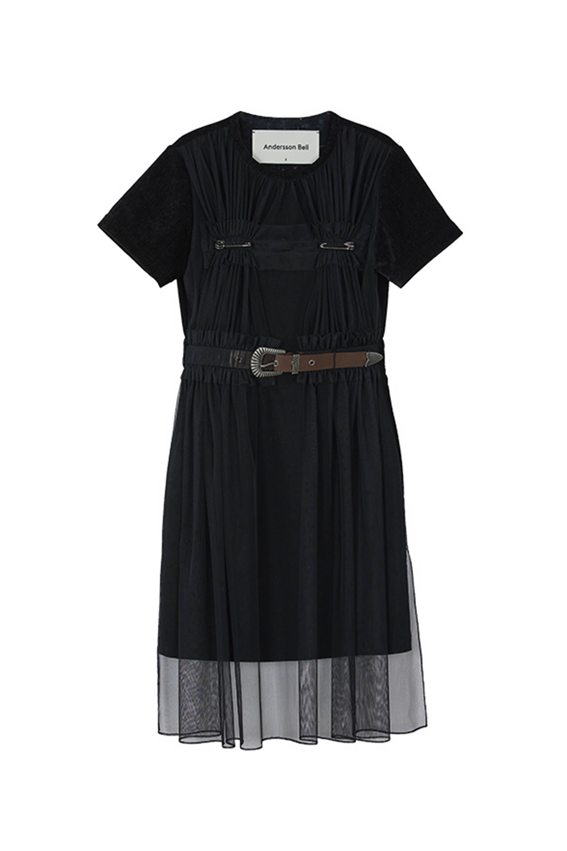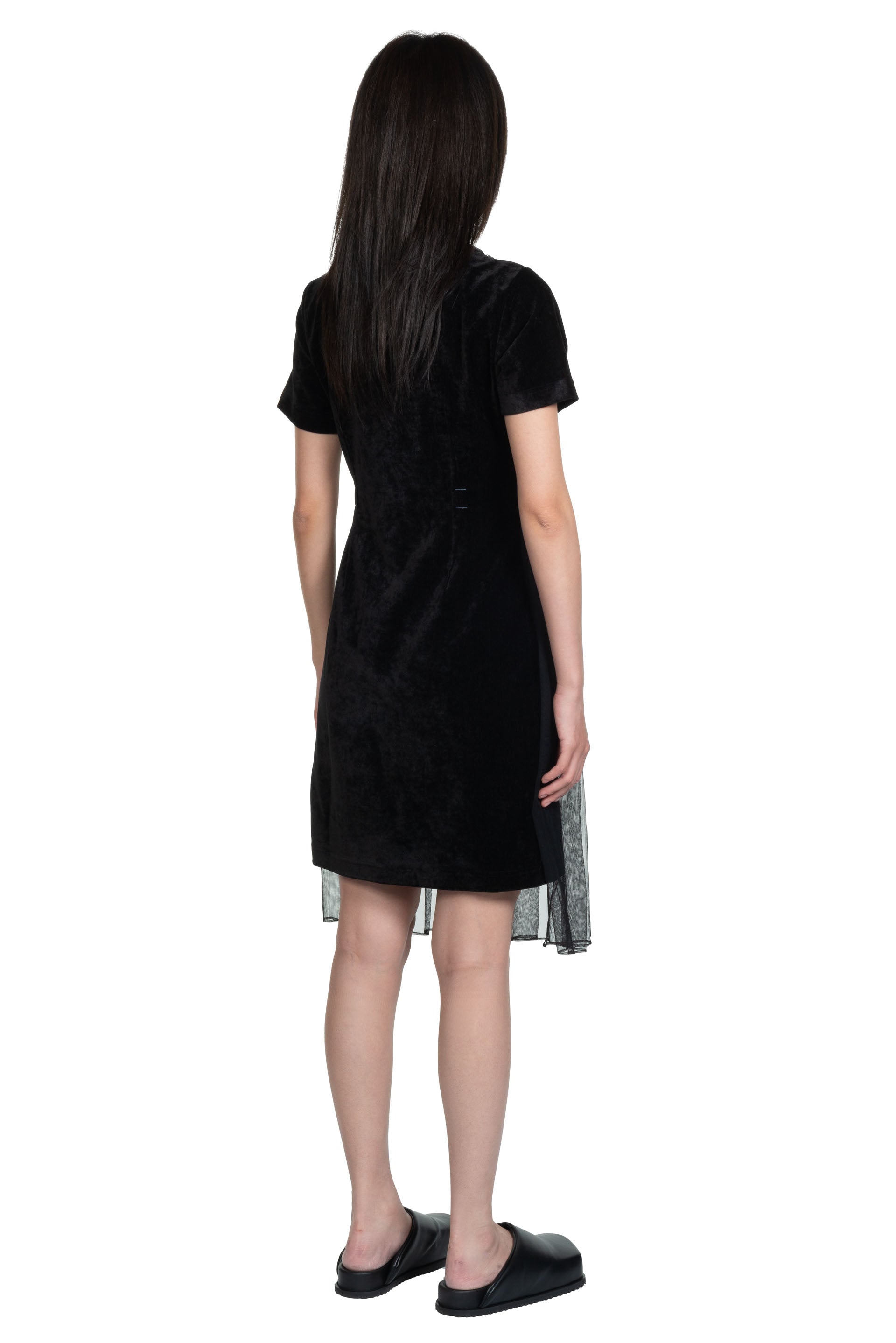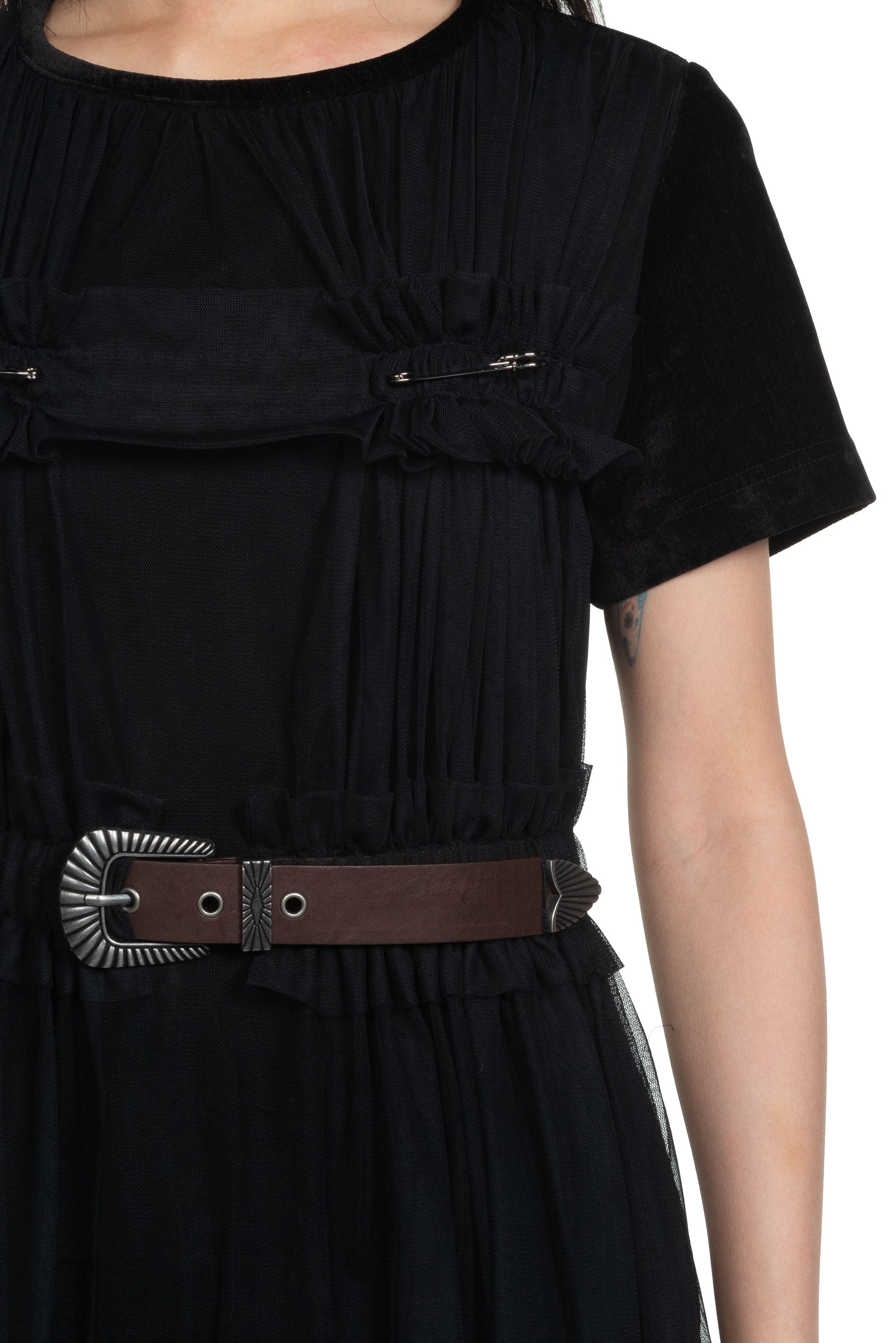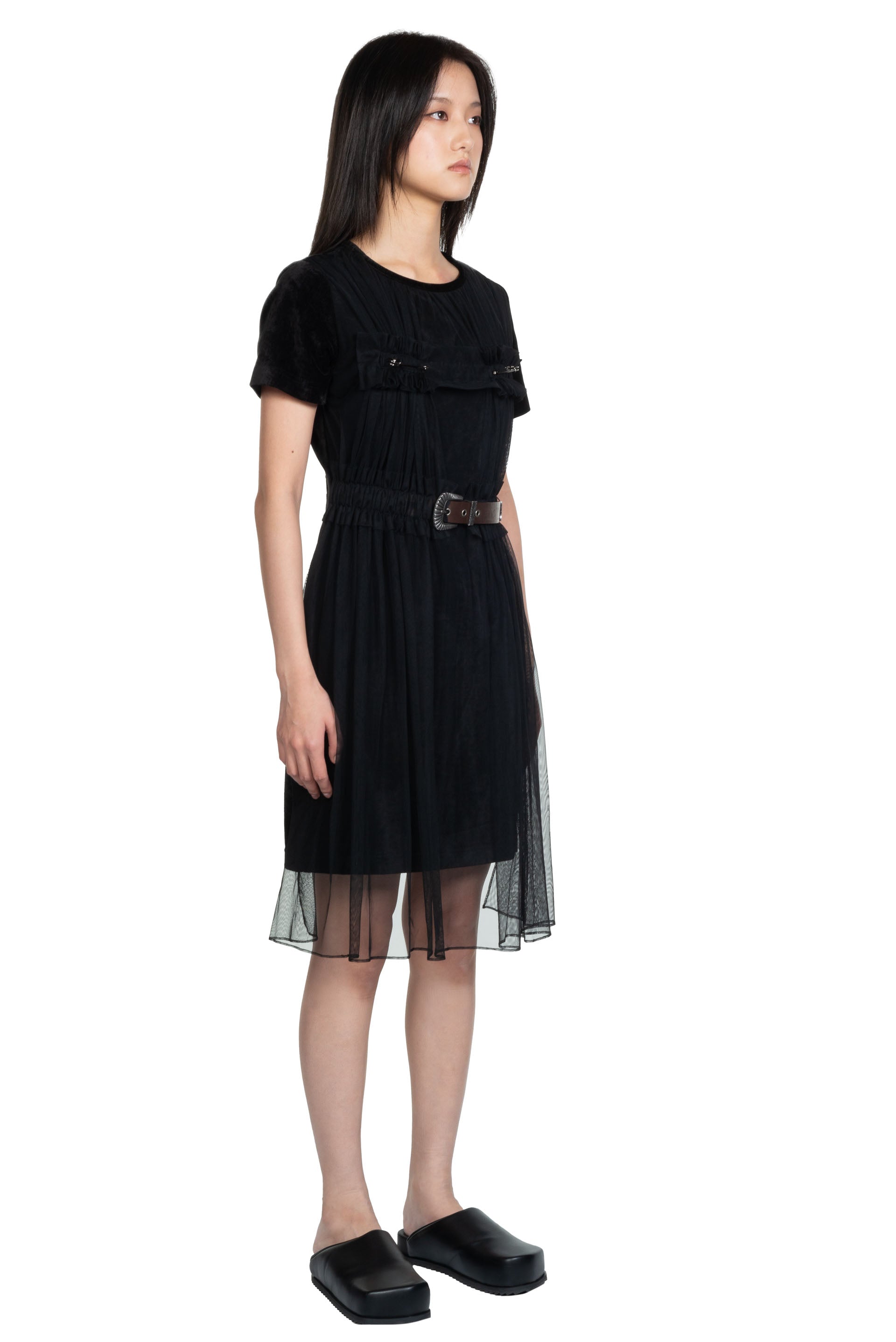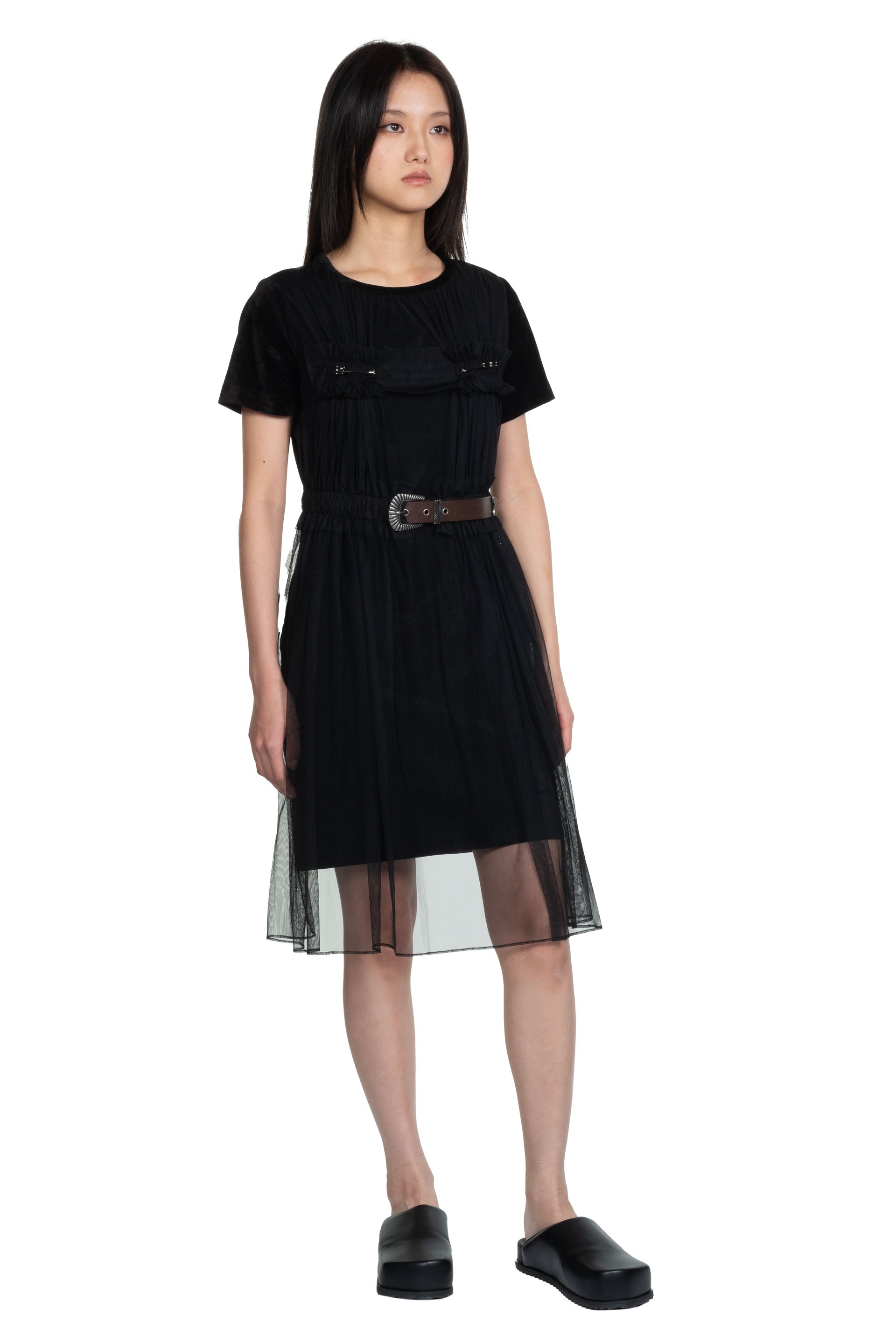 Fitted silhouette with leather belt at waist. Combination of soft and glassy velvet materials with see-through mesh.