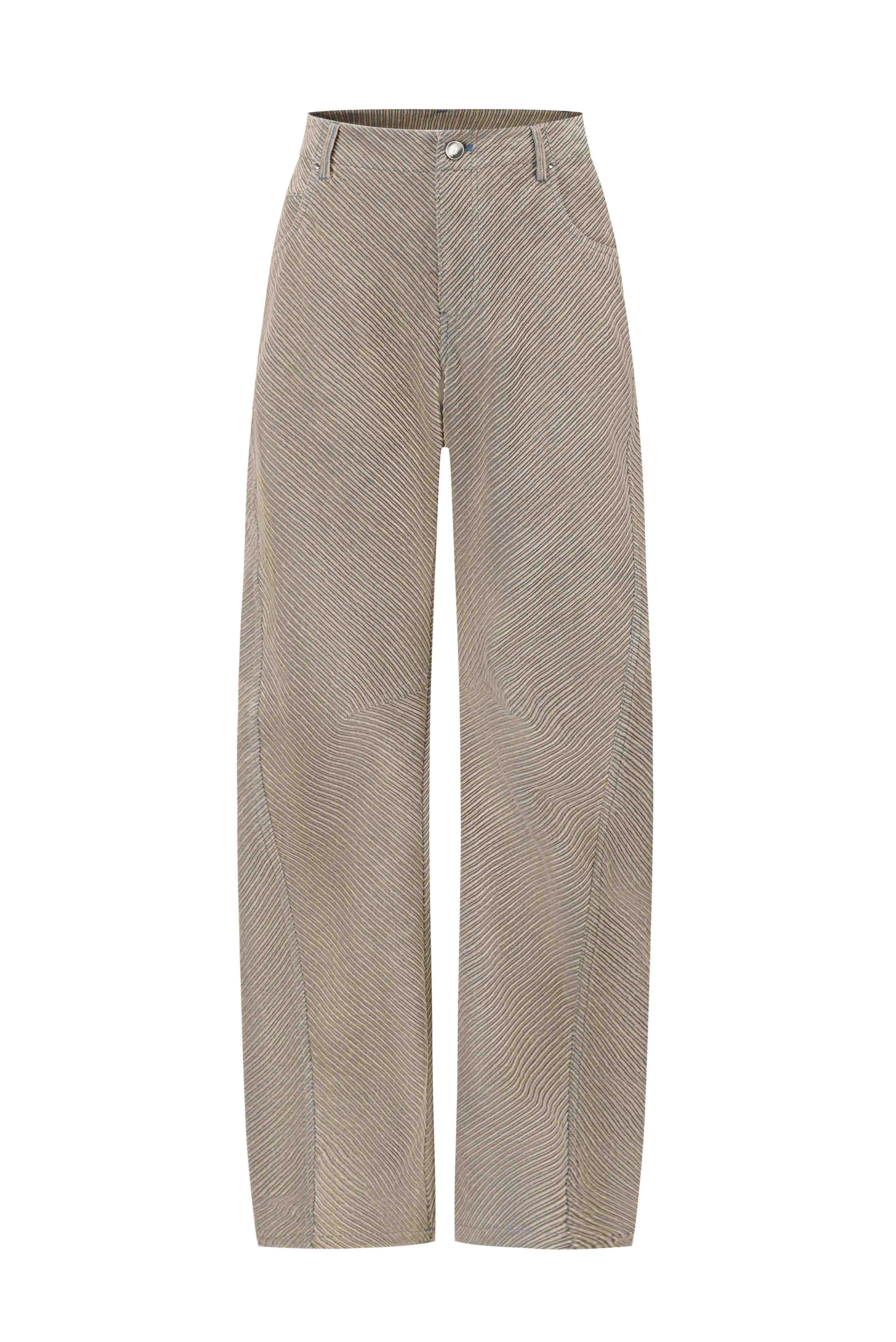 These pants are crafted from structured premium Japanese wale corduroy with a rich texture which feature a distinctive curved design that adds playful volume while maintaining a relaxed, casual vibe. The central front seam and cuff slits elongate the legs while adding striking details.
