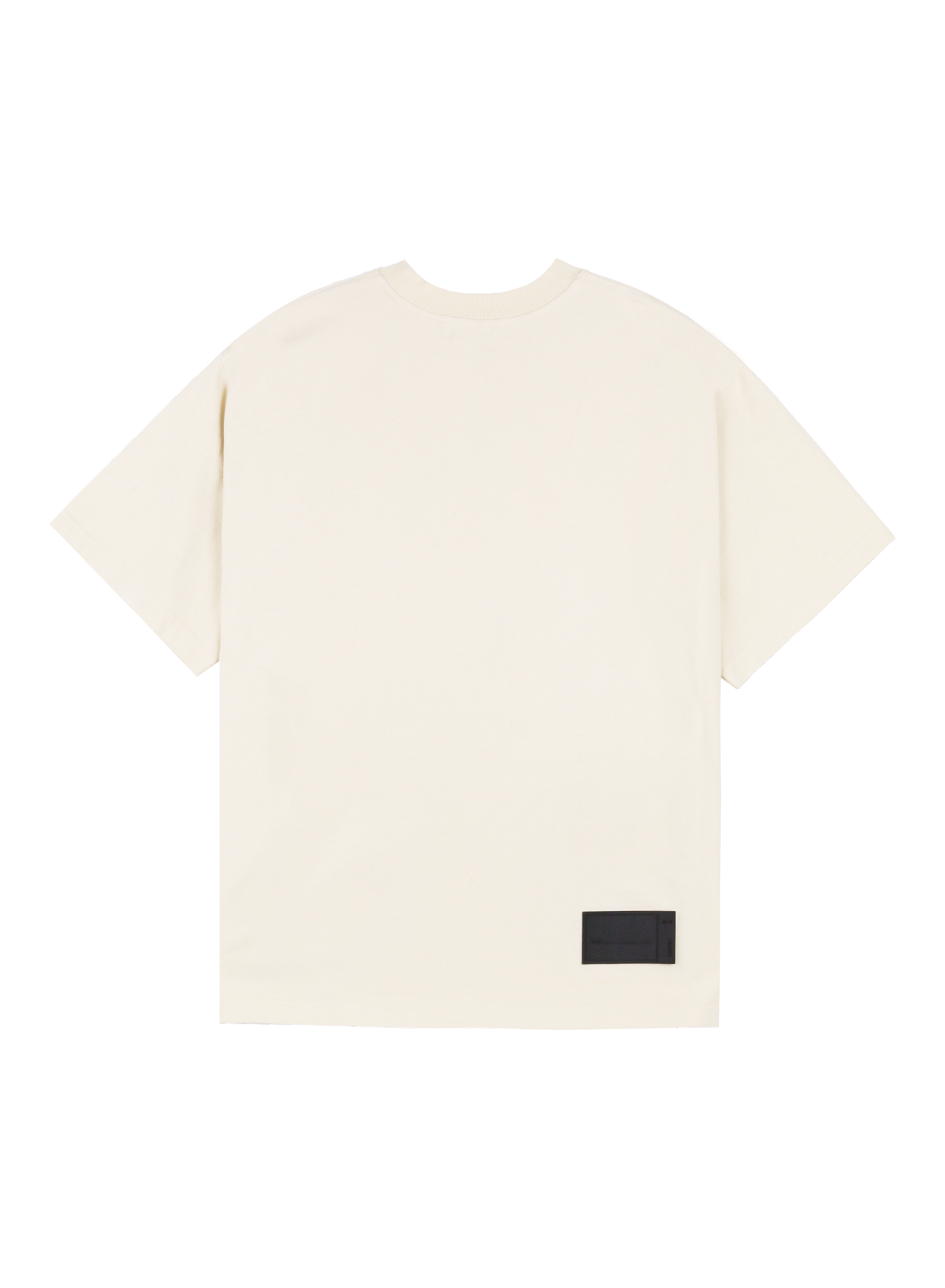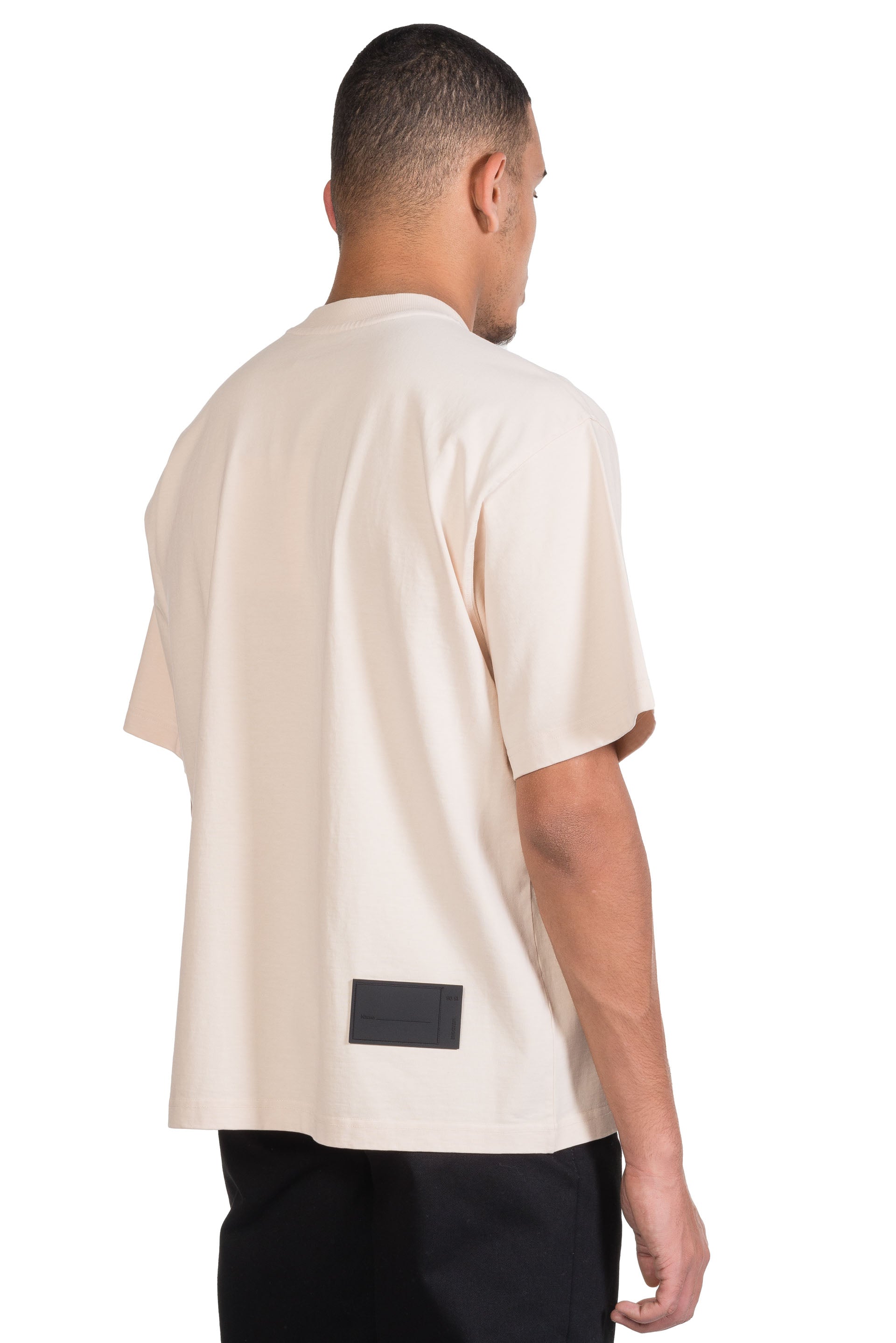 Short sleeve cotton jersey T-shirt in beige. Rib knit crewneck collar. Logo graphic bonded in black and tones of pink at front. Rubberized logo patch in black at back hem
