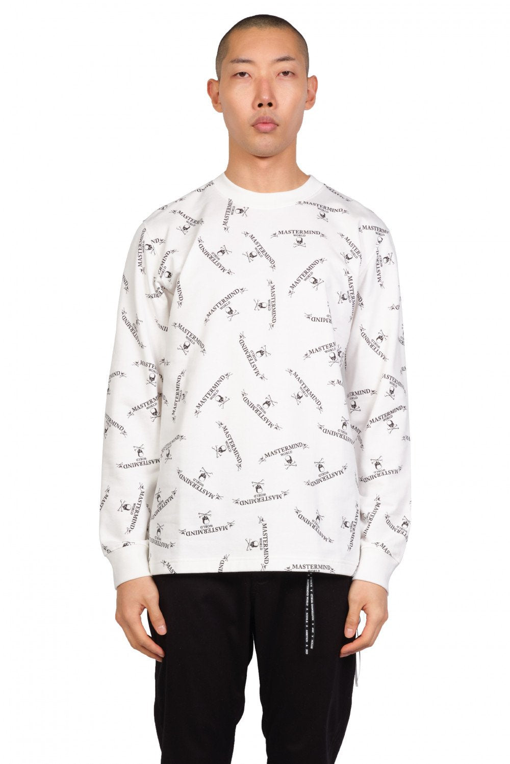 White featuring logo pattern printed in white throughout. Rib knit crewneck collar and cuffs. Textile logo patches in black at hem. Tonal stitching