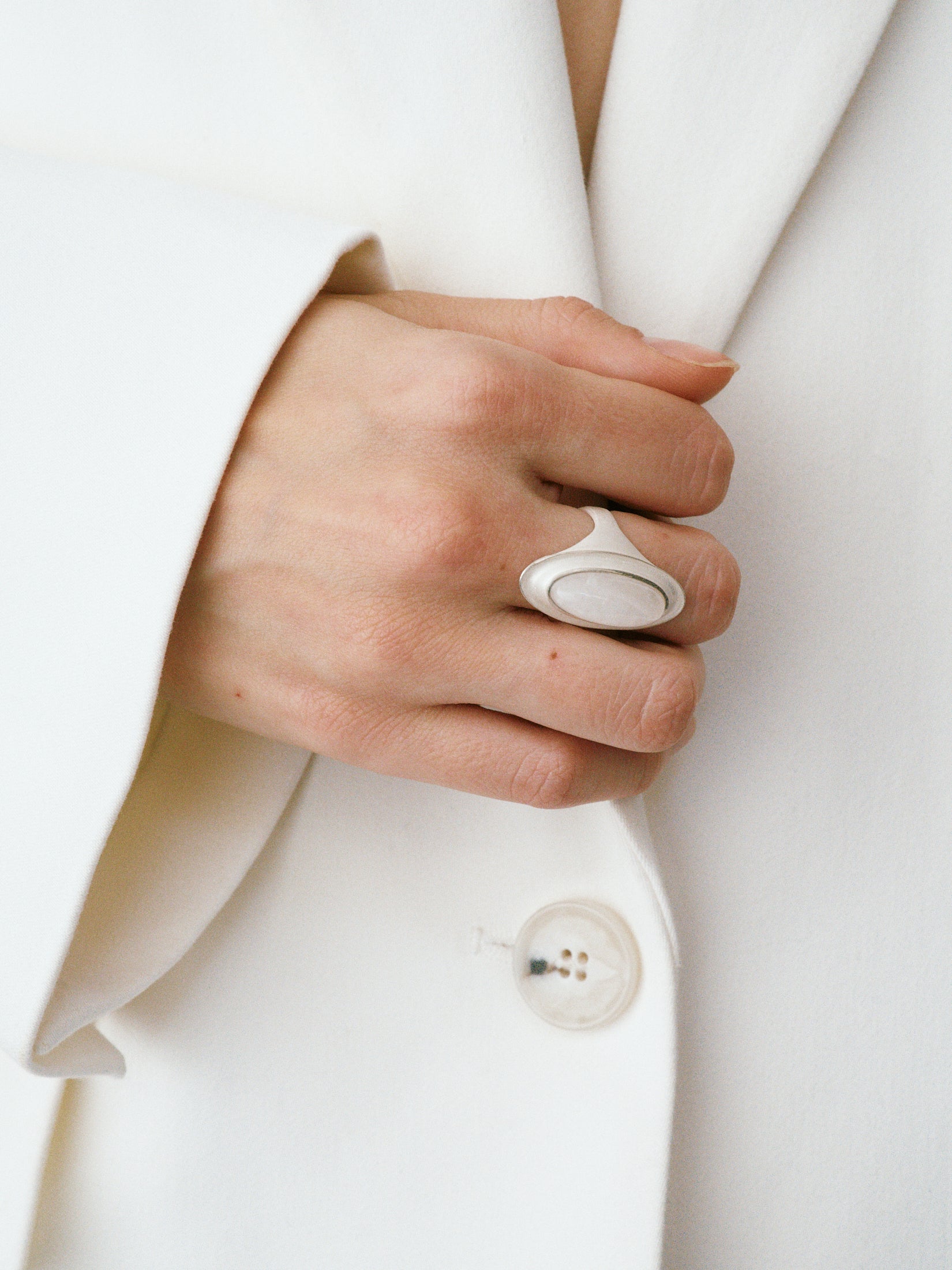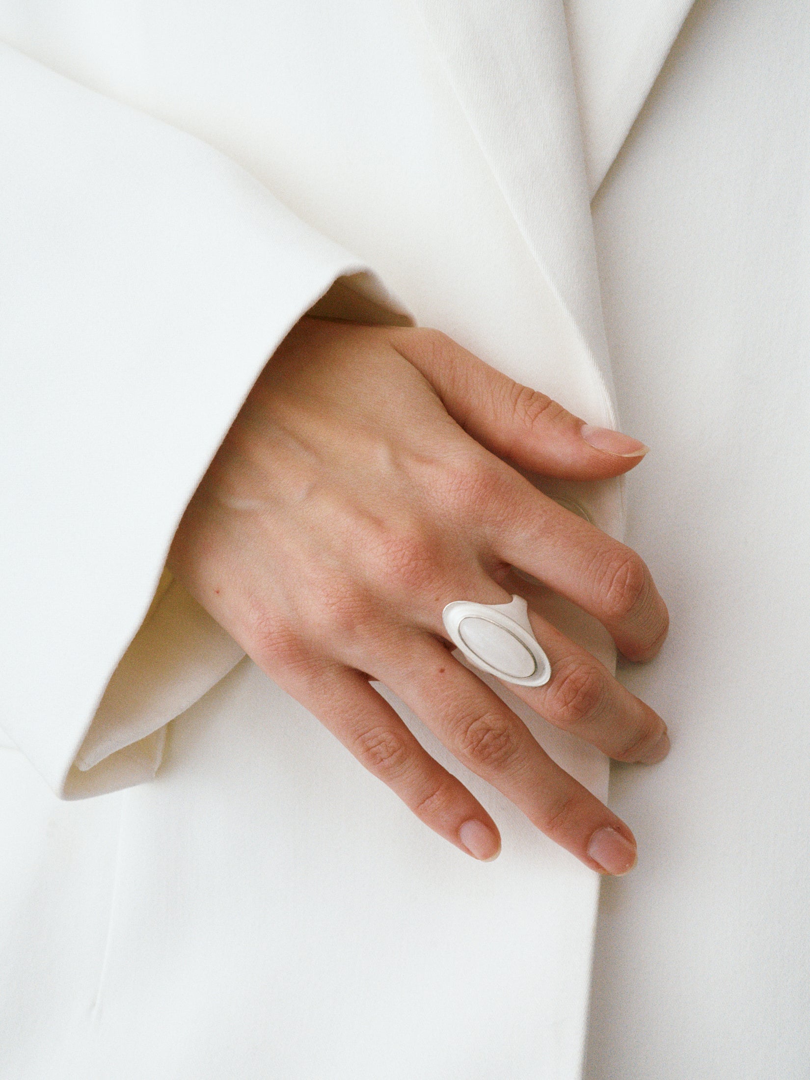 OLIO E ACETO is raw and authentic. It is about the companionship between people, and objects like the matte white surface becoming a blank canvas to be filled by the wearer as seen with the White Crystal Wave Ring.
