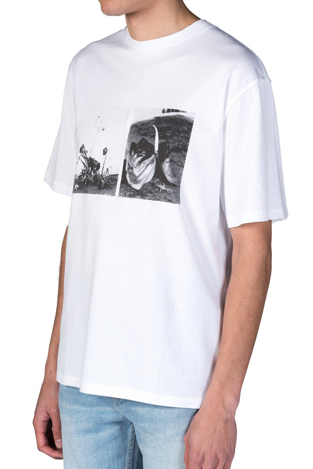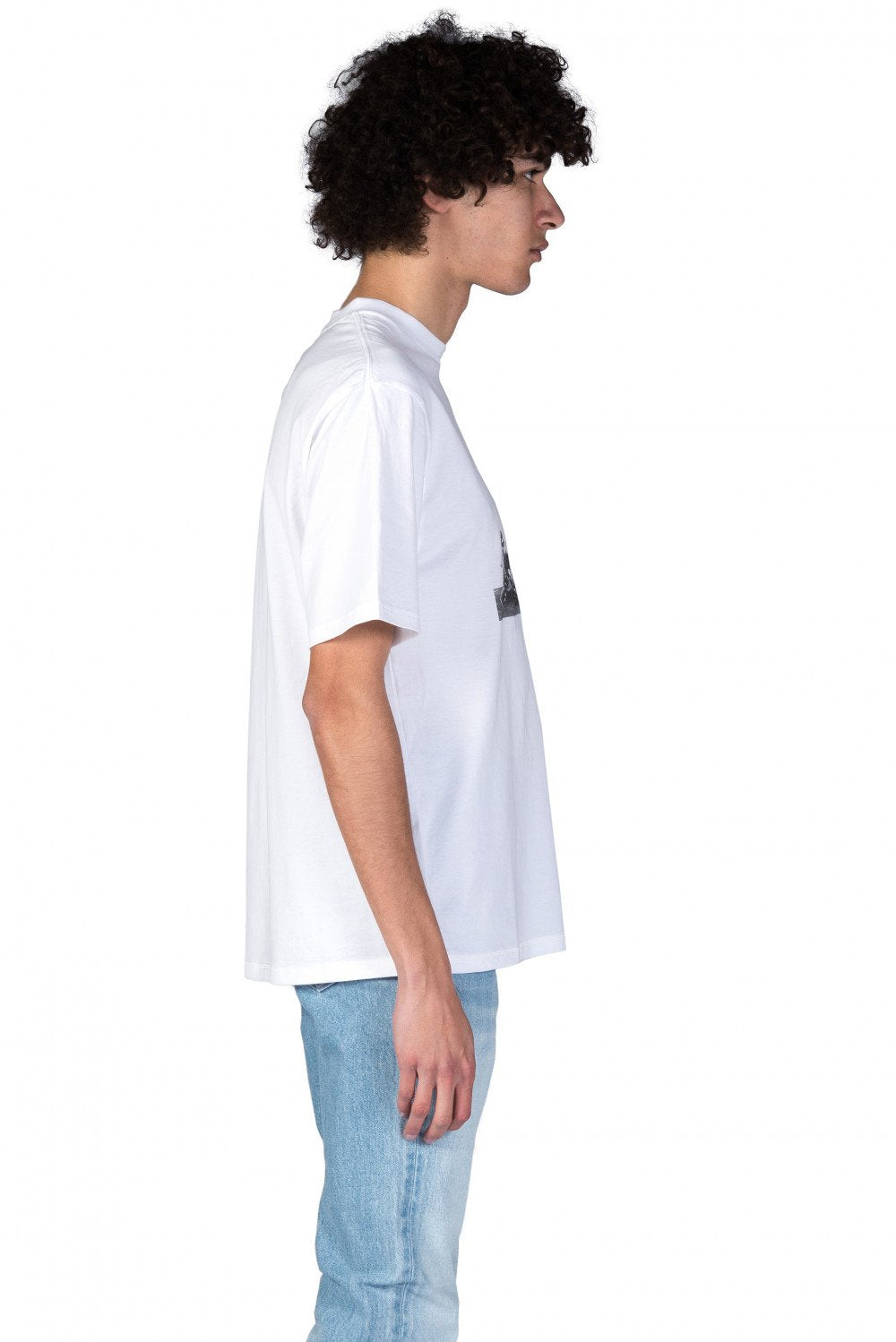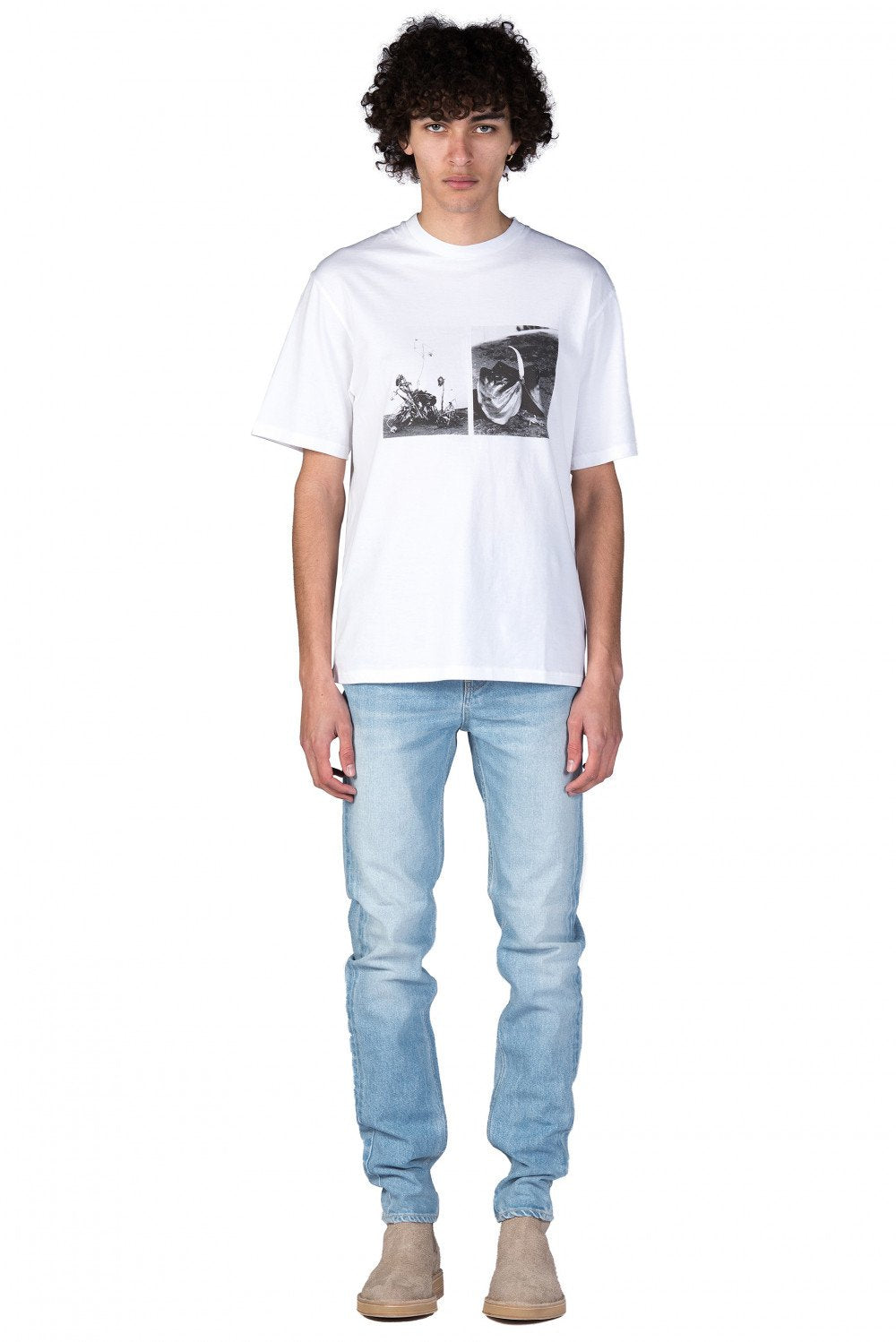 Rib knit crewneck collar. Graphic printed in tones of black and grey at front. Tonal stitching