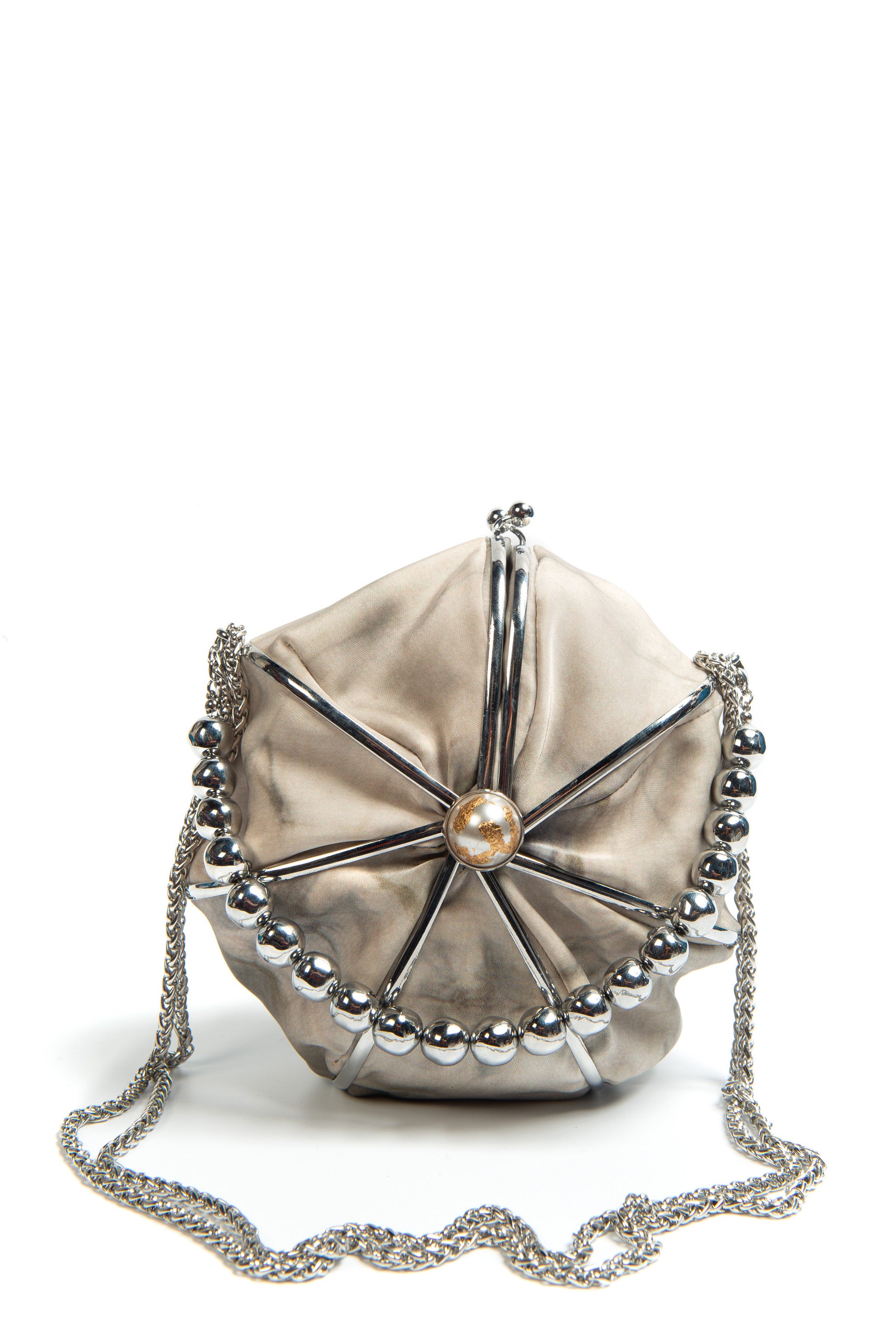Clasp closure at top. Silk lining with drawstrings closure inside. Pearl handle and metallic strap.