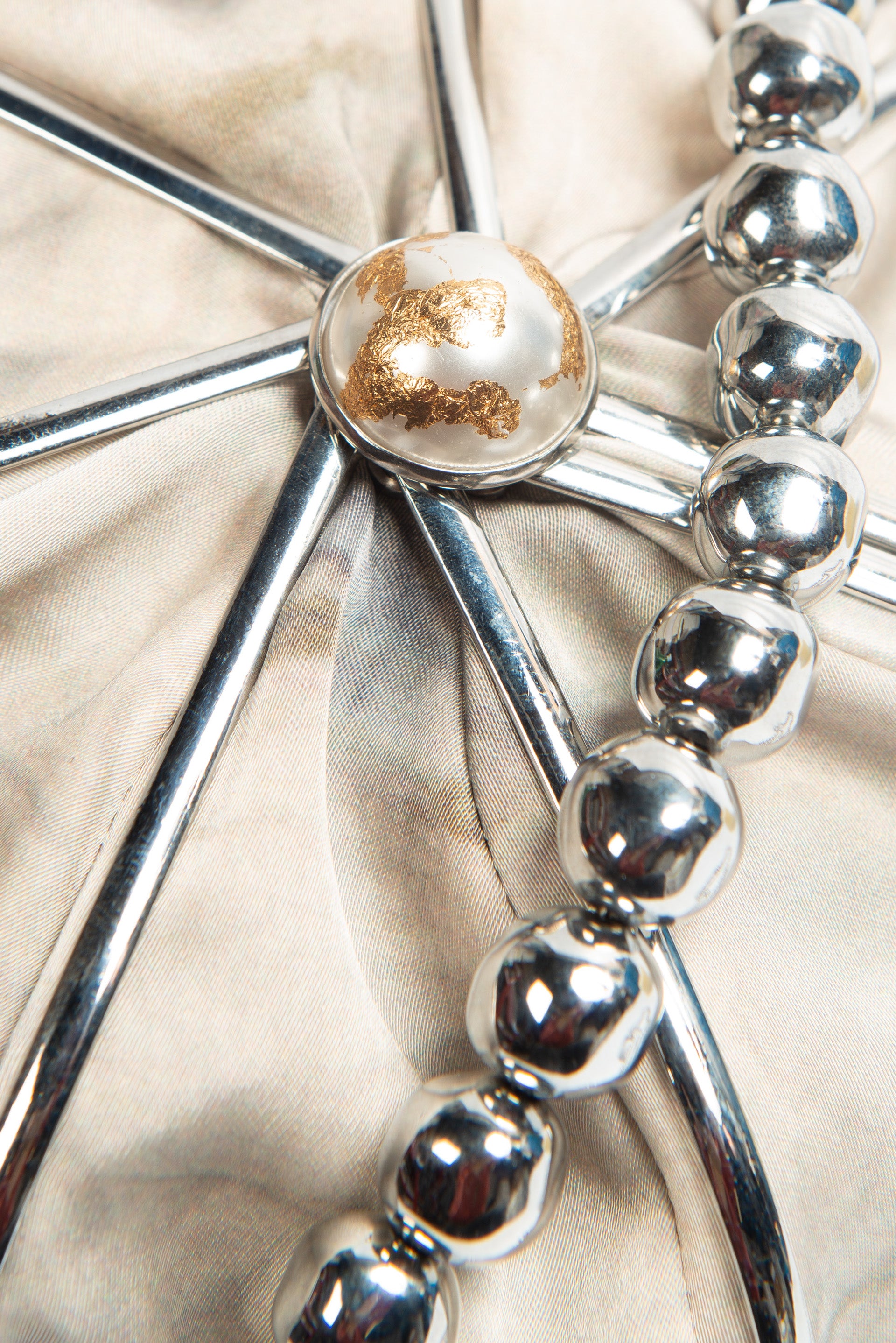 Peng Tai creates modern silhouette with traditional chinese philosophy. Inspired by how Chinese herbal medicine regulates the body from the inside out, Peng Tai aims to research and develop a way to boil Chinese herbal medicine with fabrics, to create clothes that feel like a second skin as seen with the White Silver Dyed Mesh Umbrella Purse.