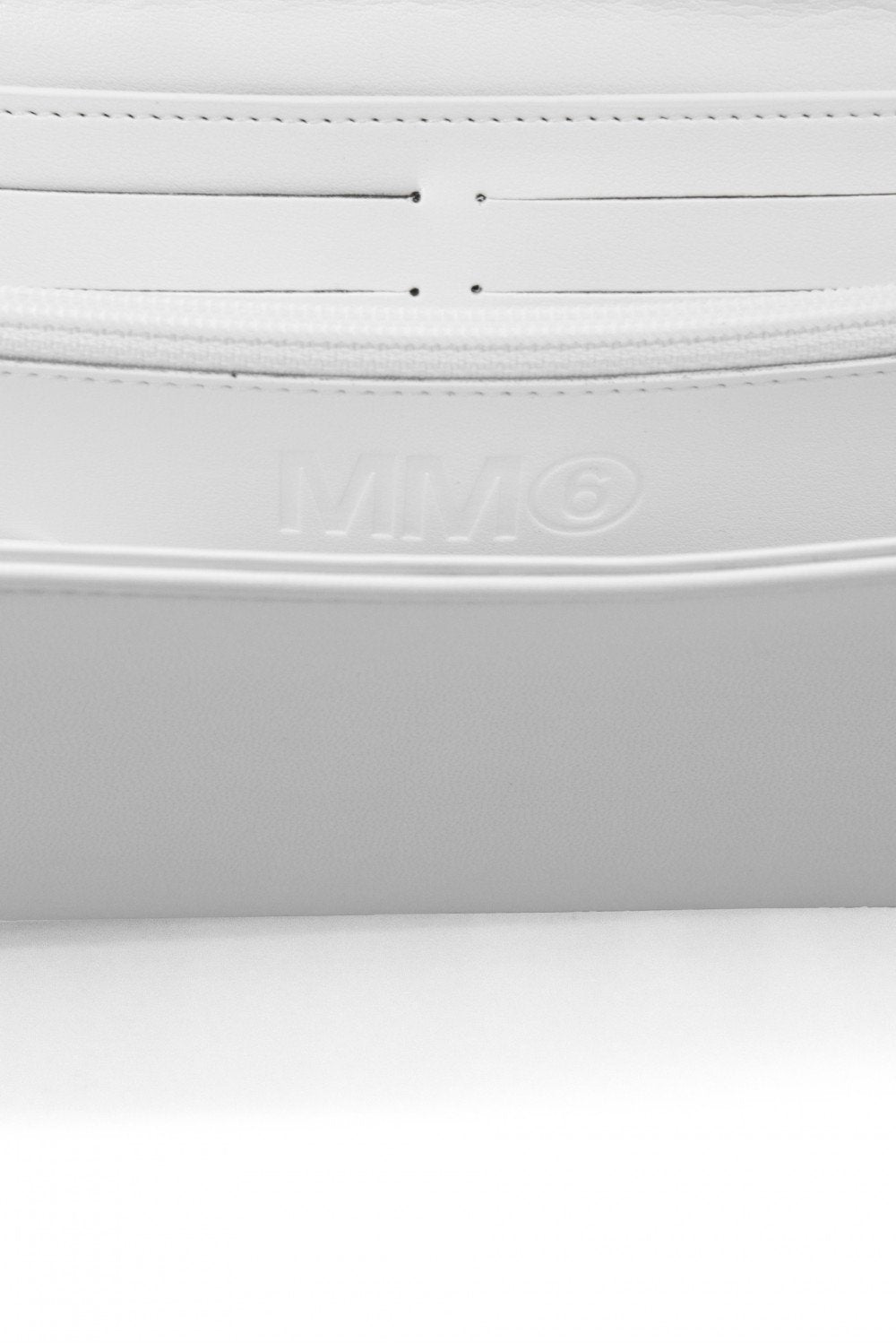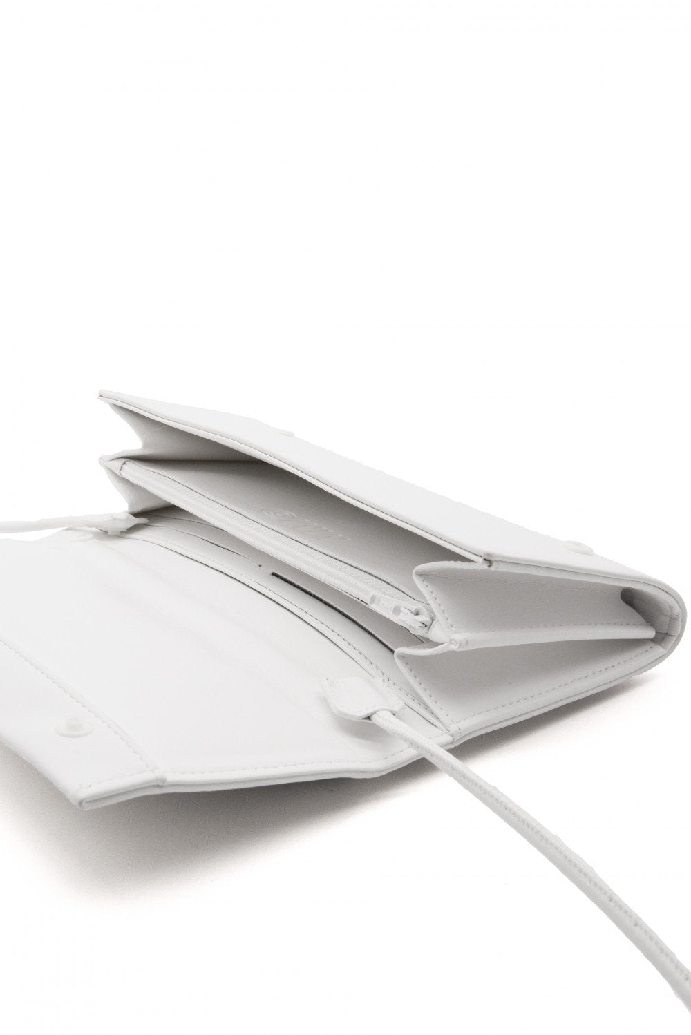 MM6 White Stitched Logo Wallet Crafted from white leather, it features an embroidered logo to the front, a foldover top with snap closure, an internal zipped pocket, multiple interior card slots and shoe lace shoulder strap.