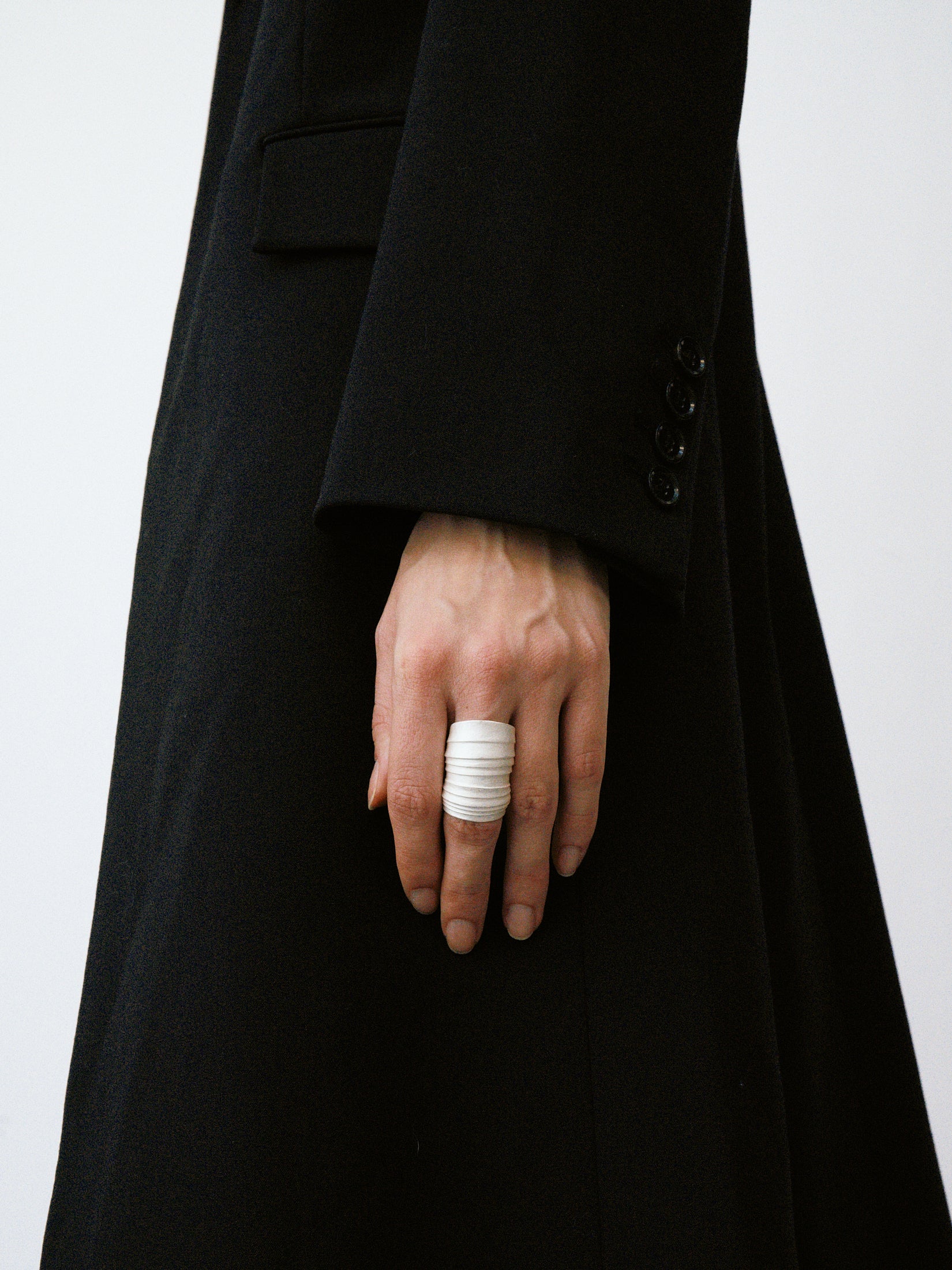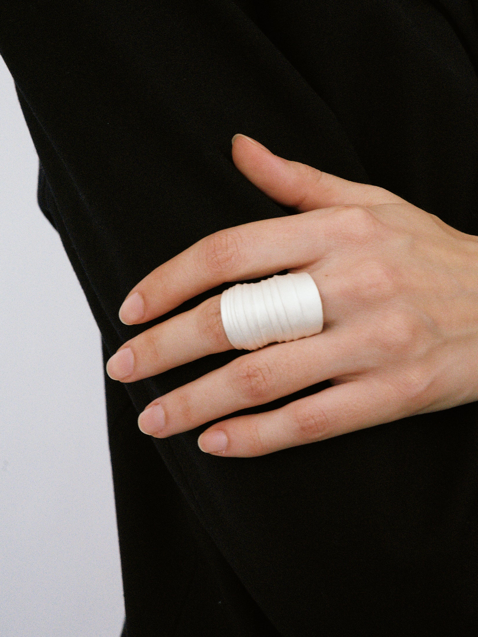 OLIO E ACETO is raw and authentic. It is about the companionship between people, and objects like the matte white surface becoming a blank canvas to be filled by the wearer as seen with the Wide Carved Ring.