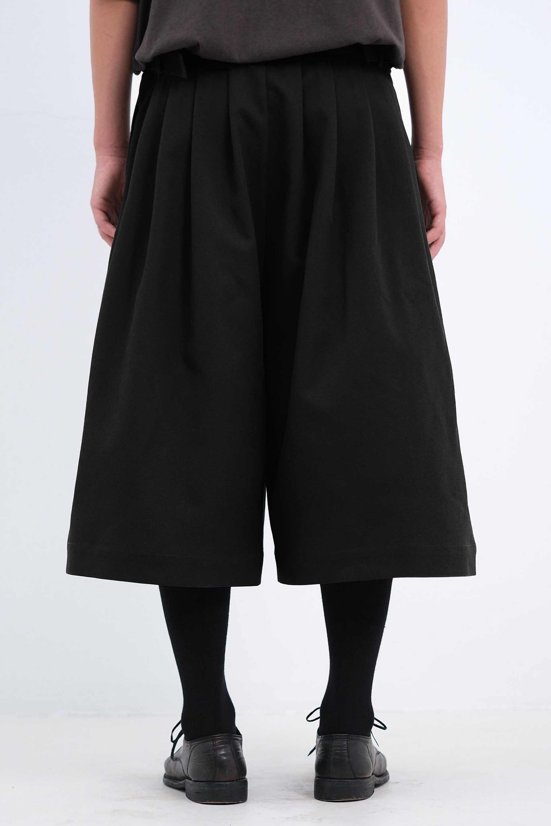 Attempt Wide Leg Short Black. Button closure at waist. Two side pockets. Two back pockets. Wide fit. Below the knee length. Textural canvas like fabric. Pleated at front and back.