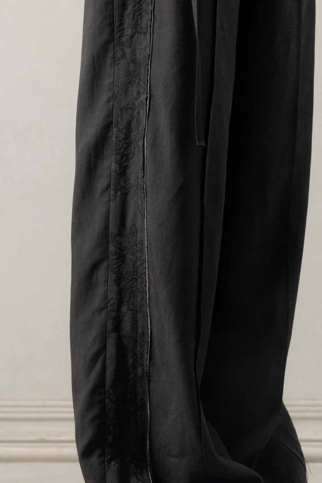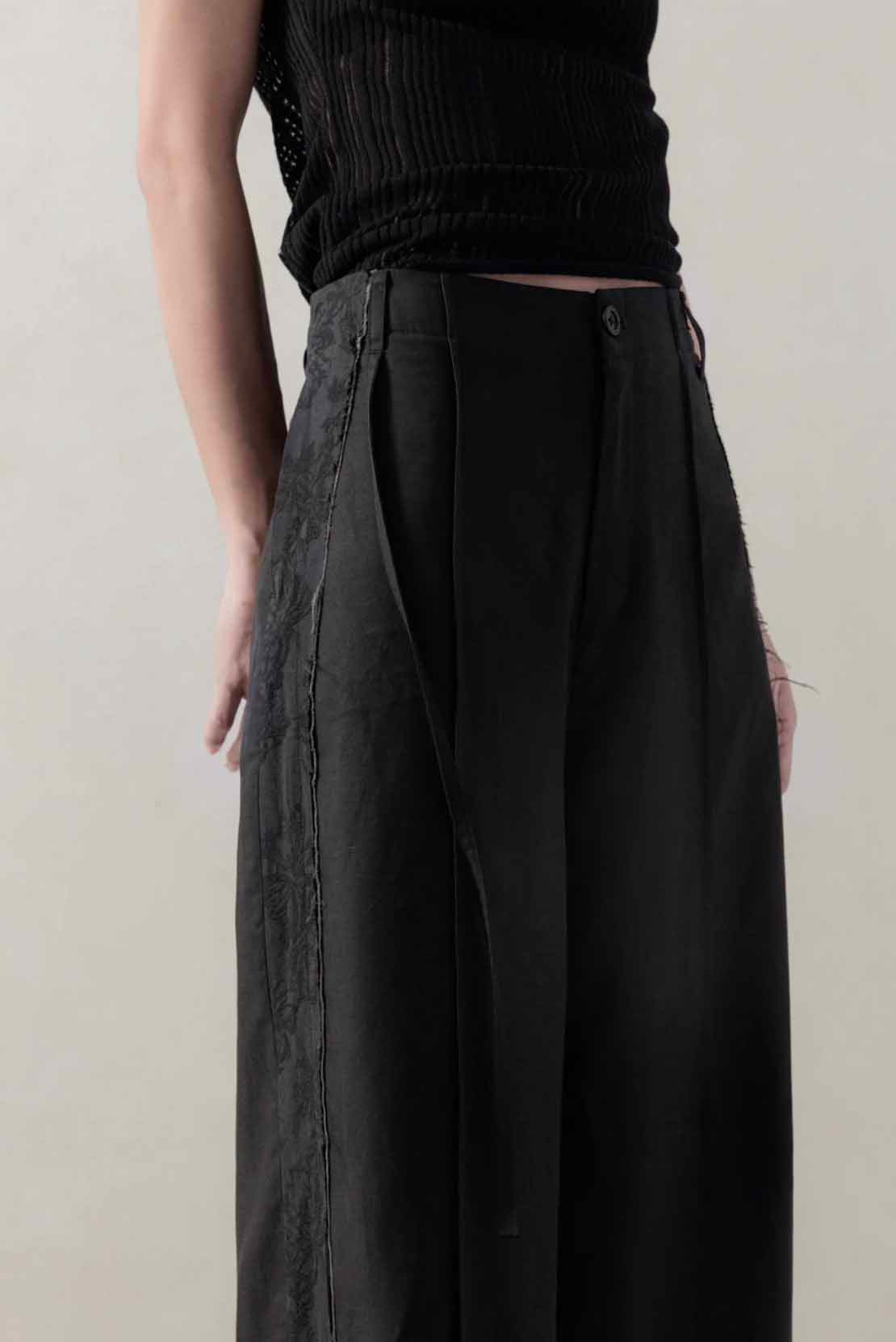 Professor. E understands the time of aesthetics from the use of cotton, hemp and wool. Fabric stitching, patching, designs without edge trimming, deconstruction, and reproduction are all Professor. E's signature elements creating classic immortal designs that can be viewed with the Wide Pants Black