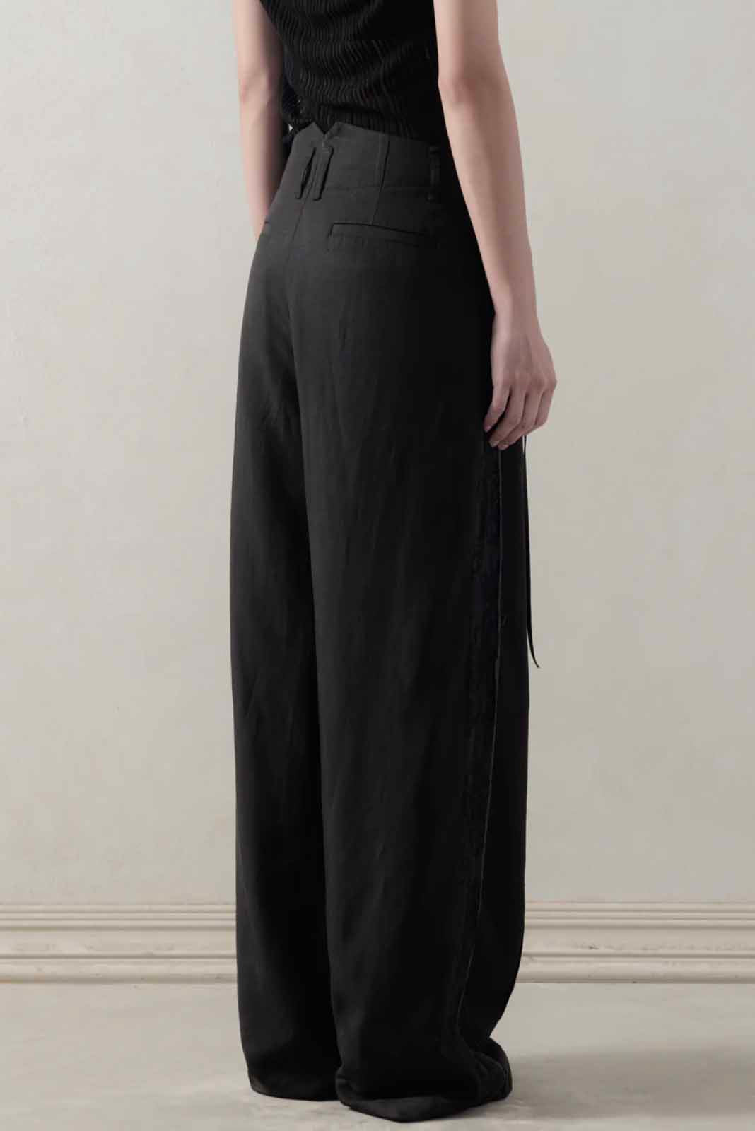 Professor e Wide pants. Continuing the brand’s classic everyday pants, the relaxed yet tailored straight-leg cut balances comfort with a flattering fit. Made from soft, smooth Tencel linen, the jacquard texture and gray edged seams add rich, subtle depth to the dark tones.