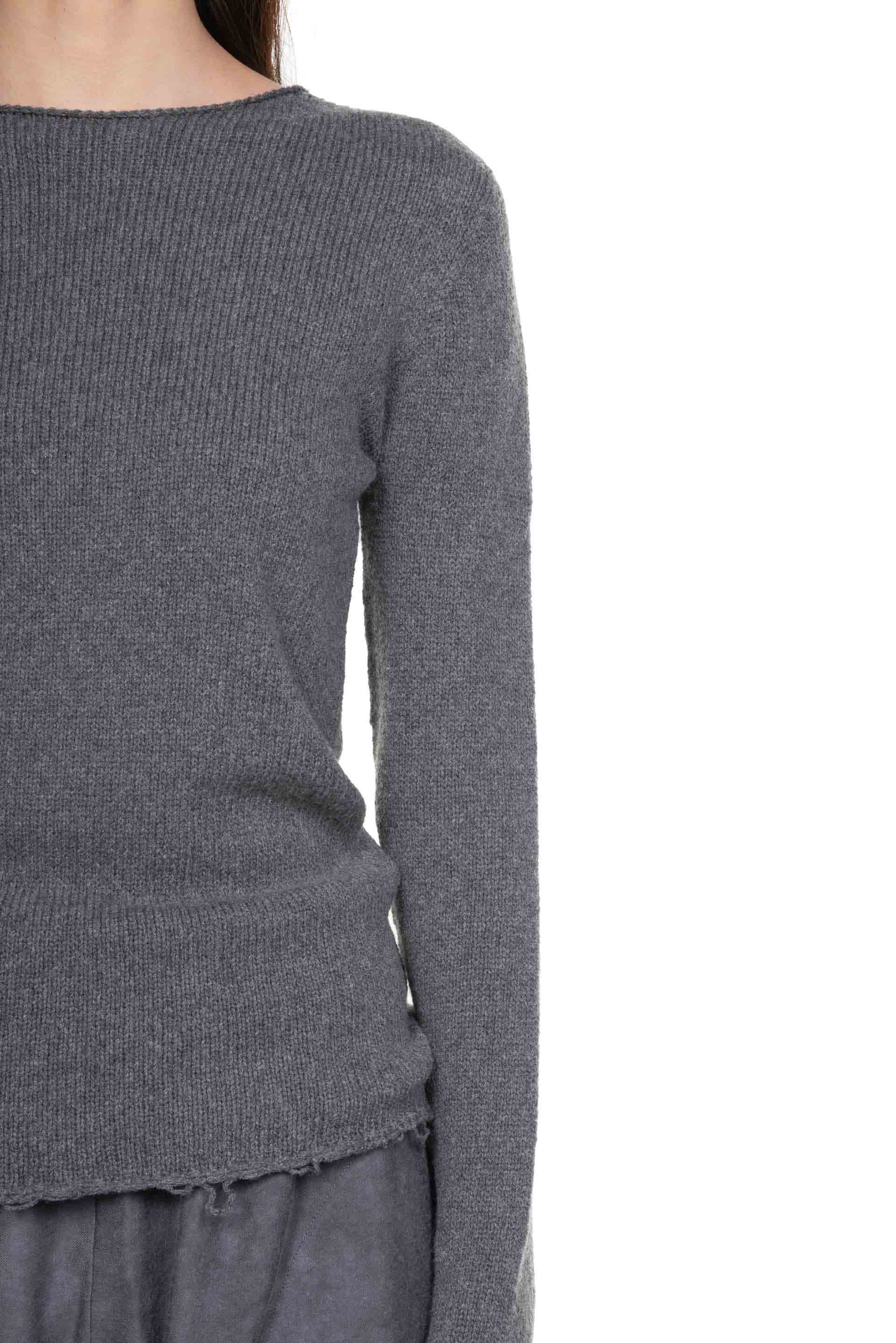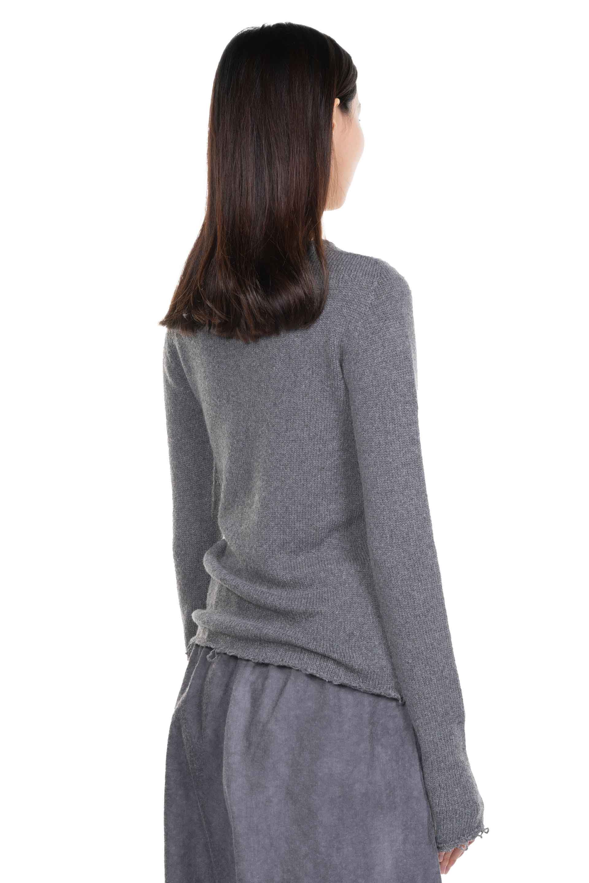 Cortana knitwear jumper in grey melange. Soft feel wool. Crew neck sweater with long sleeves and frayed finishes, made with a yarn that combines wool and cashmere. Cortana knitwear is carefully selected from the highest quality natural fibres. The garments are made in small, specialised workshops in the Italian region of Reggio Emilia, which maintain a traditional approach.
