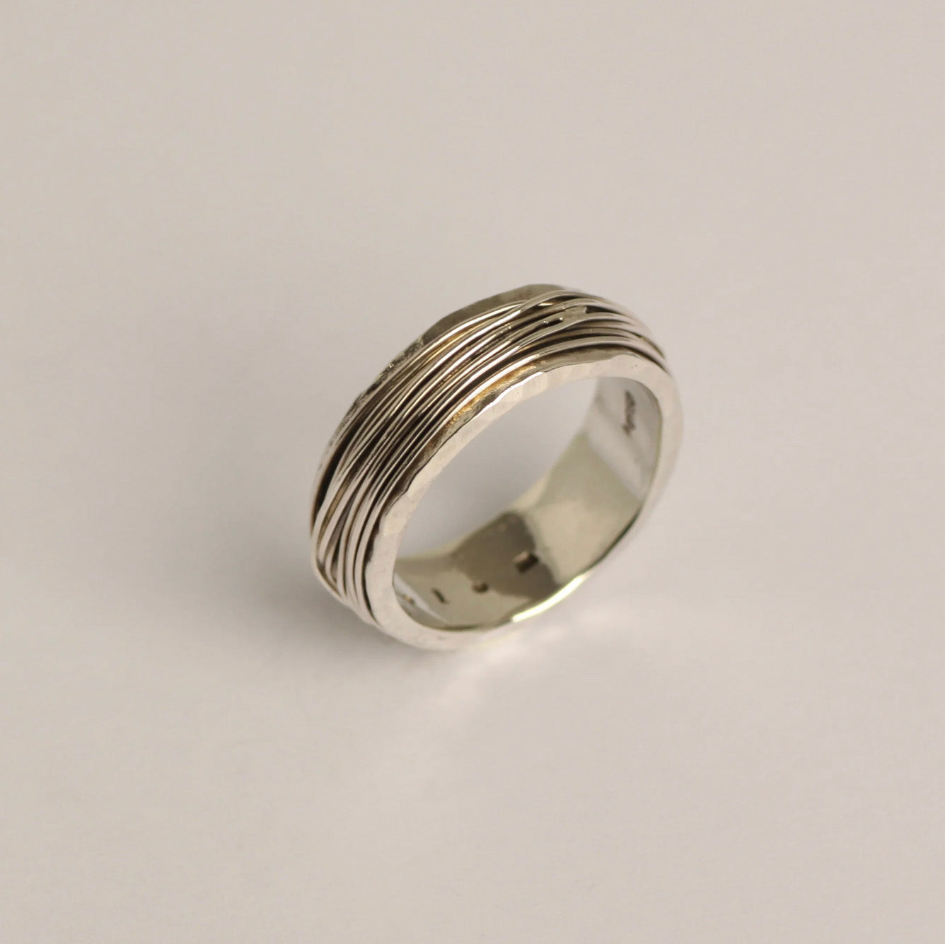 The iolom Wire Coil Ring features a sculptural, coiled design that blends rusted and silvered surfaces, celebrating the beauty of imperfection and material transformation. Forged with traditional techniques, each piece emphasizes texture, tactility, and thoughtful craftsmanship.