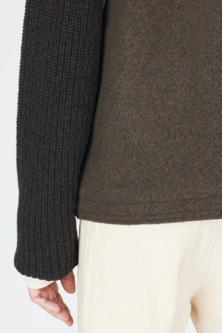 Isabel Benenato is committed to sustainability and makes every effort to minimise its environmental footprint. All of the collection are manufactured in Italy with the intention to save and support her local community. Her design is based on an imperfect perfection that encompasses the human being itself as seen with the Wool Bomber Jacket Knit Sleeves.