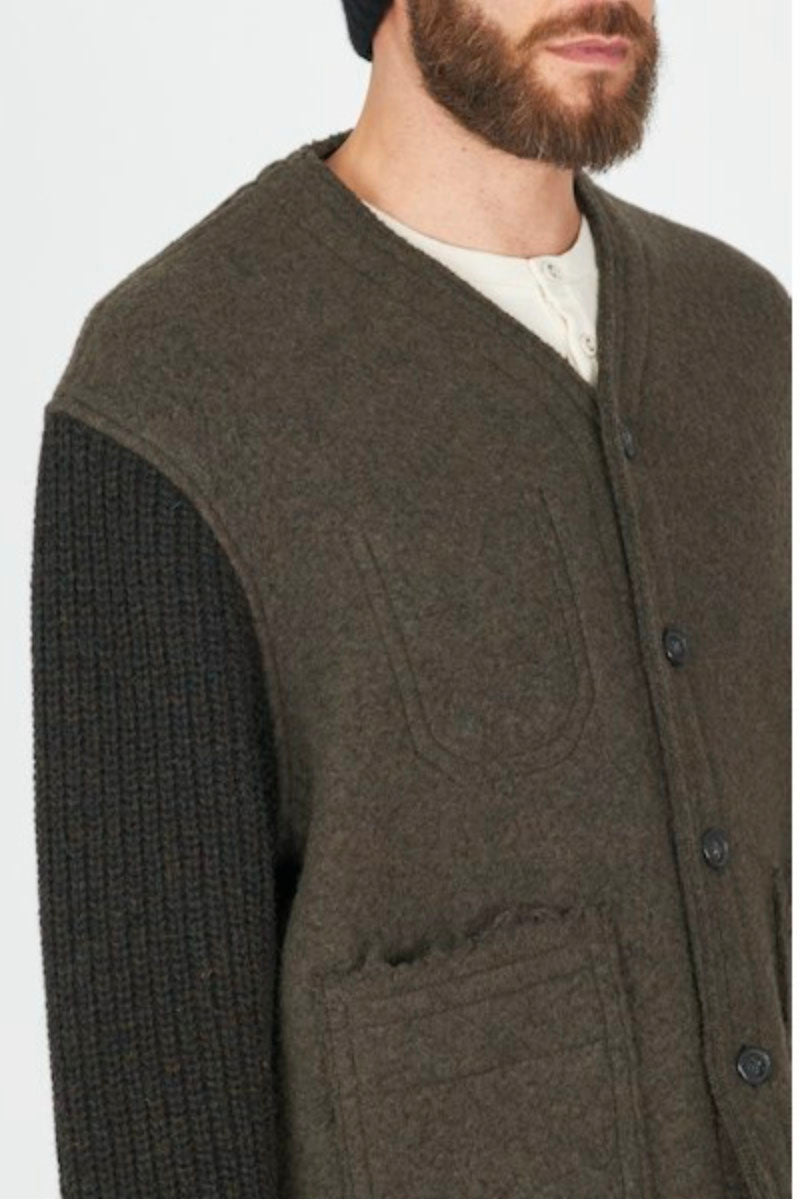 Long sleeves. Button closure at front. Knitted Sleeves. Two side knitted patch pockets. Boxy Cut.