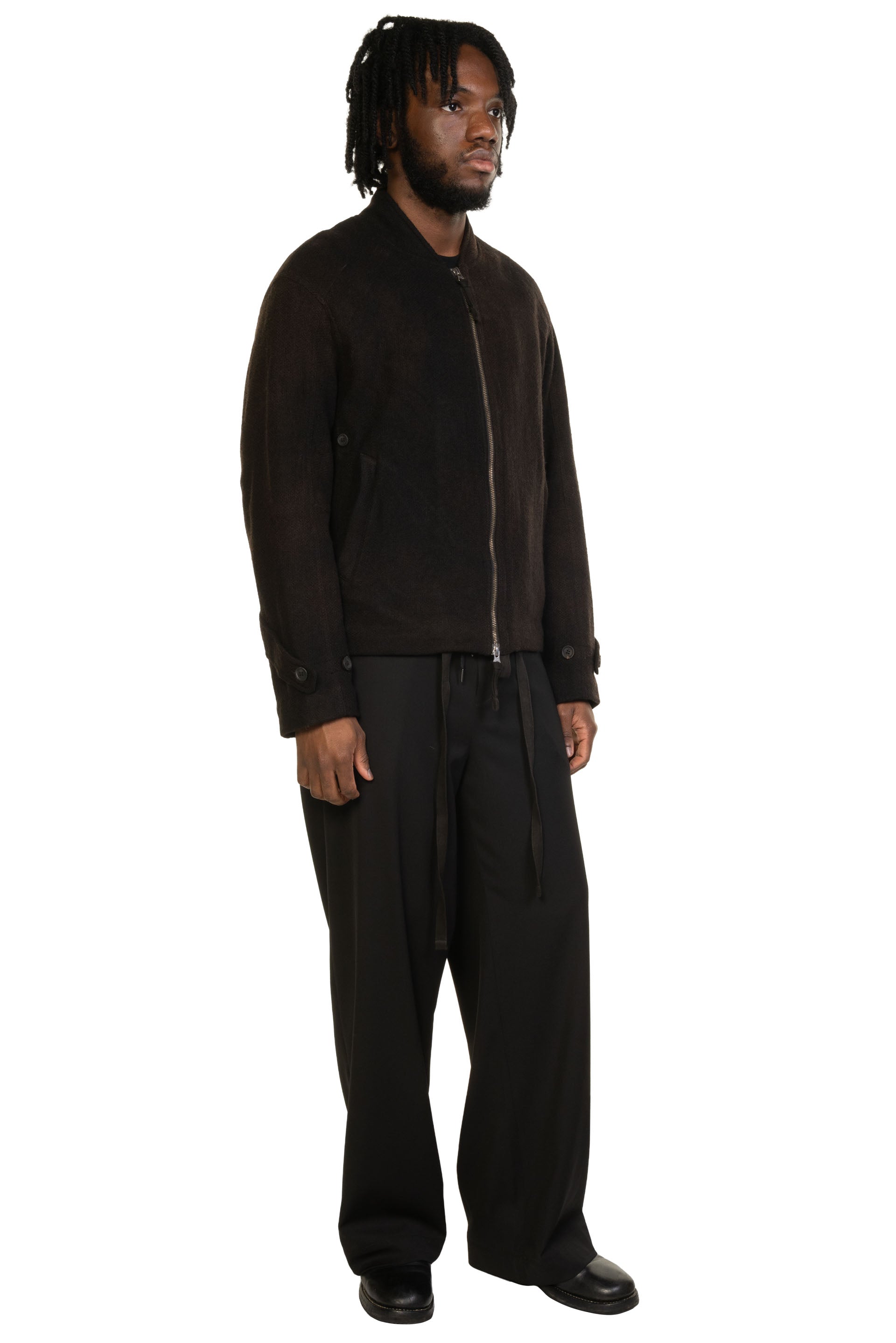 ATTEMPT reconstructs different styles and elements to create a new aesthetic system. By taking a more experimental approach to creation and production, which involves an understanding of the past and the current form of society, Attempt is creating an aesthetic form that is anchored in the present but different from it. It must ultimately be a product that cannot be defined as seen with the Wool Flight Jacket Brown.