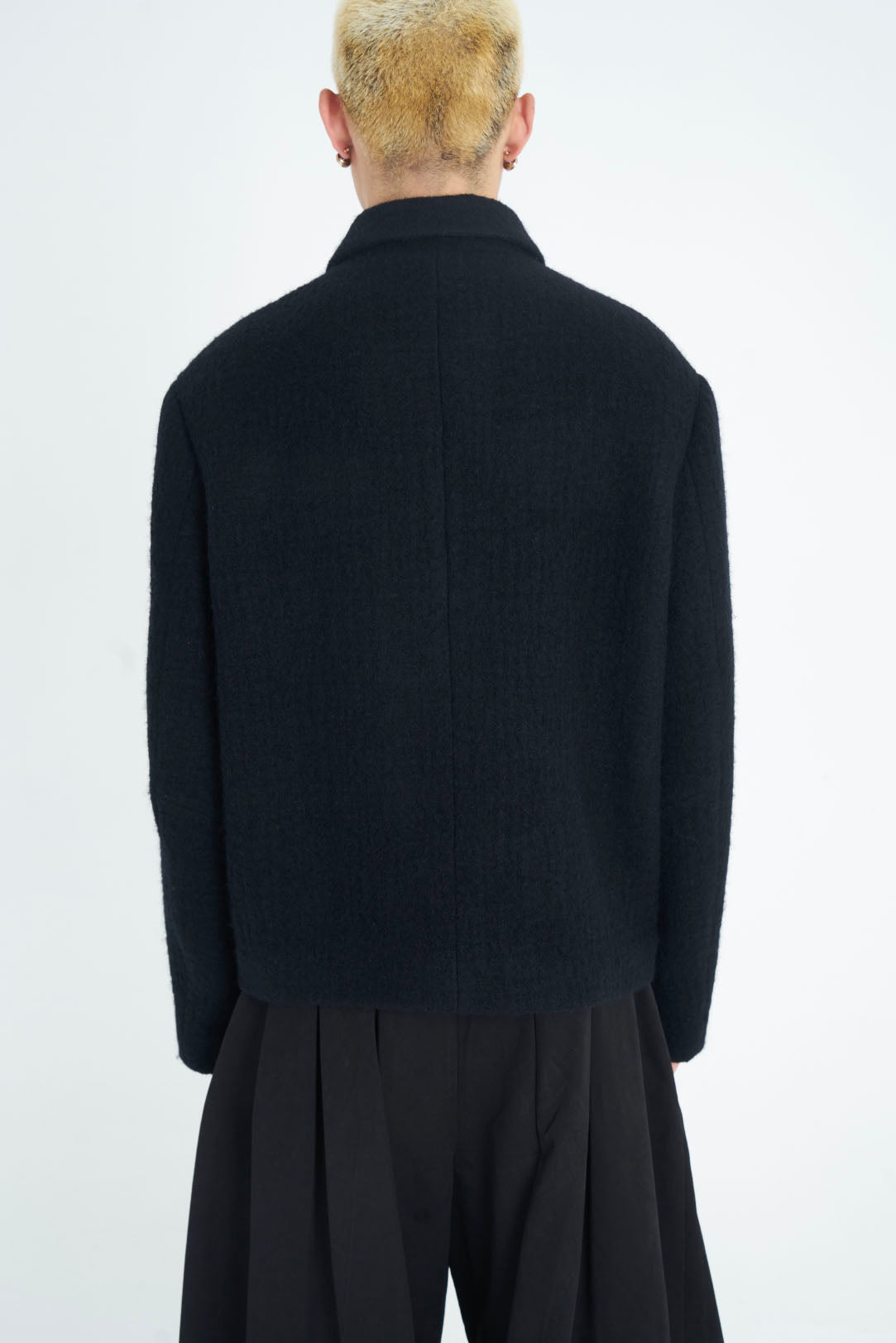 ATTEMPT reconstructs different styles and elements to create a new aesthetic system. By taking a more experimental approach to creation and production, which involves an understanding of the past and the current form of society, Attempt is creating an aesthetic form that is anchored in the present but different from it. It must ultimately be a product that cannot be defined as seen with the Wool Jacket Black.