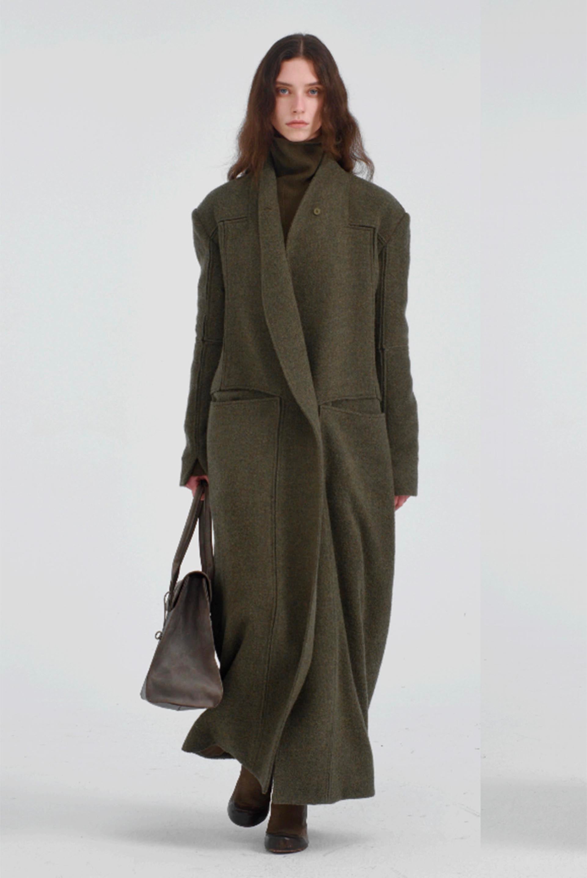 Yehuafan believes in feminine beauty with his own way to explain the smooth curve to compliment women’s body. He specialised in asymmetrical cutting and deconstructed silhouette as seen with the Wool Slik Coat Green.