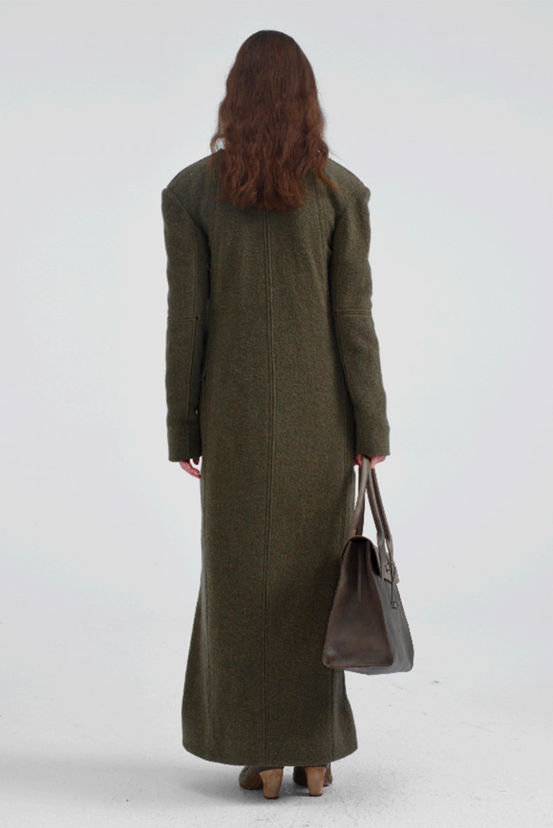 Yehuafan Wool Slik Coat in Green. Long sleeves. Button closure at front. High wrap around collar. Asymmetrical details throughout. Soft textural Silk and wool fabric. Long fit. Two side pocket. Long slit at back.