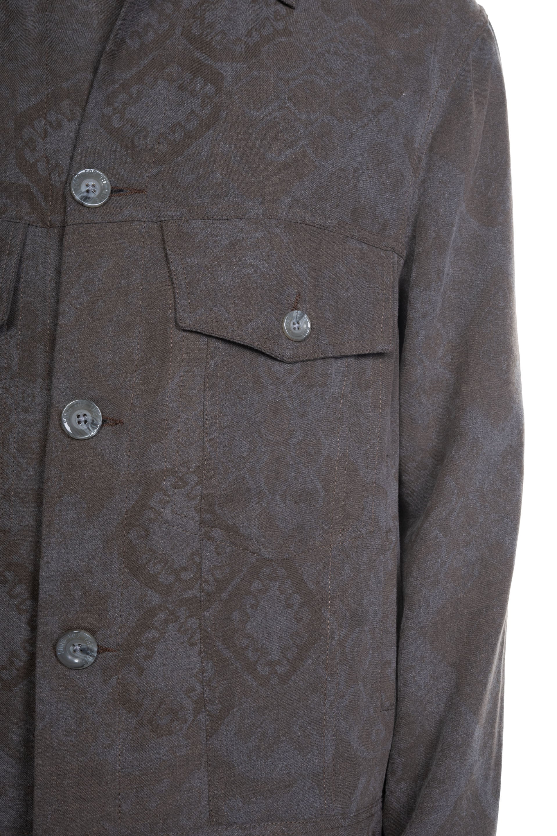 Song for the Mute classic workwear style jacket constructed in a lightweight and fluid viscose. Two side Pockets. Featuring flap pockets, flat-felled seam stitching at front, adjustable button cinching at back hem, and seasonal tortoise shell hardware.