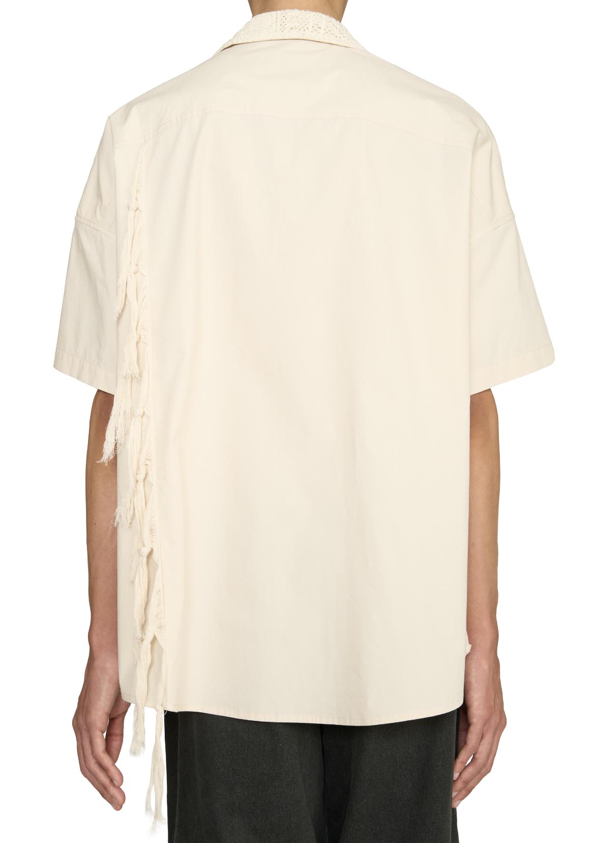 Semi-oversize short sleeve shirt with hand work fringed detailing at front and back bodice. Camp collar and a revealed tonal button closure.