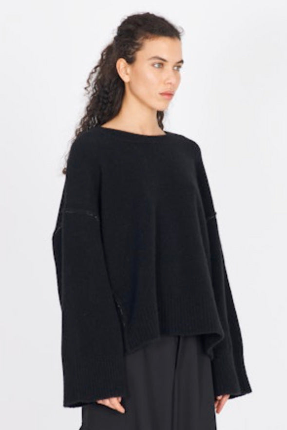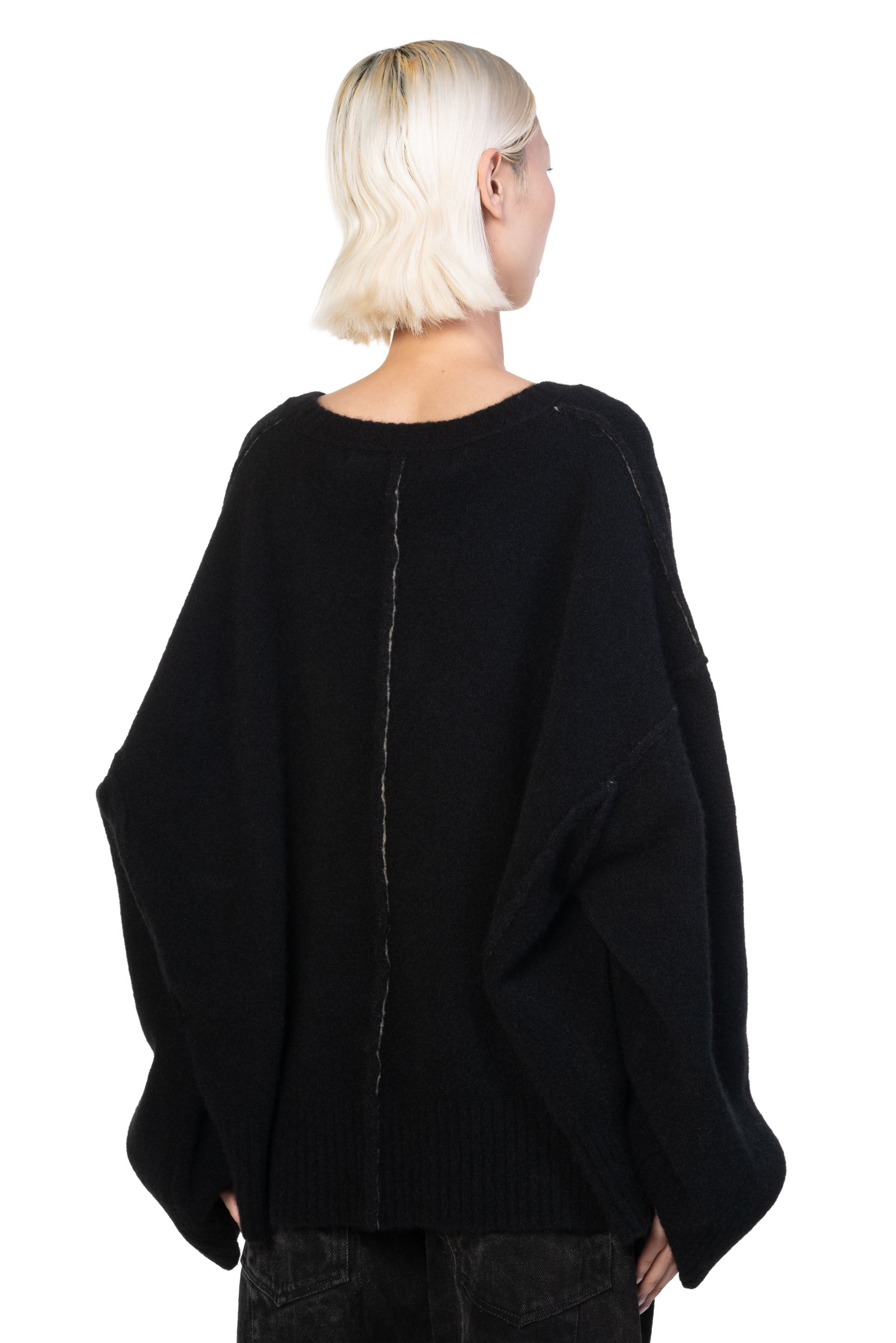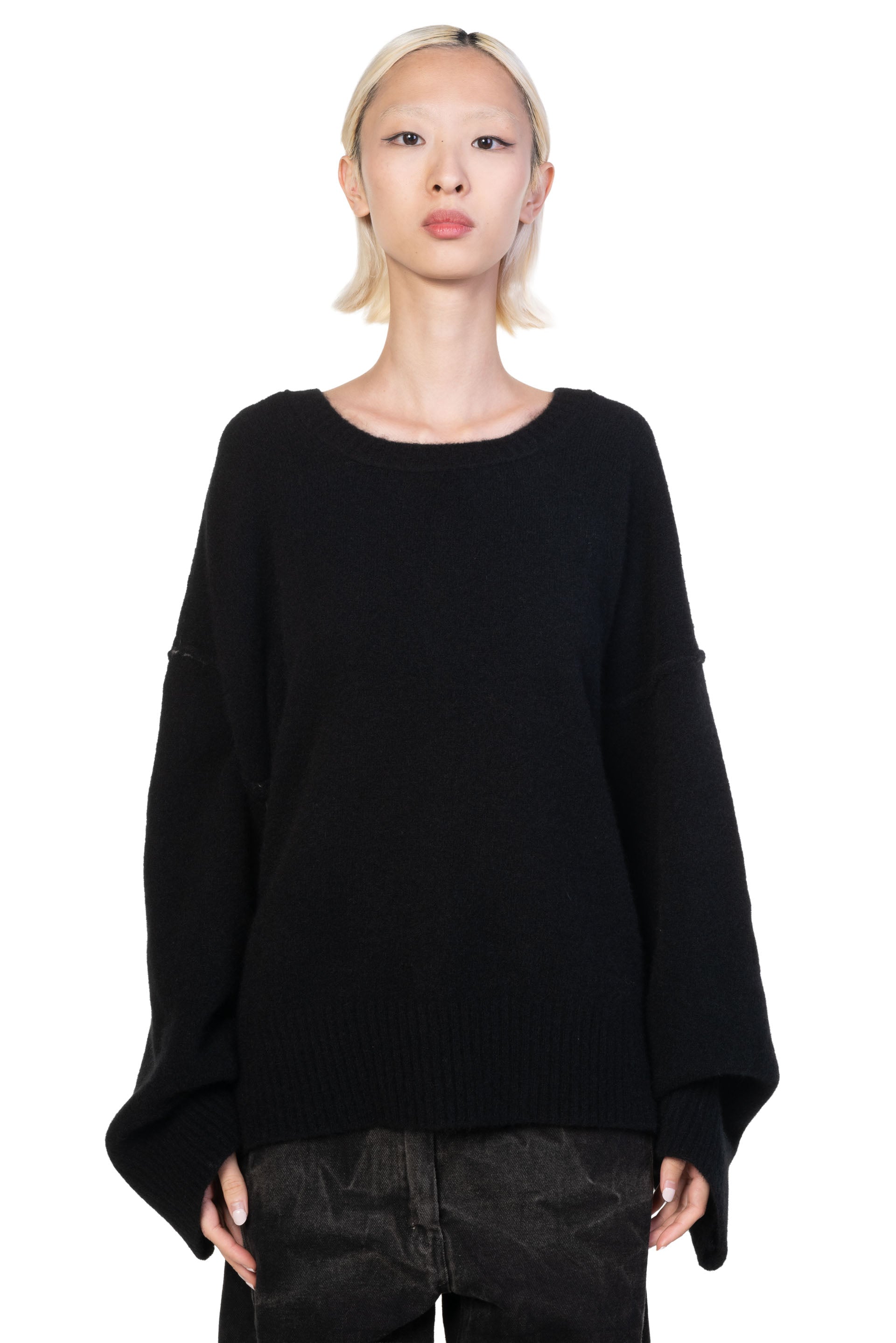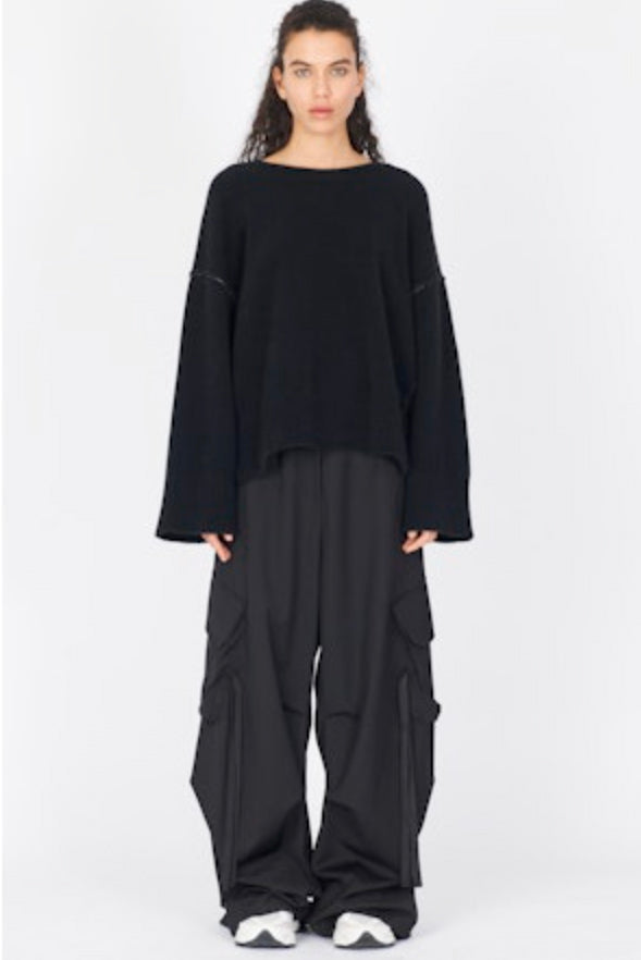 Isabel Benenato is committed to sustainability and makes every effort to minimise its environmental footprint. All of the collection are manufactured in Italy with the intention to save and support her local community. Her design is based on an imperfect perfection that encompasses the human being itself as seen with Yak Boxy Sweater Black.