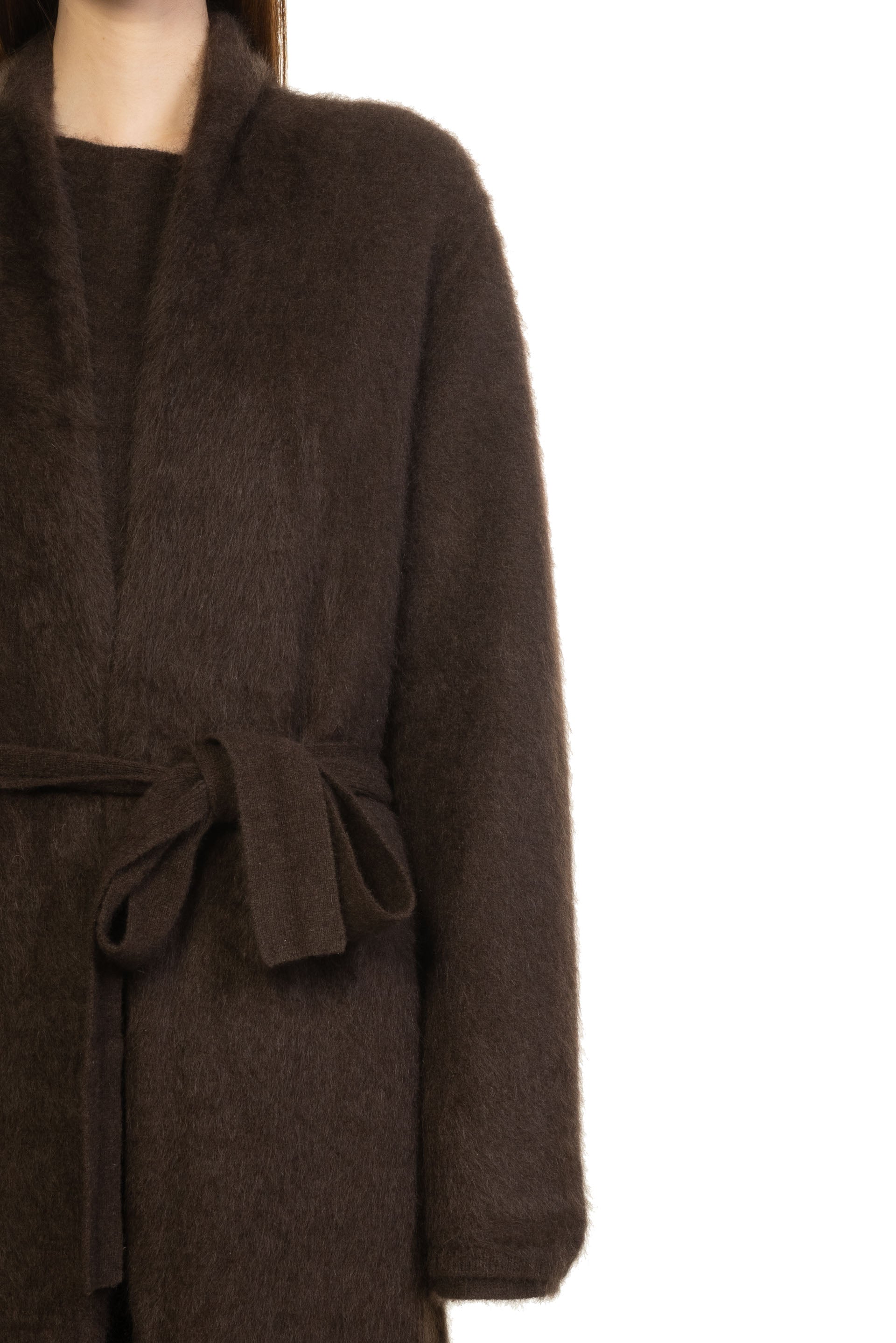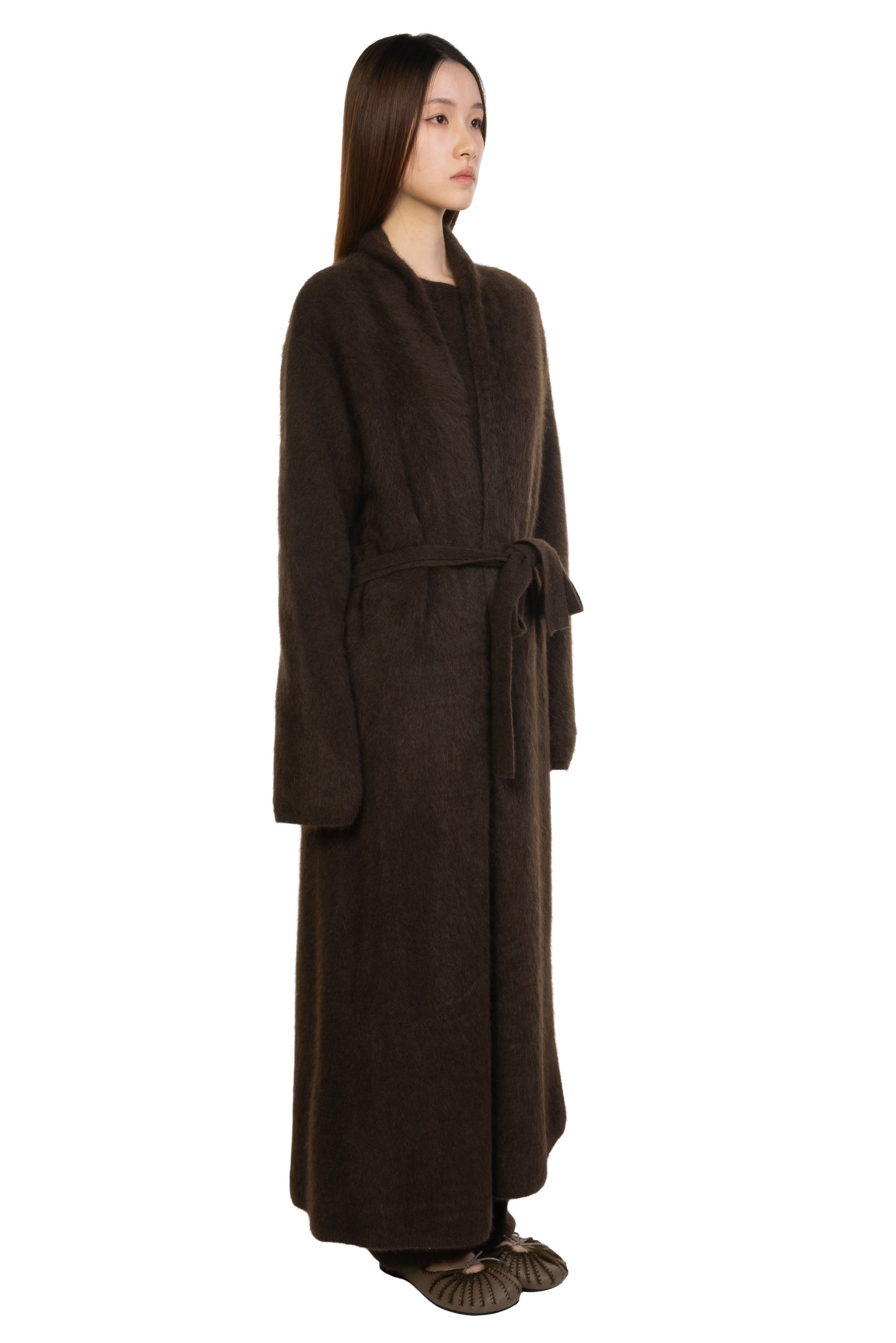 Swaying/knit Yak Brushed Long Cardigan in Dark Brown. Long sleeves. Rope style cardigan with belt. Relaxed fit with slightly dropped shoulders. Soft yak fabric.