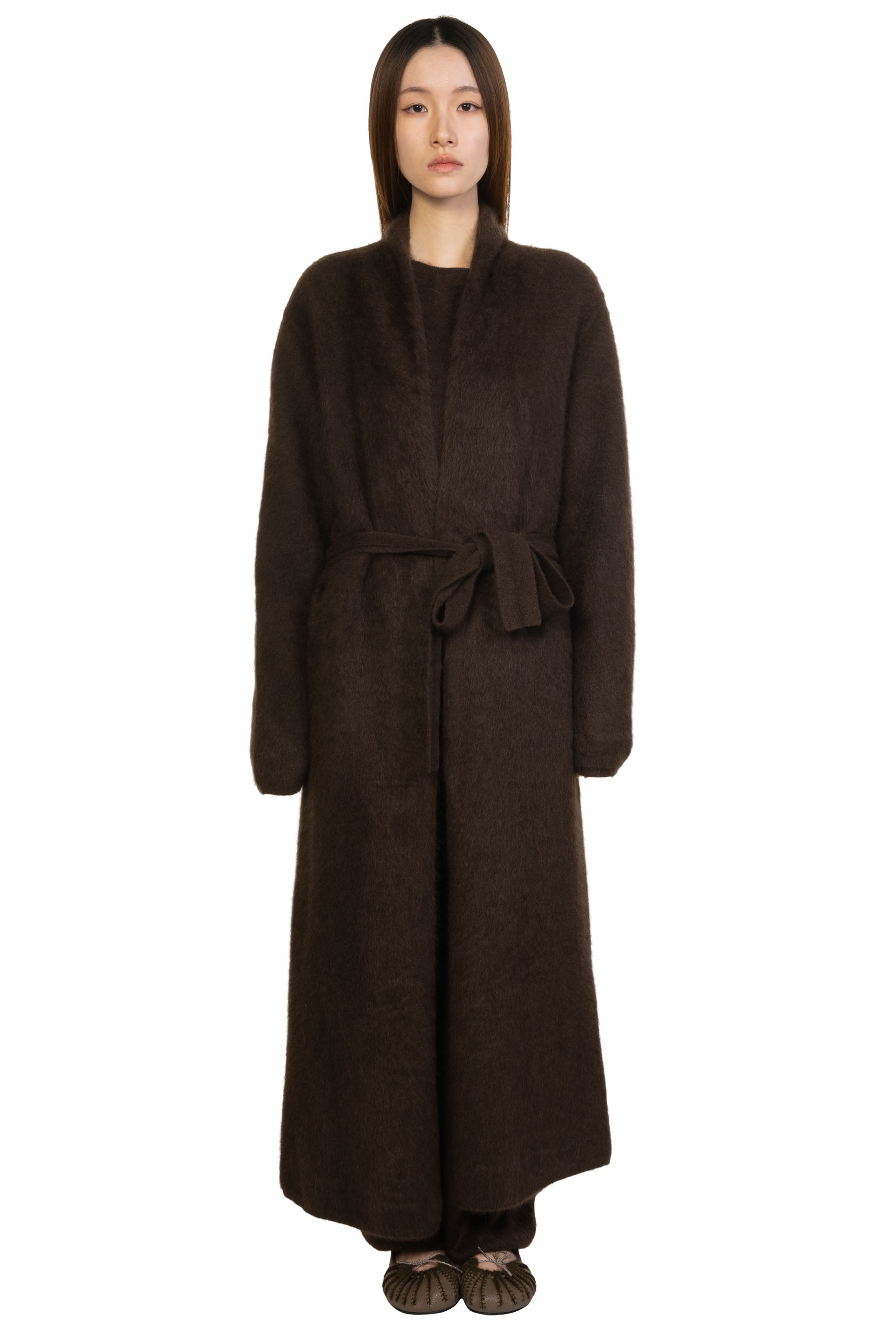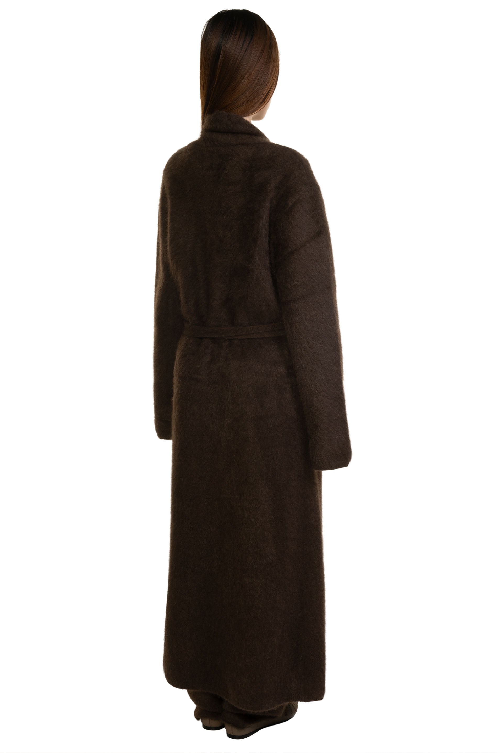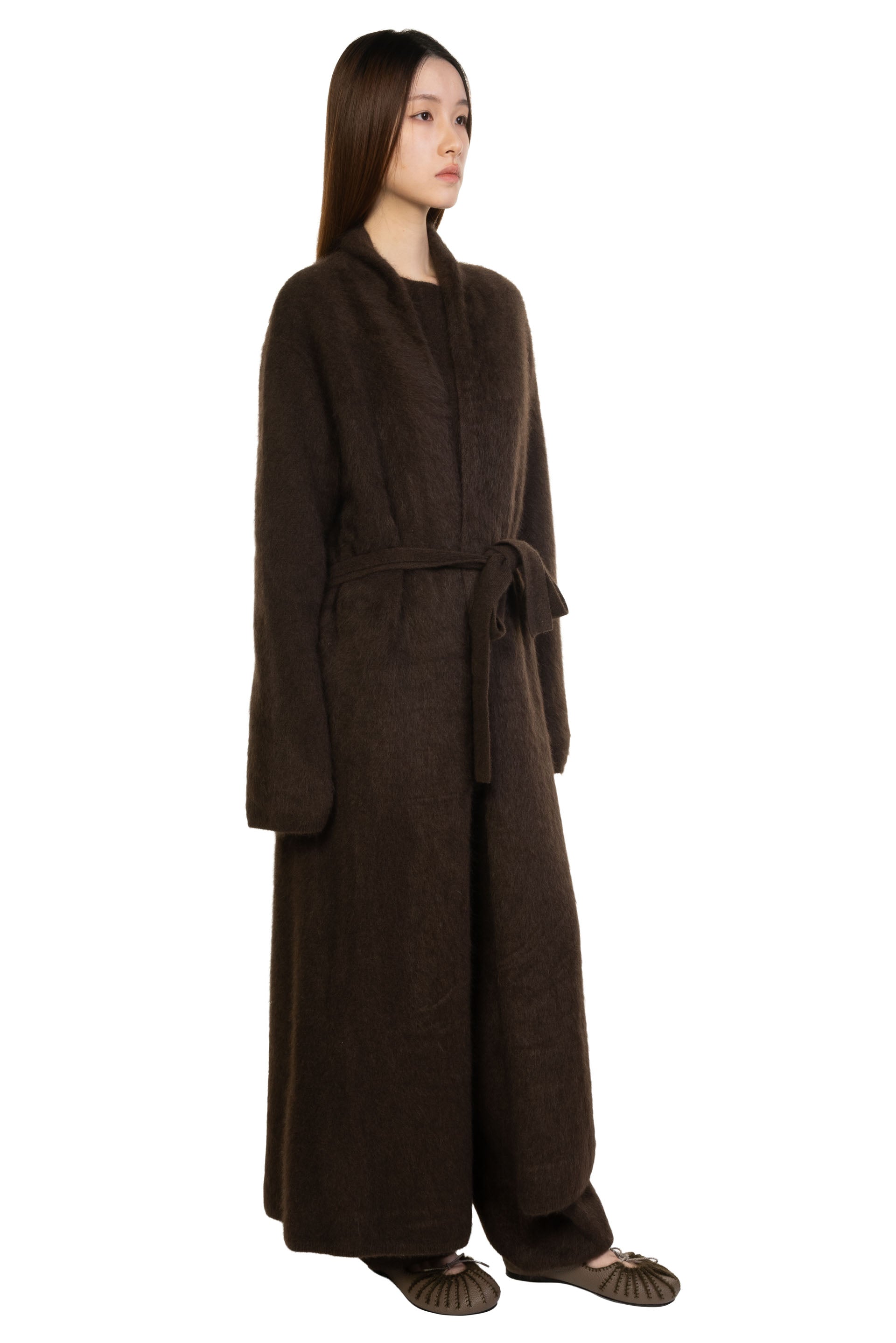 Swaying redefines modern knitwear by fusing artisanal craftsmanship with contemporary design. Through innovative textures, intricate yarn play, and hybrid weaving techniques, each piece balances softness and strength. Sourcing premium European and Japanese materials, Swaying/Knit ensures a luxurious hand feel while embracing sustainable fashion. With delicate details and timeless sophistication, the brand delivers elevated, wearable art for the discerning, fashion-forward wardrobe as seen with the Yak Brushed Long Cardigan Dark Brown.